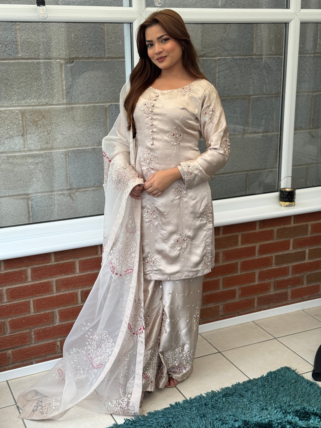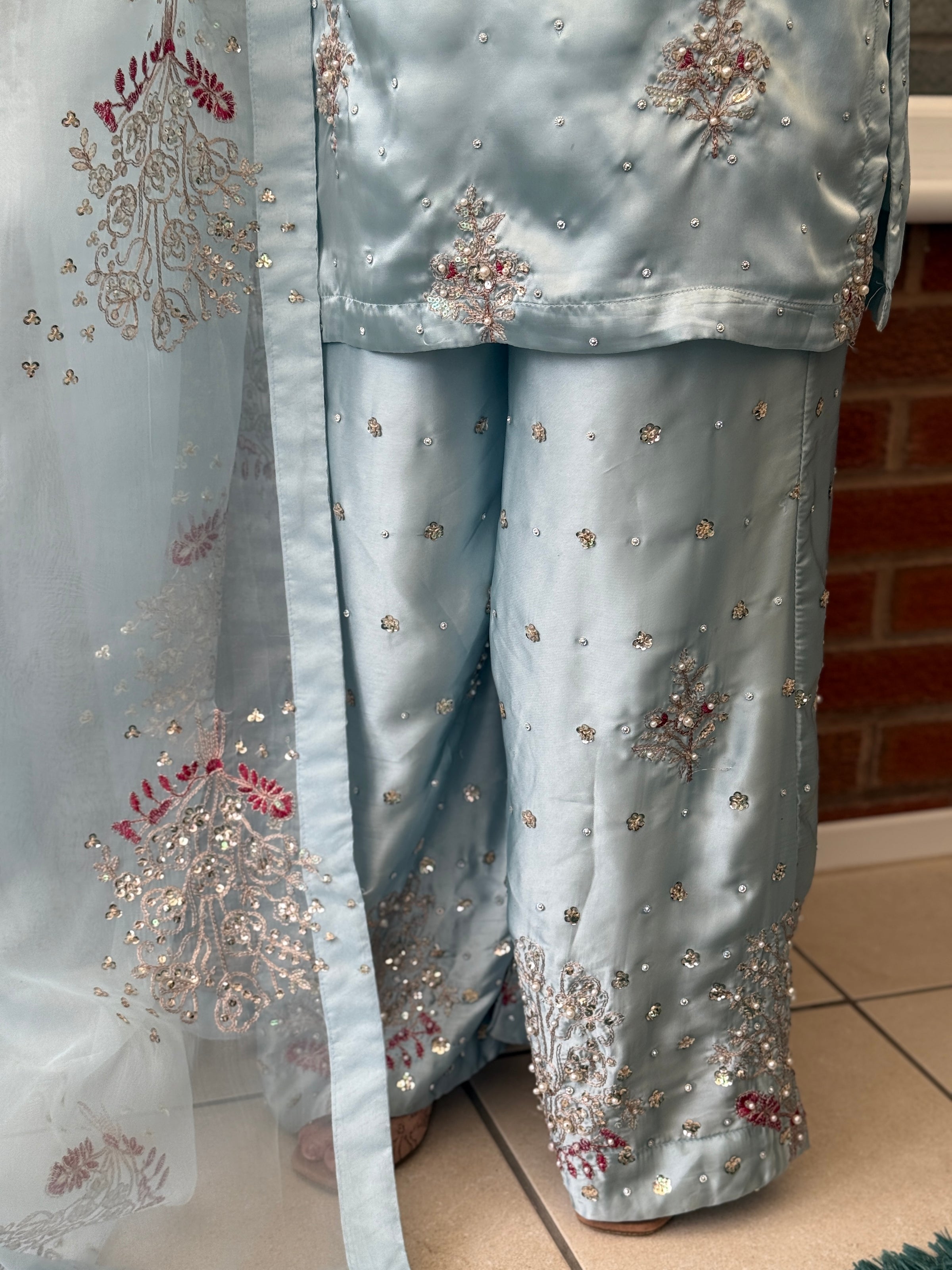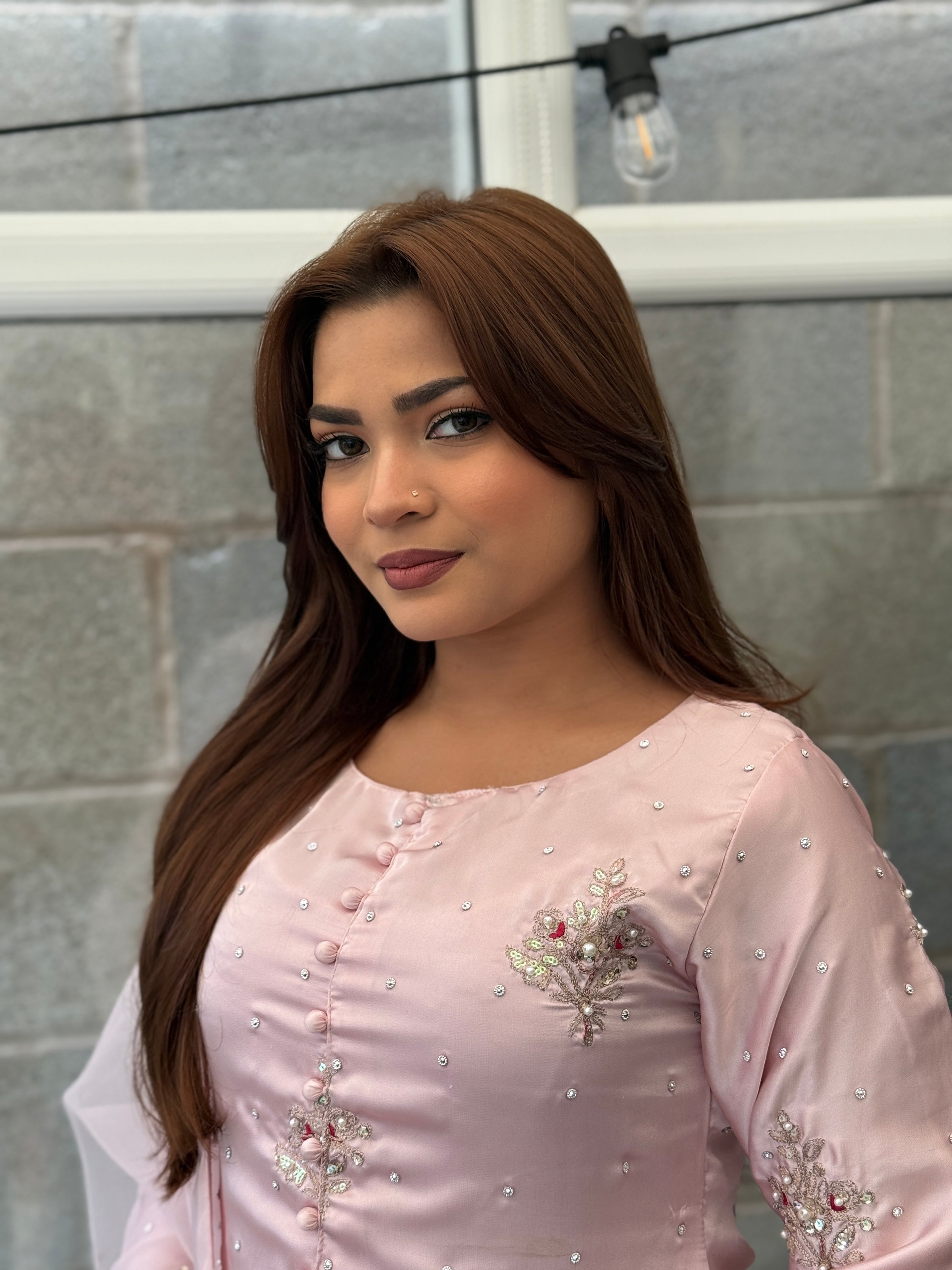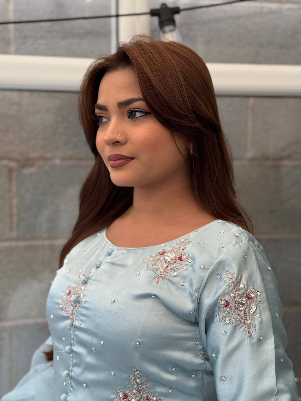 A vision of serenity and elegance, Celeste Bloom is crafted from luxurious chamoise silk, delicately hand-embellished with pearls and threadwork. The sky-blue hue paired with a beautifully embroidered organza dupatta creates a look that’s both refined and radiant — perfect for evening occasions, mehndi dinners, or festive celebrations.