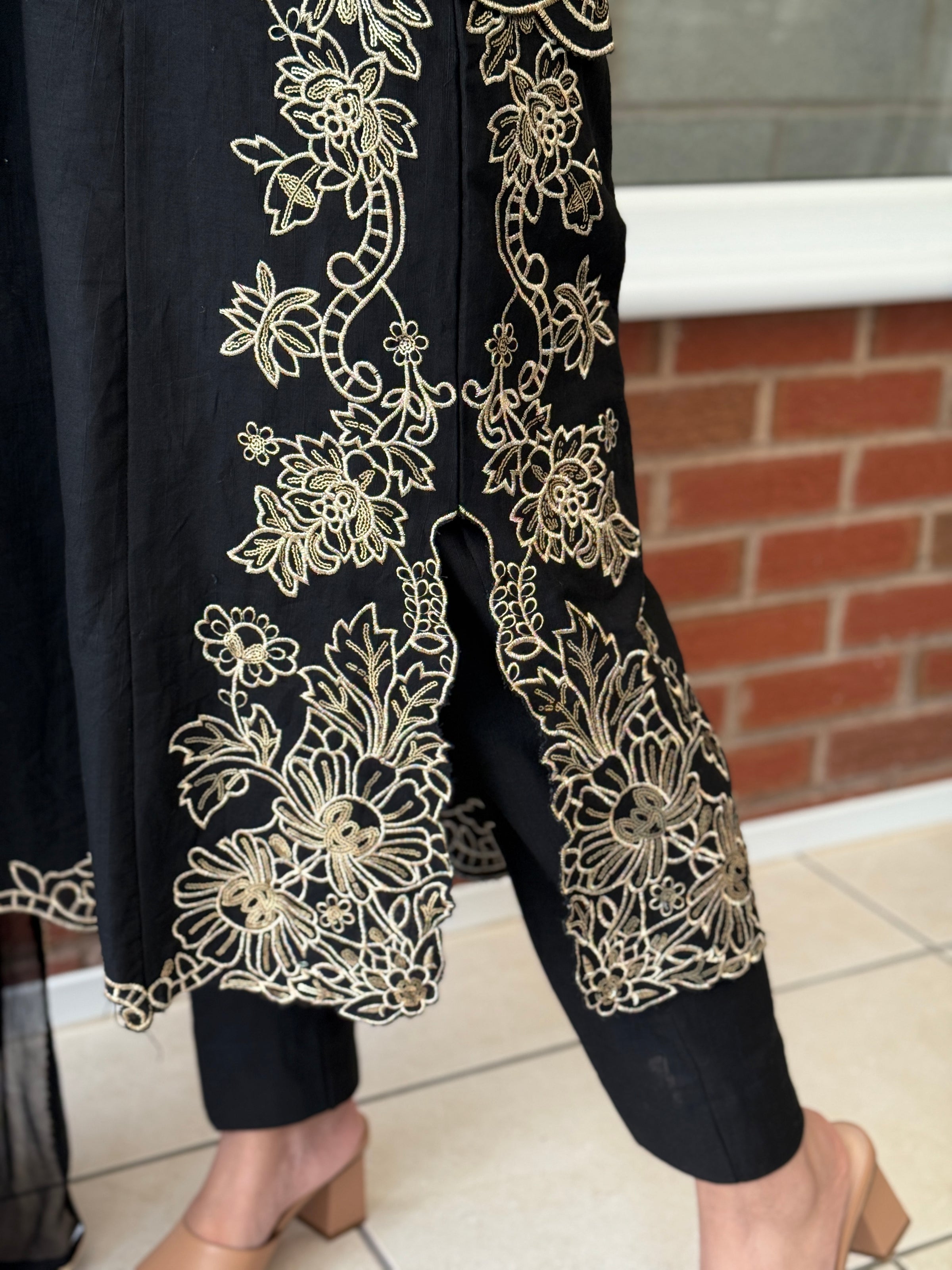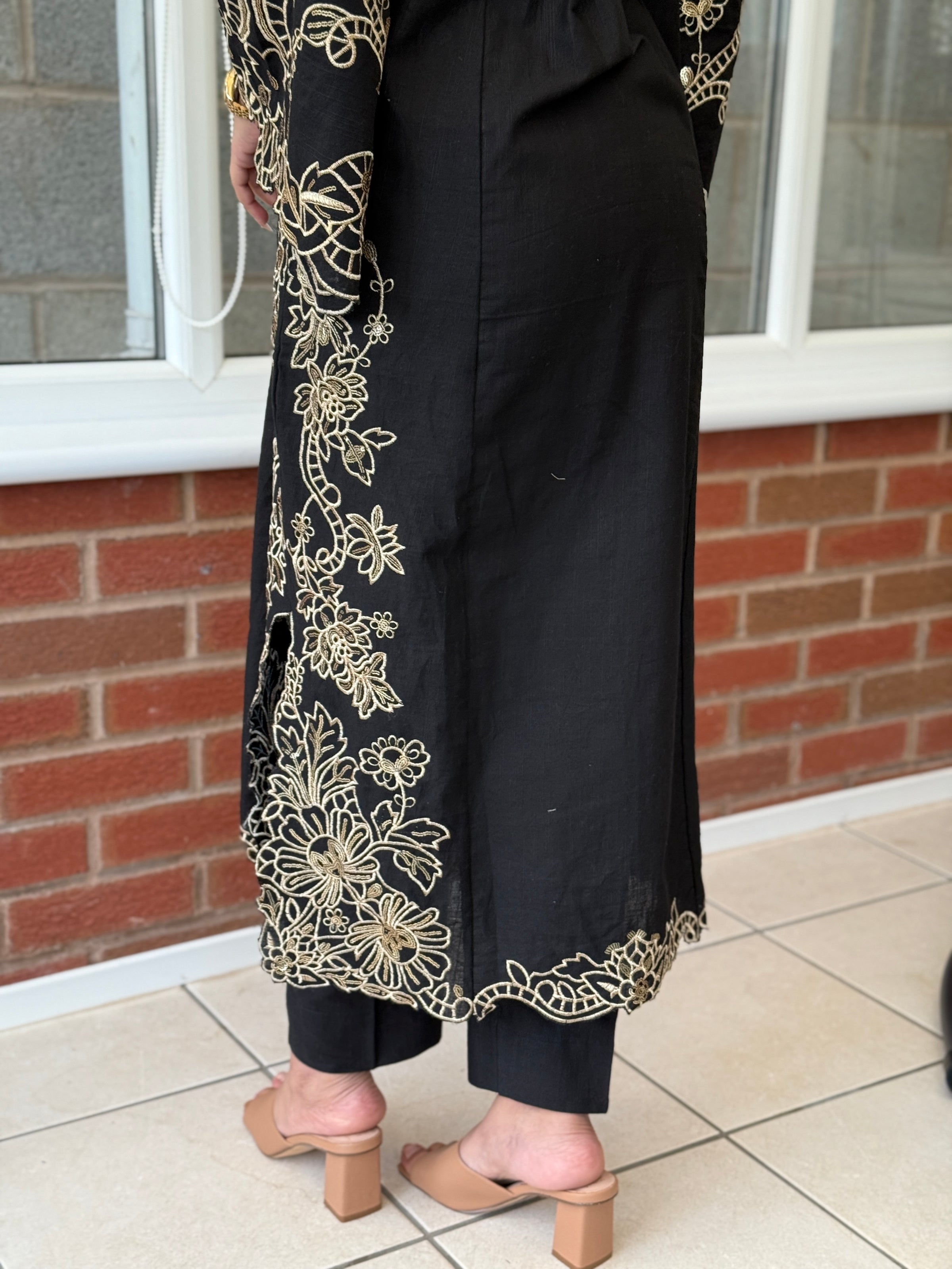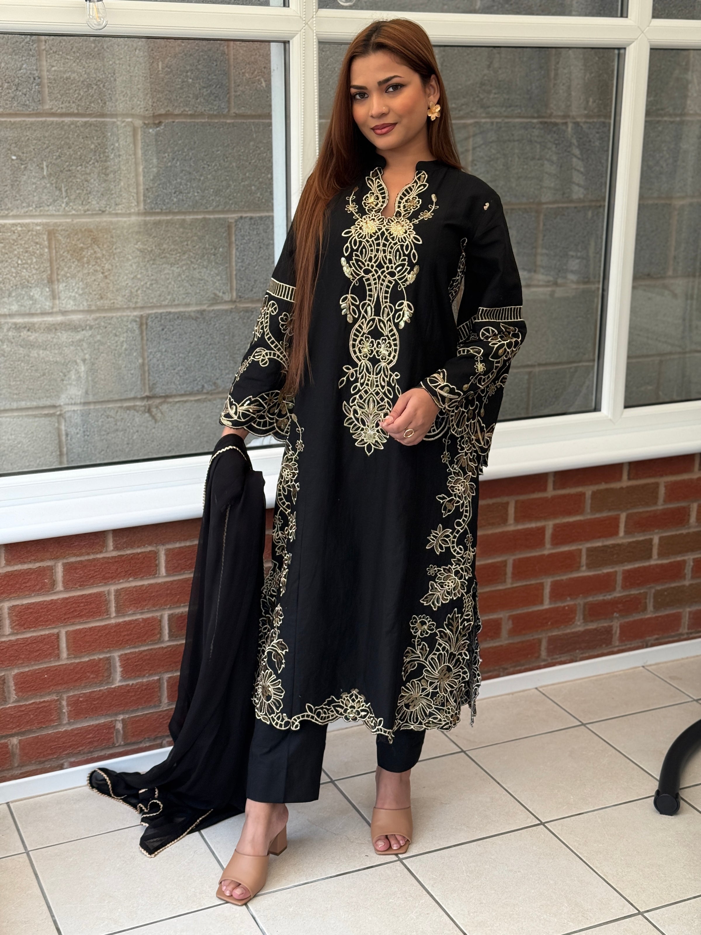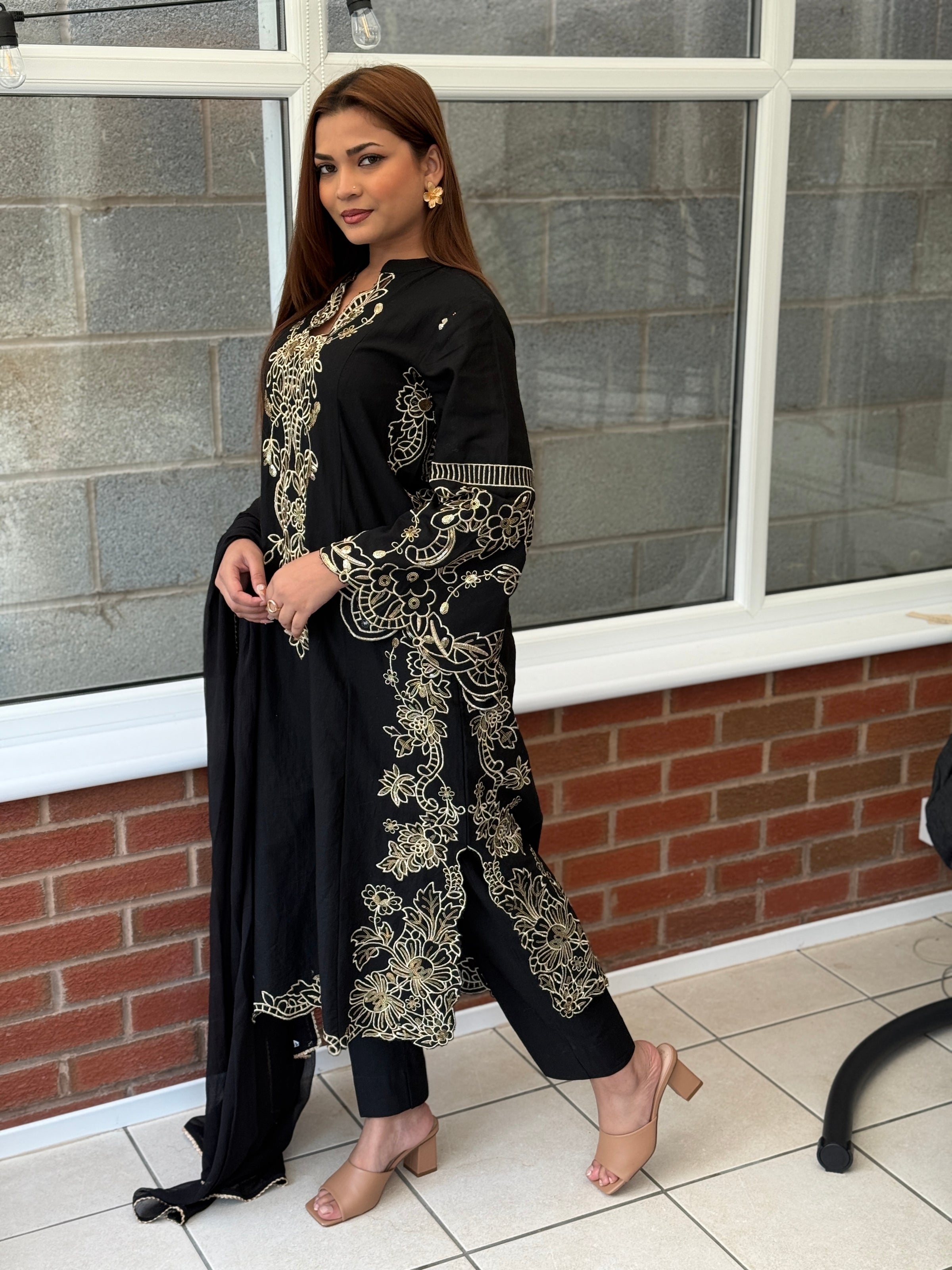 Aurum Grace is a timeless three-piece Khaddar suit that captures the essence of understated luxury. Designed in a rich dark hue, it features exquisite gold embroidery cascading across the neckline, sleeves, and borders, creating a soft, kaftan-inspired silhouette with short chawks for a graceful fall. Paired with sleek trousers and a lightweight chiffon dupatta, this ensemble is an effortless statement of poise and sophistication — perfect for evening wear or festive occasions. ✨