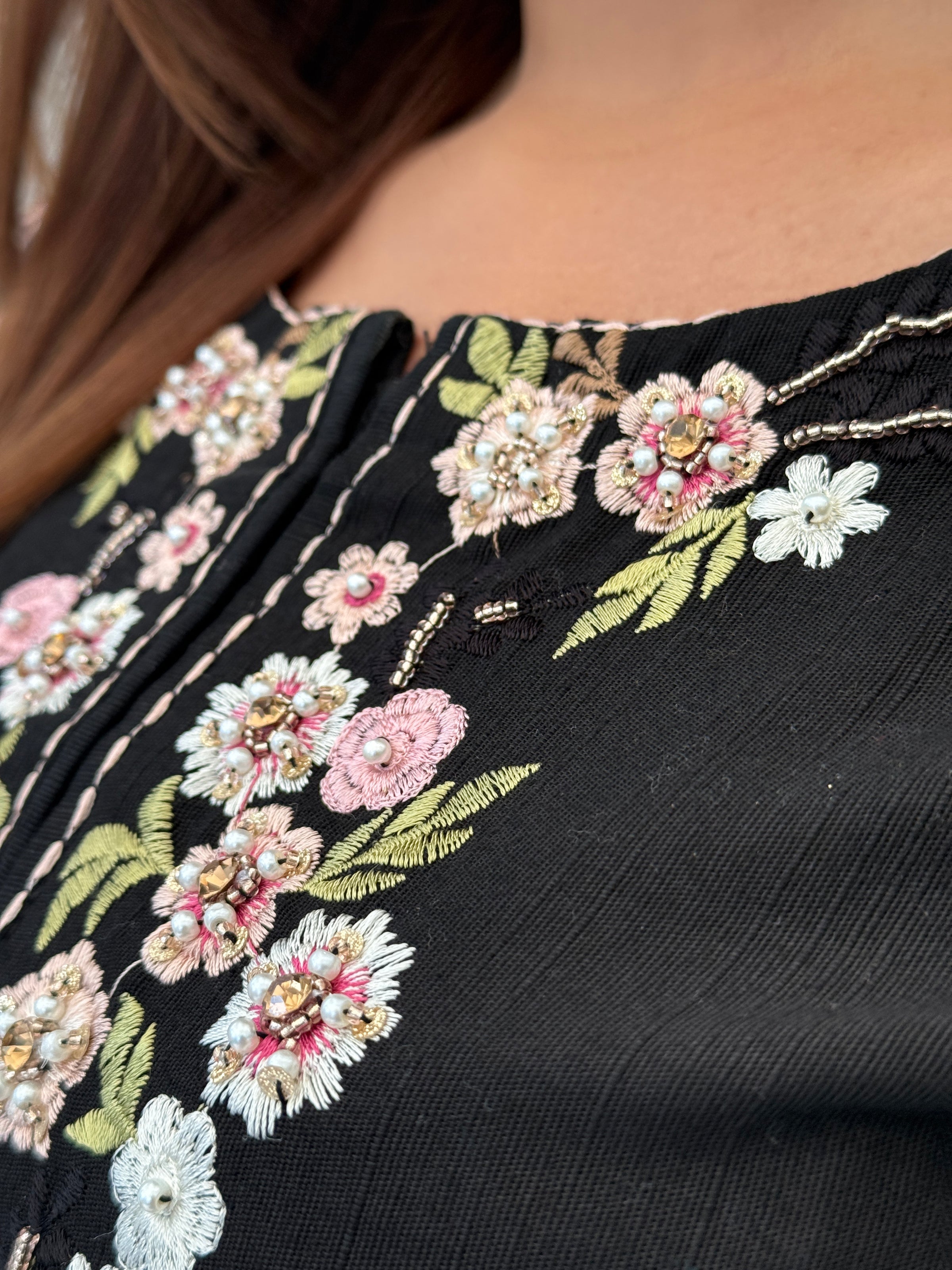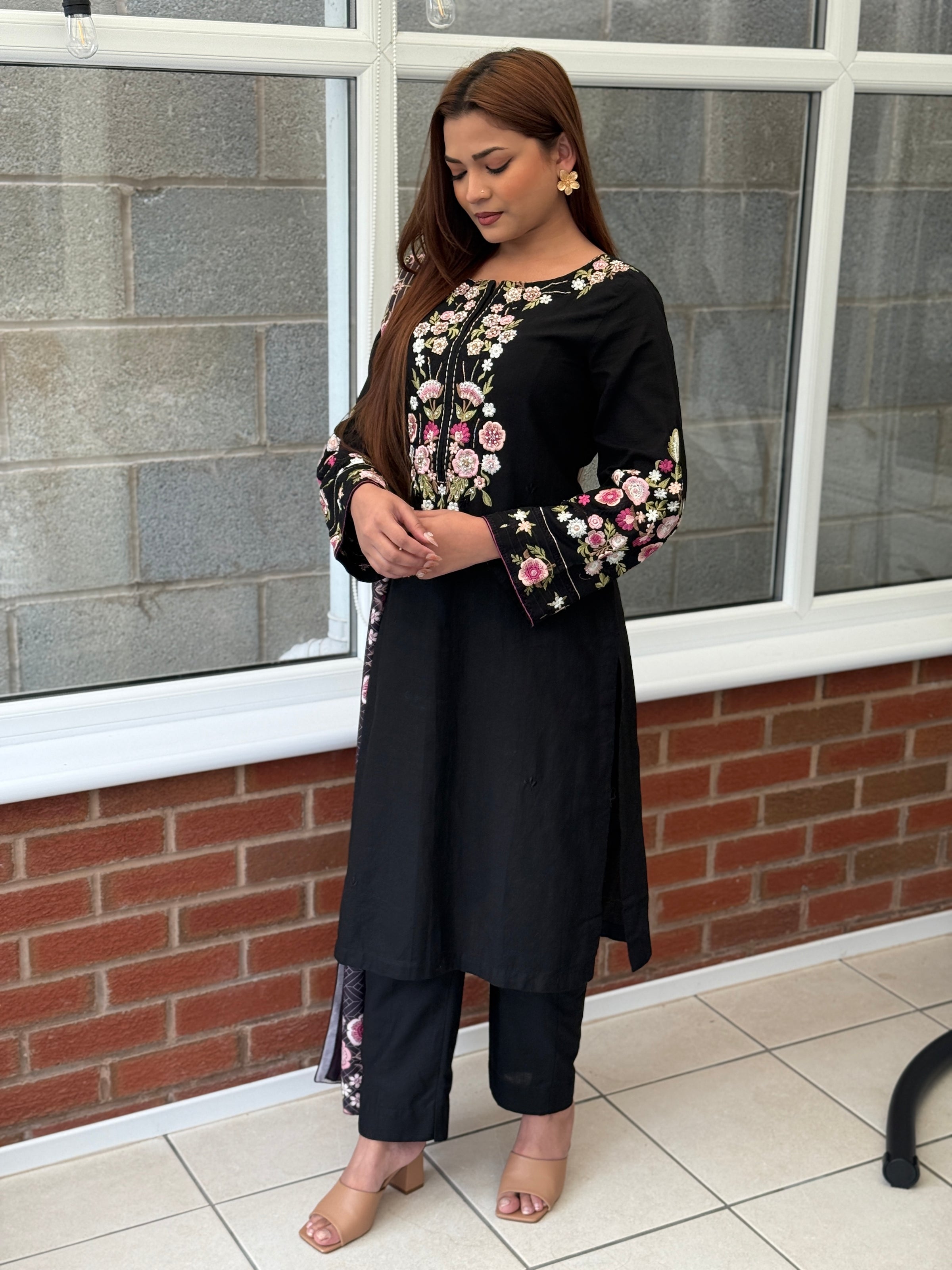 Elegant and effortlessly timeless, Zariya Noir is crafted from premium Khaddar fabric — a winter essential that exudes warmth and sophistication. The jet-black canvas is beautifully elevated with intricate floral embroidery in soft rose and ivory tones, creating a look that’s both classic and feminine. Paired with straight trousers and a Khadi Net Dupatta, this three-piece ensemble is perfect for refined gatherings or chic everyday wear. Also available in nude colour