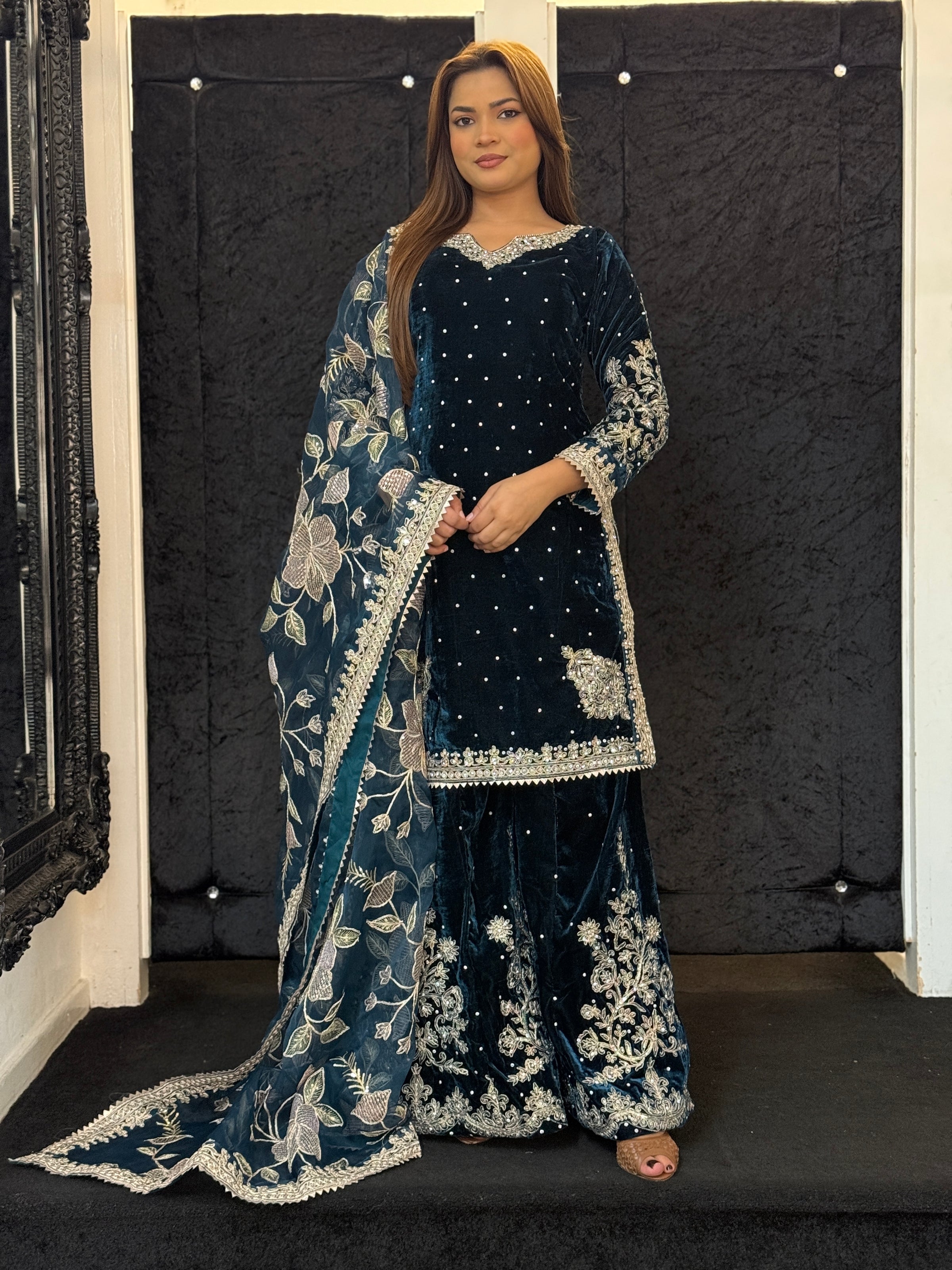 A rich teal velvet suit adorned with silver embroidery and delicate pearl handwork. The V-neck shirt, ornate flared trousers and beautifully finished velvet dupatta create an effortless winter-party statement.
