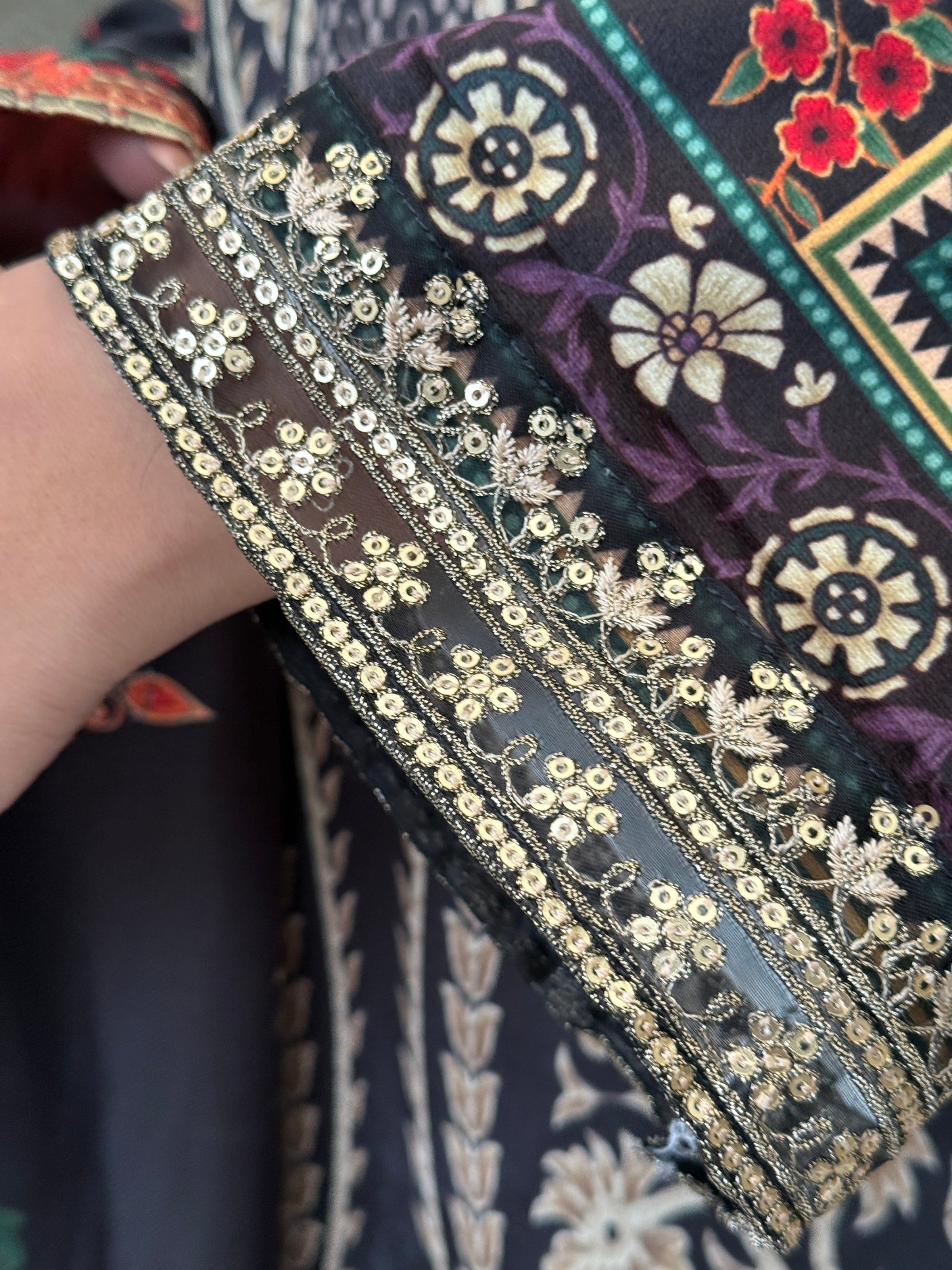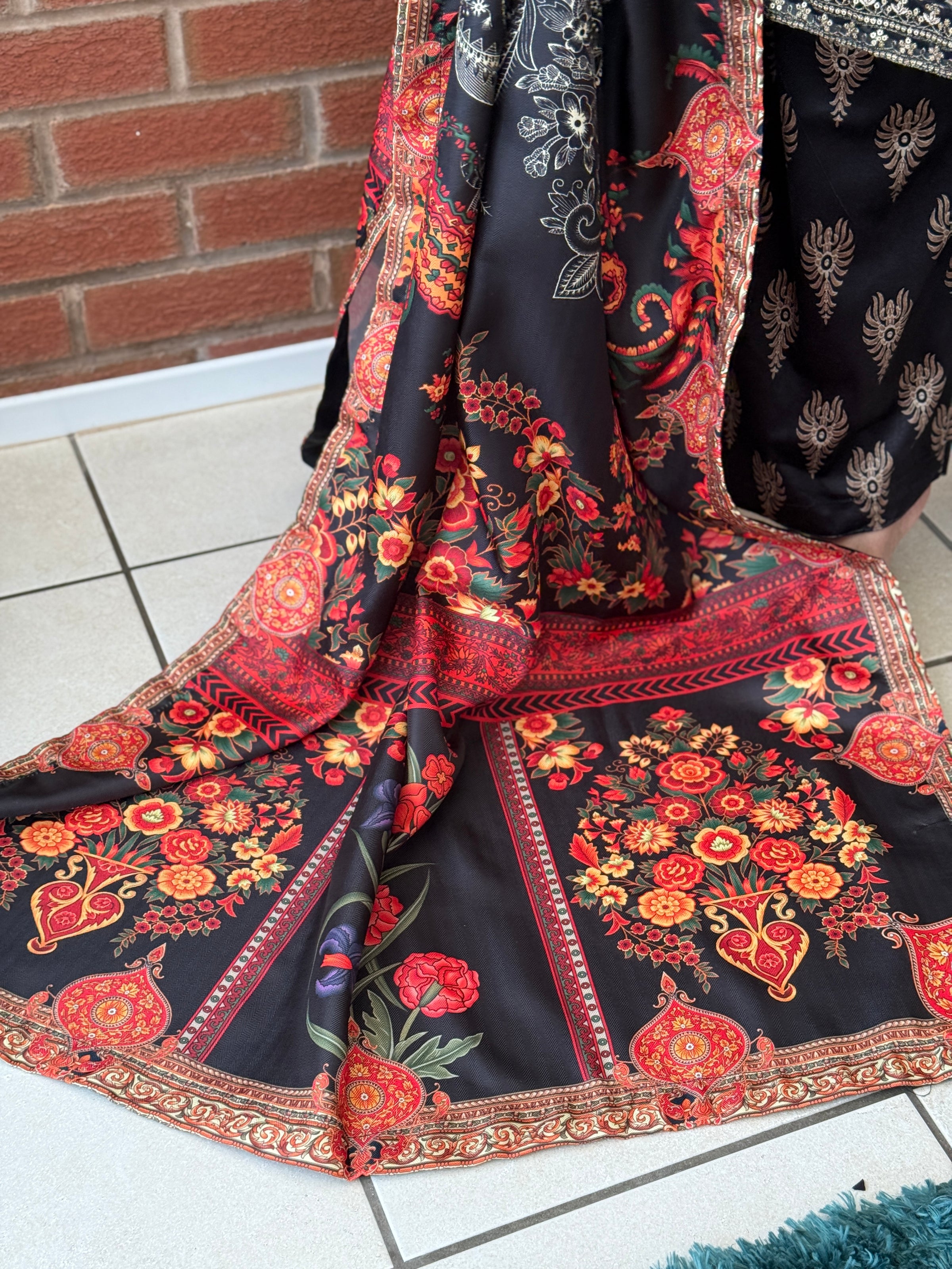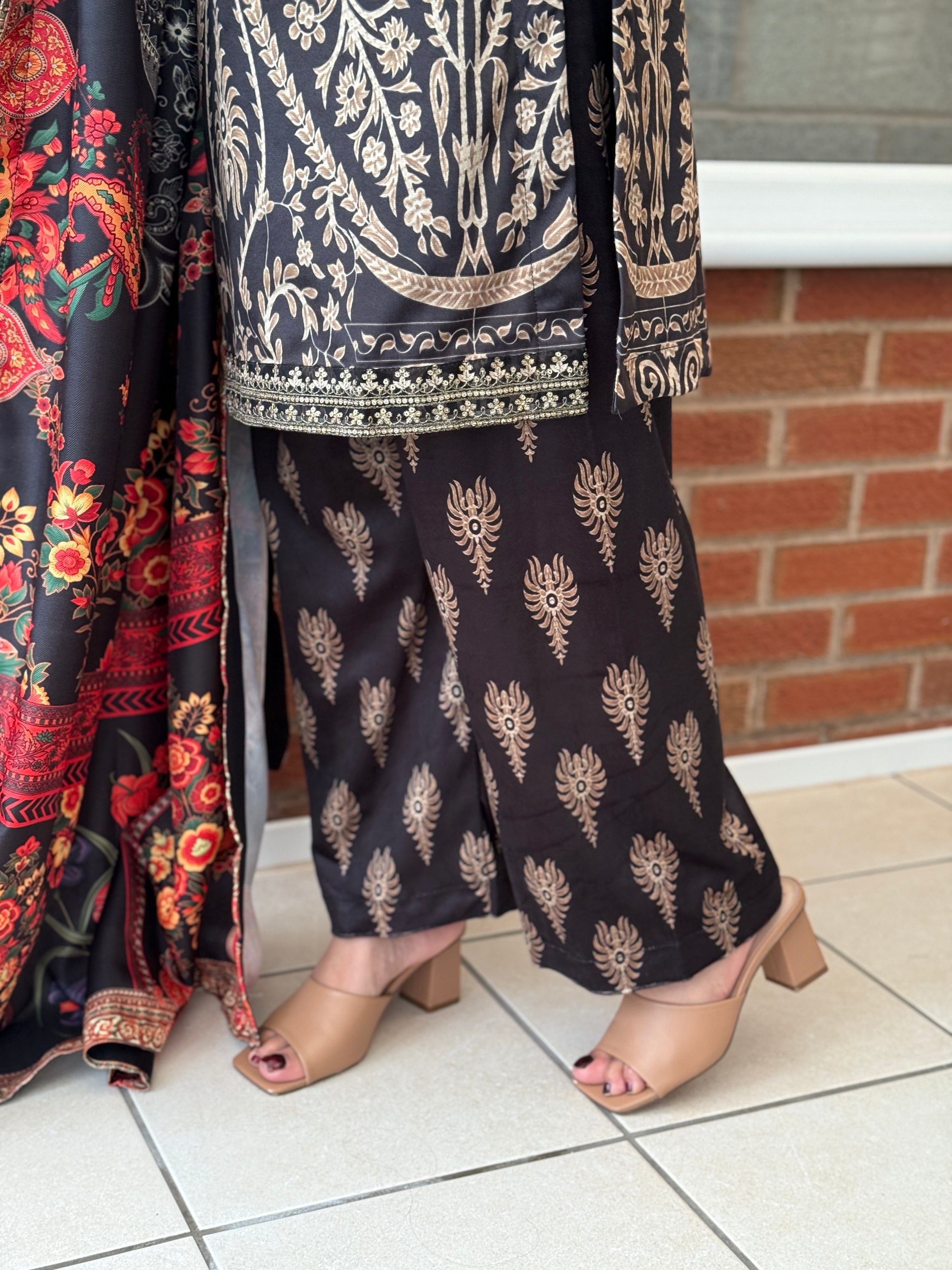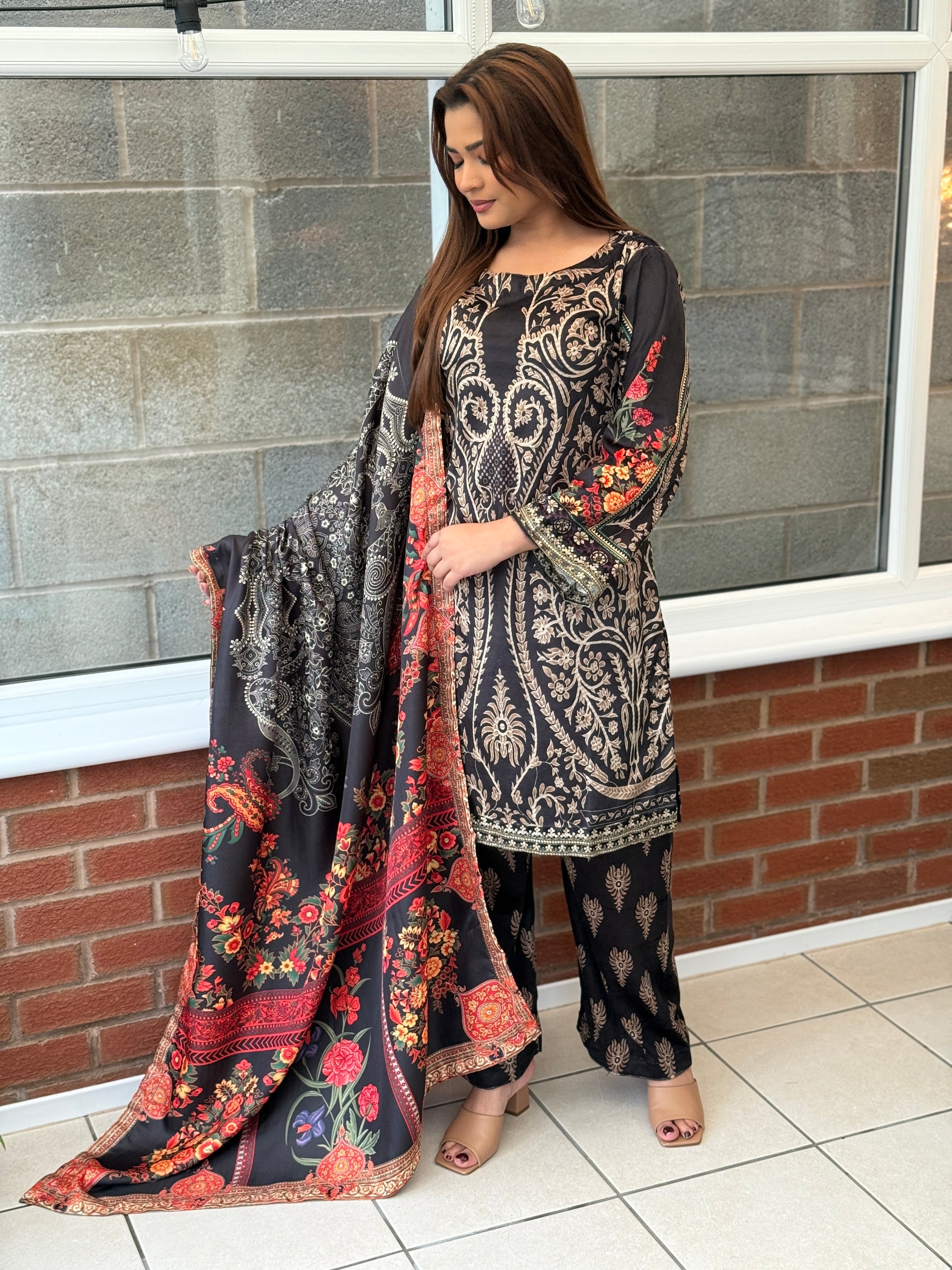 Royale is a luxurious winter velvet ensemble crafted in the same premium fabric as our bestselling line. The shirt showcases detailed baroque-inspired work with ornate sleeves, paired with wide-leg velvet trousers in a coordinated motif. Its printed winter shawl adds depth with rich florals and warm tones. A refined, elegant choice for winter gatherings and evening wear.