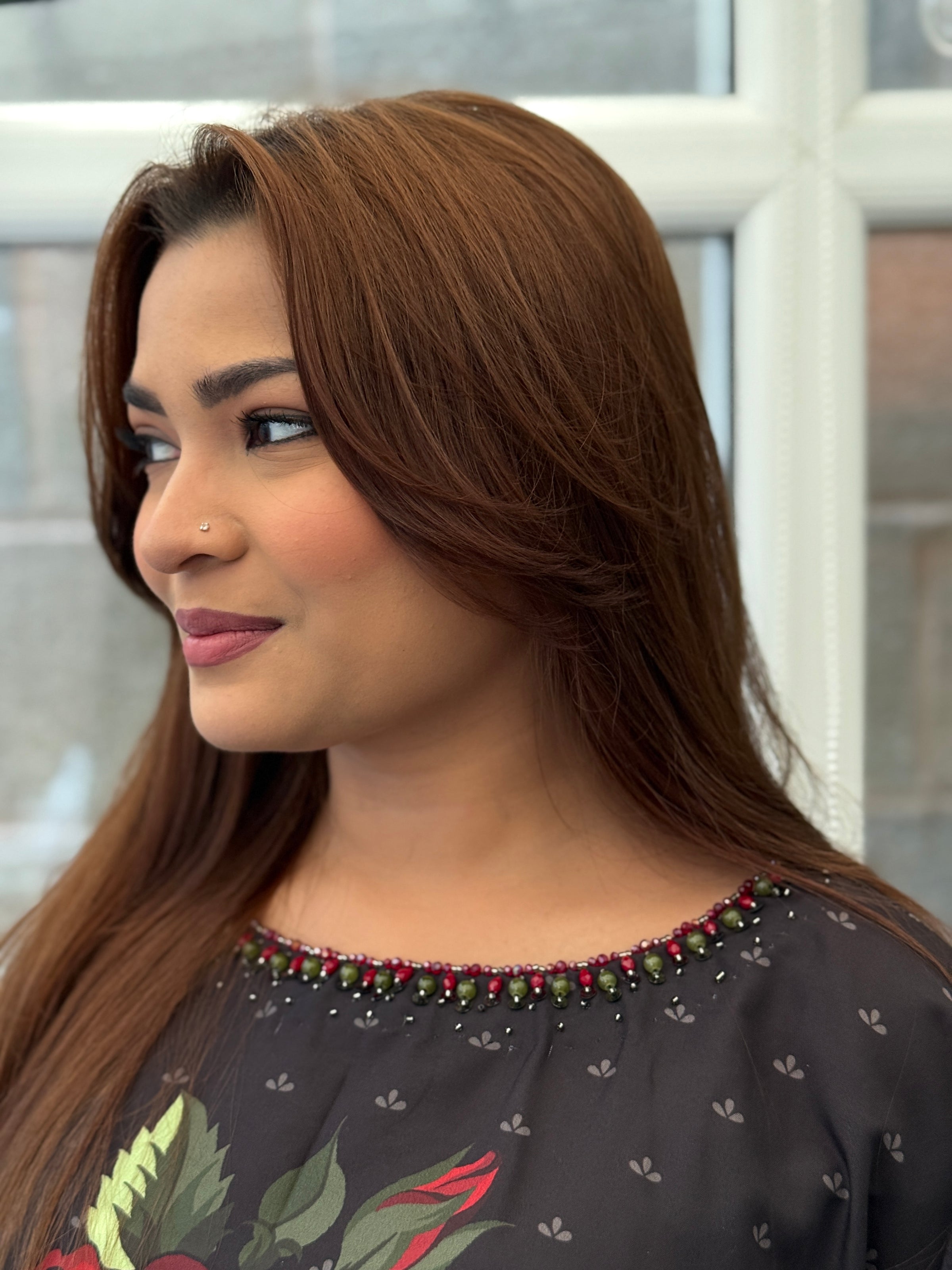 A luxurious free-size kaftan crafted in soft, flowy silk, designed for effortless elegance. The Amarna Silk Kaftan features a bold red rose motif on a deep charcoal base, with beautifully printed statement sleeves that create instant impact.
