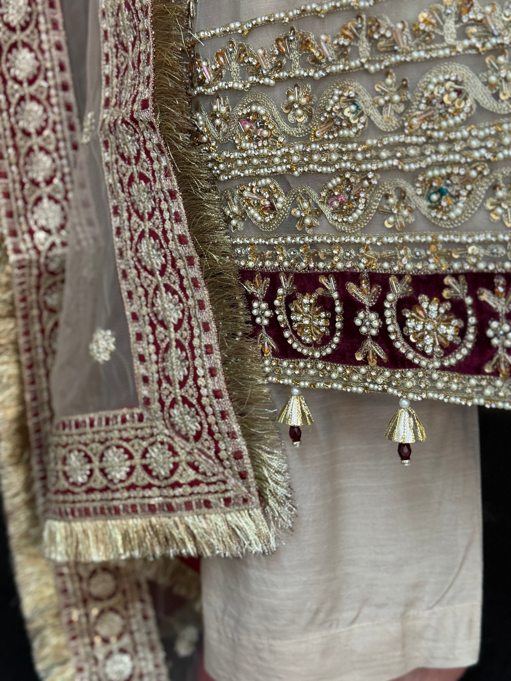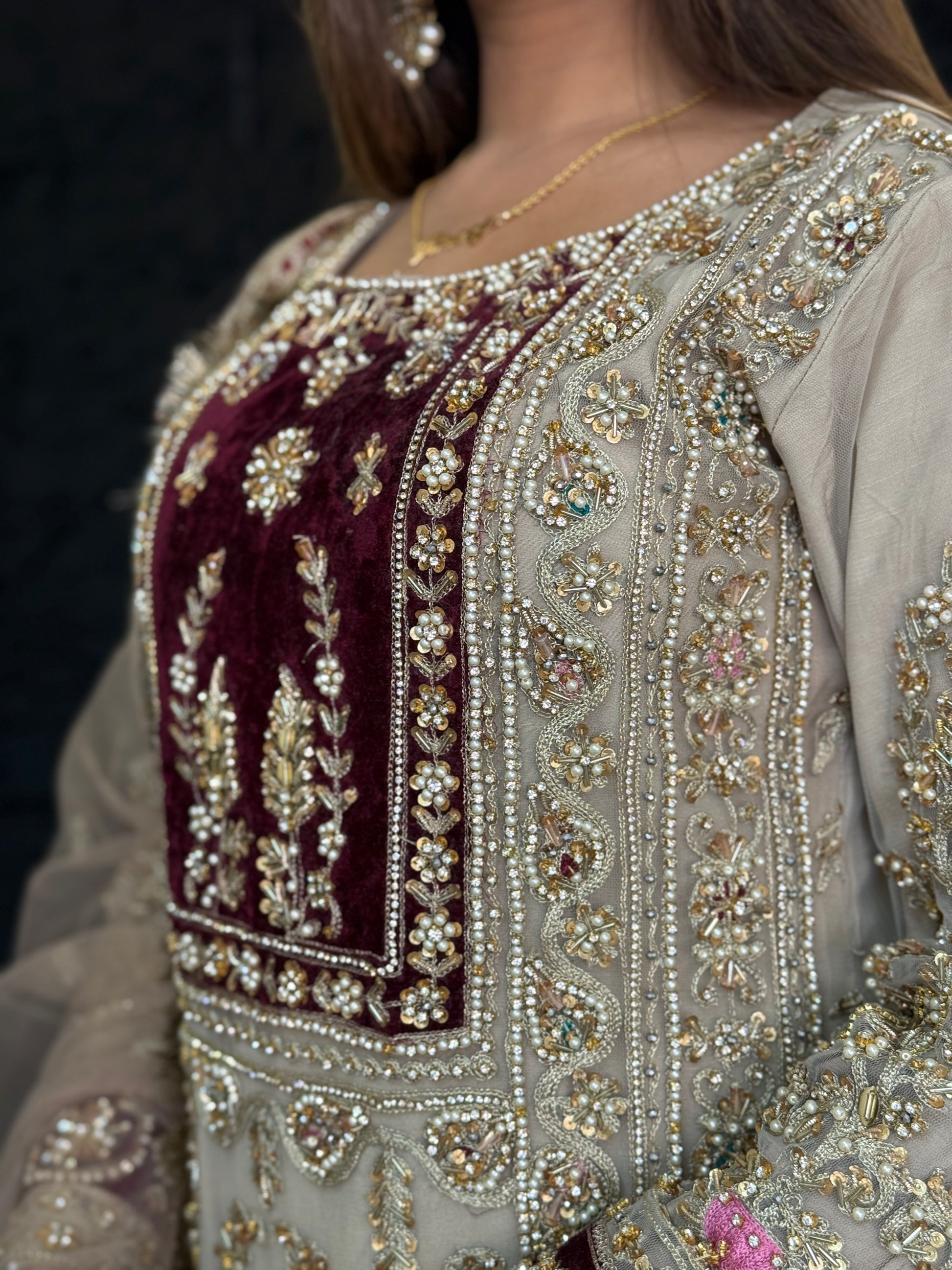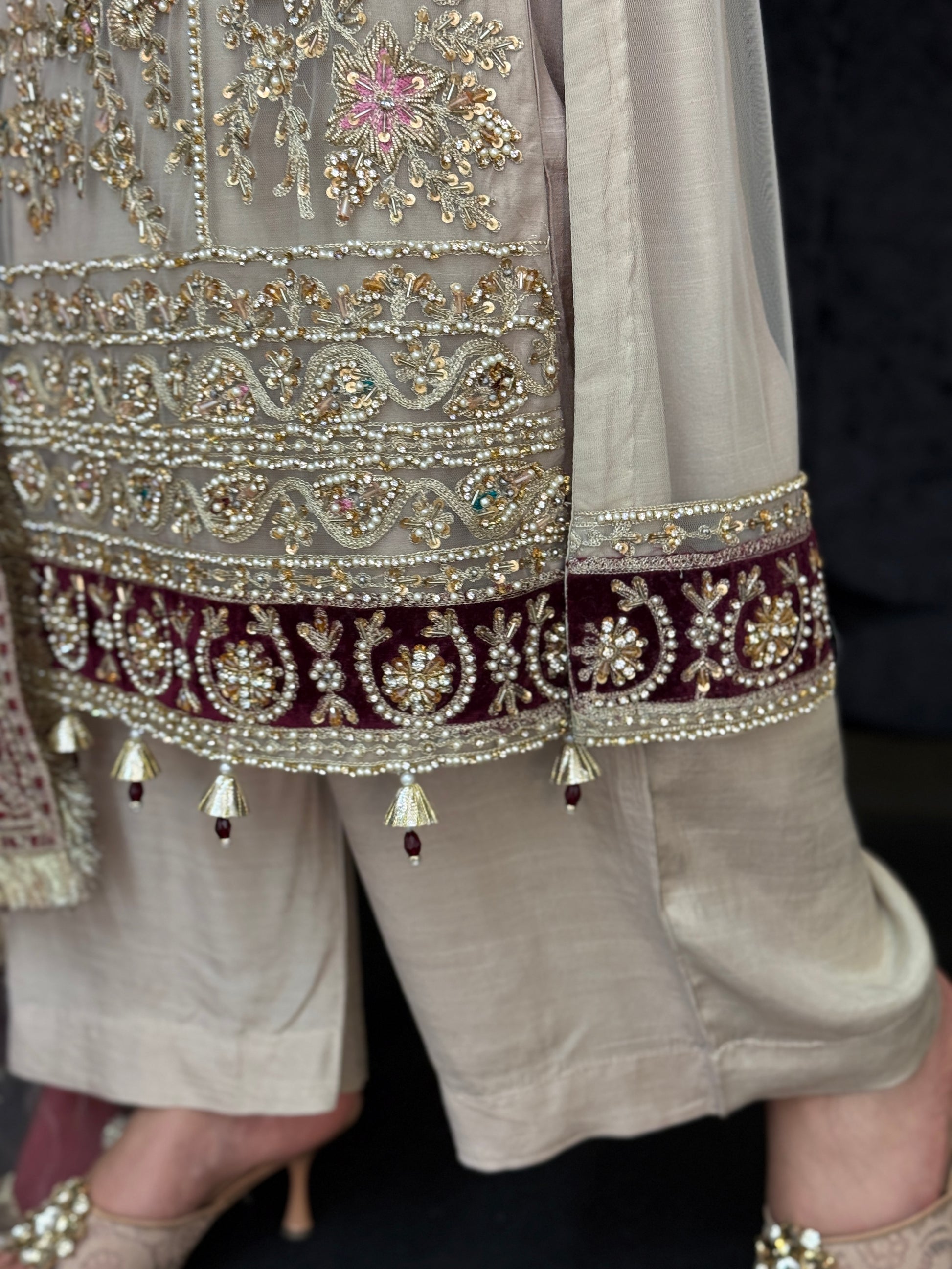 A intricately embroidered outfit with full hand embellished shirt using pearls, beads, stones. The perfect outfit Pakistani outfit for a Barat.
