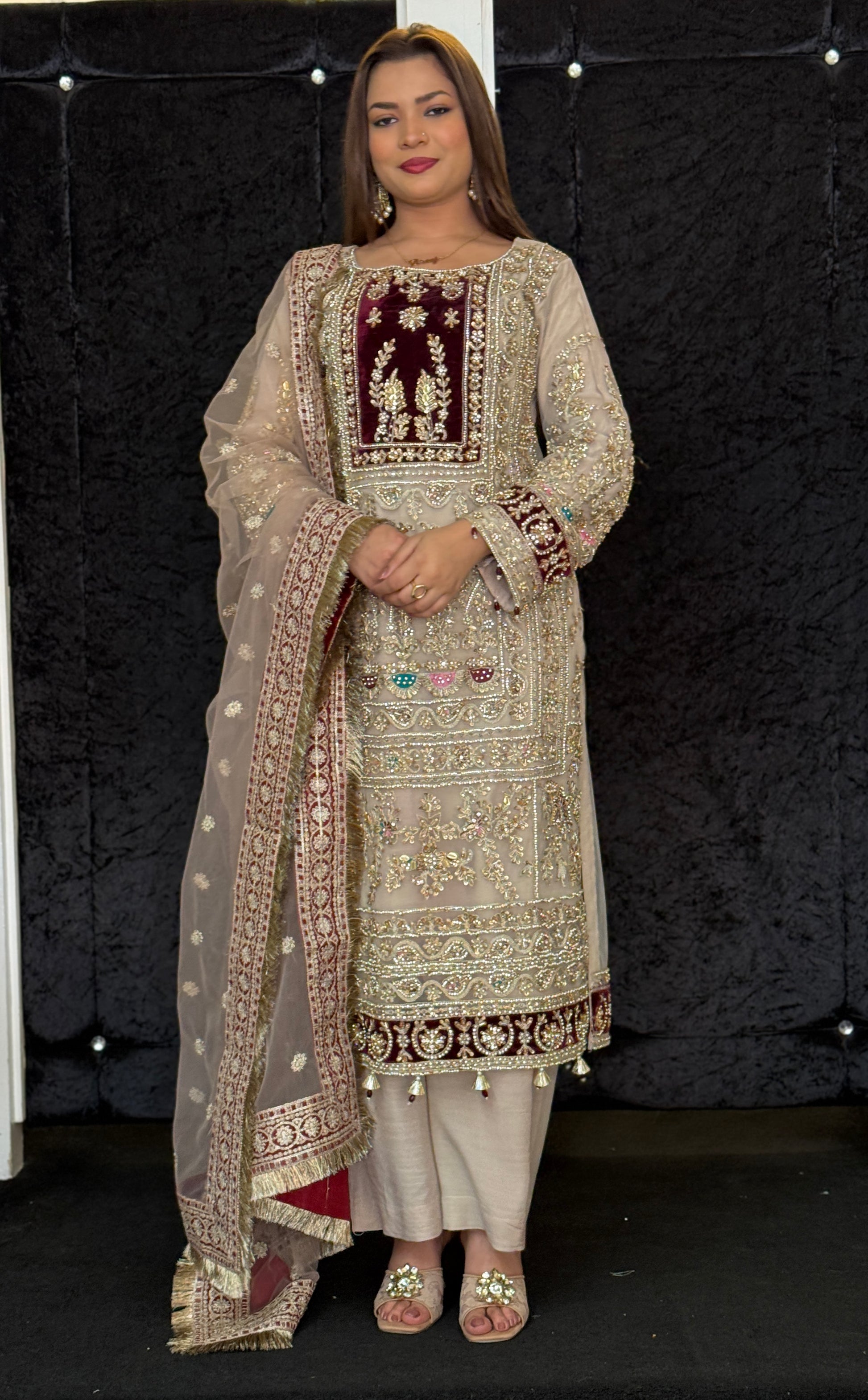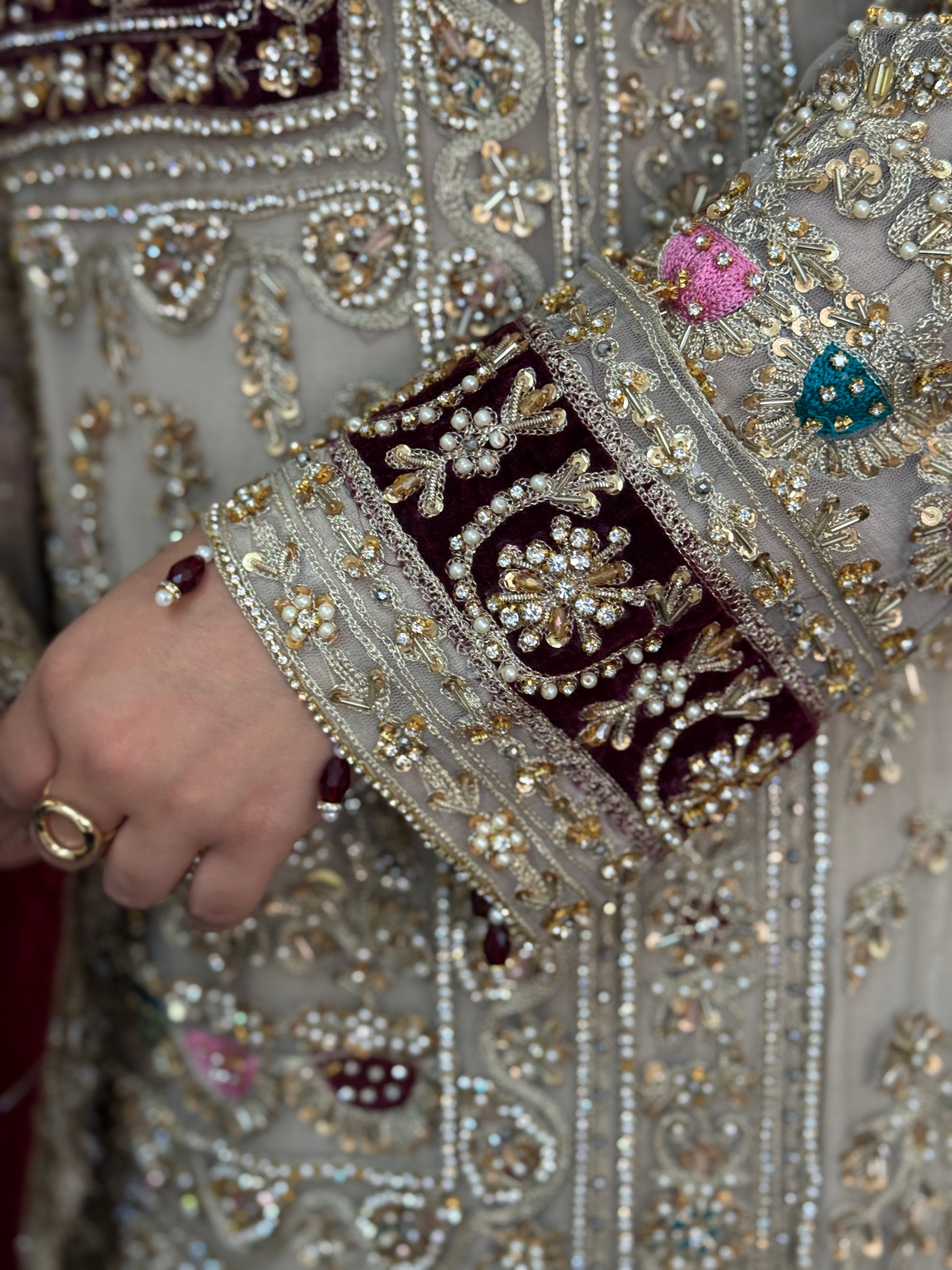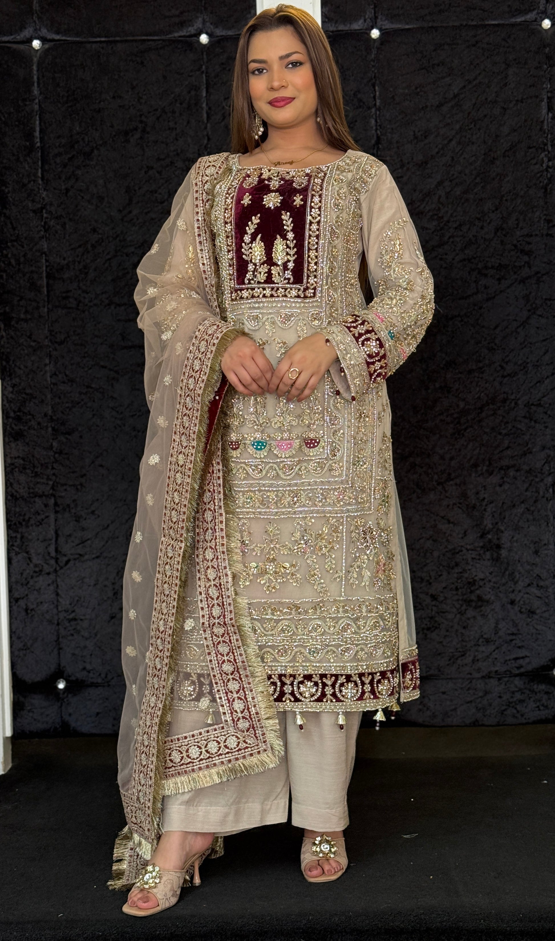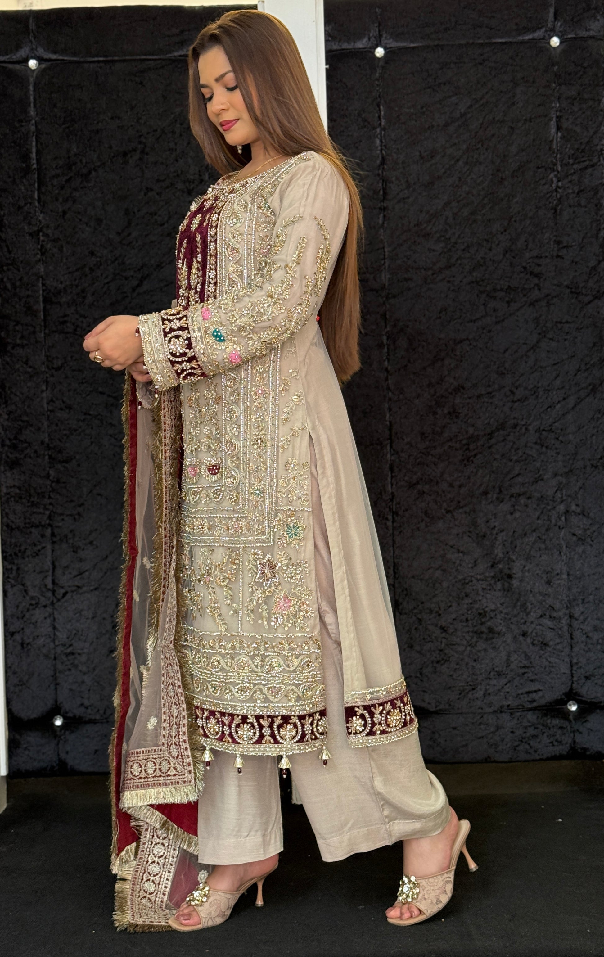 A intricately embroidered outfit with full hand embellished shirt using pearls, beads, stones. The perfect outfit Pakistani outfit for a Barat.