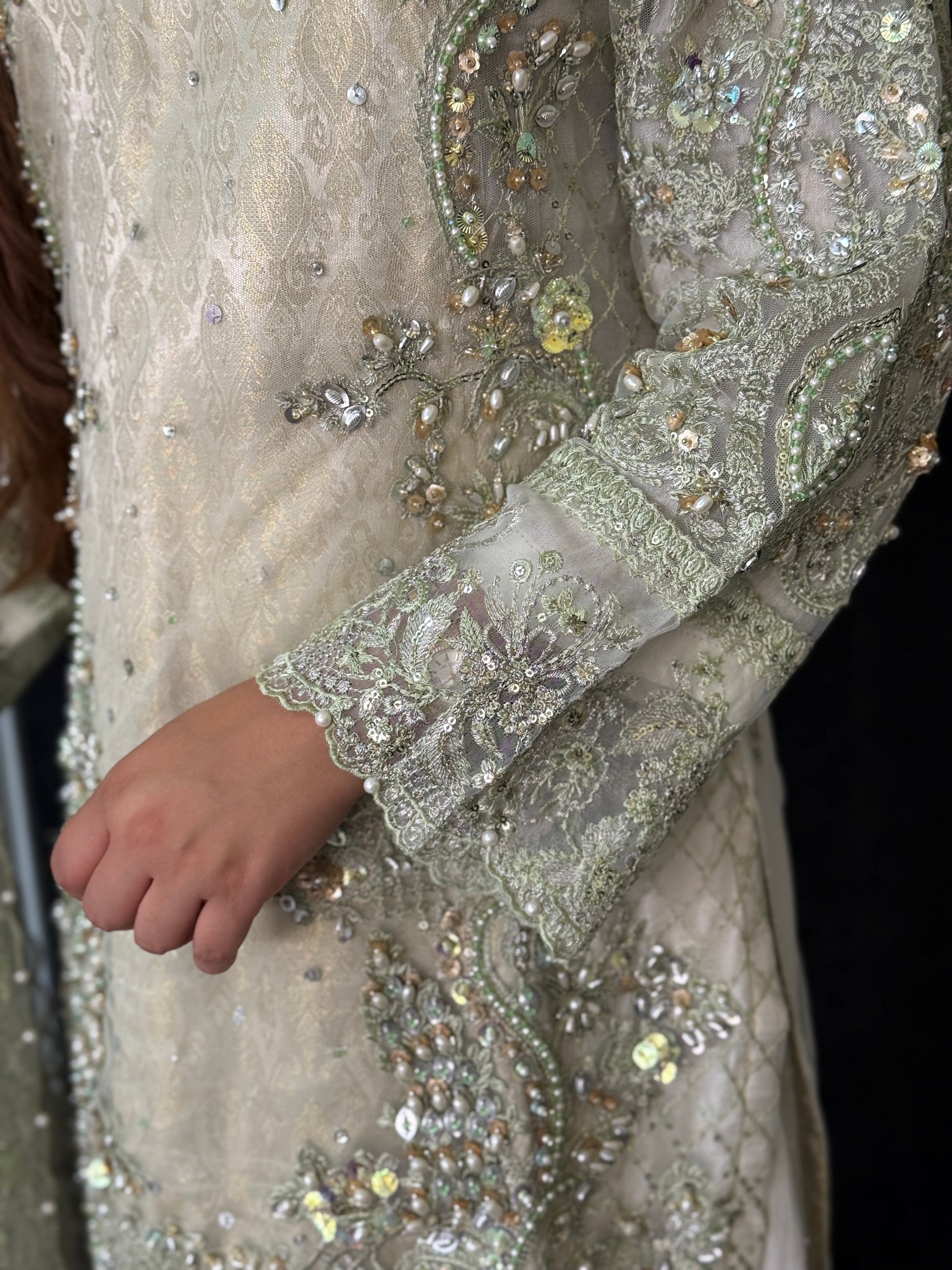 Turn heads and own every entrance in this stunning sage green formal set, beautifully hand-embellished with delicate beadwork, pearls, and soft gold accents. This design combines timeless elegance with a flattering silhouette — perfect for weddings, receptions, or any special occasion where you want to shine.