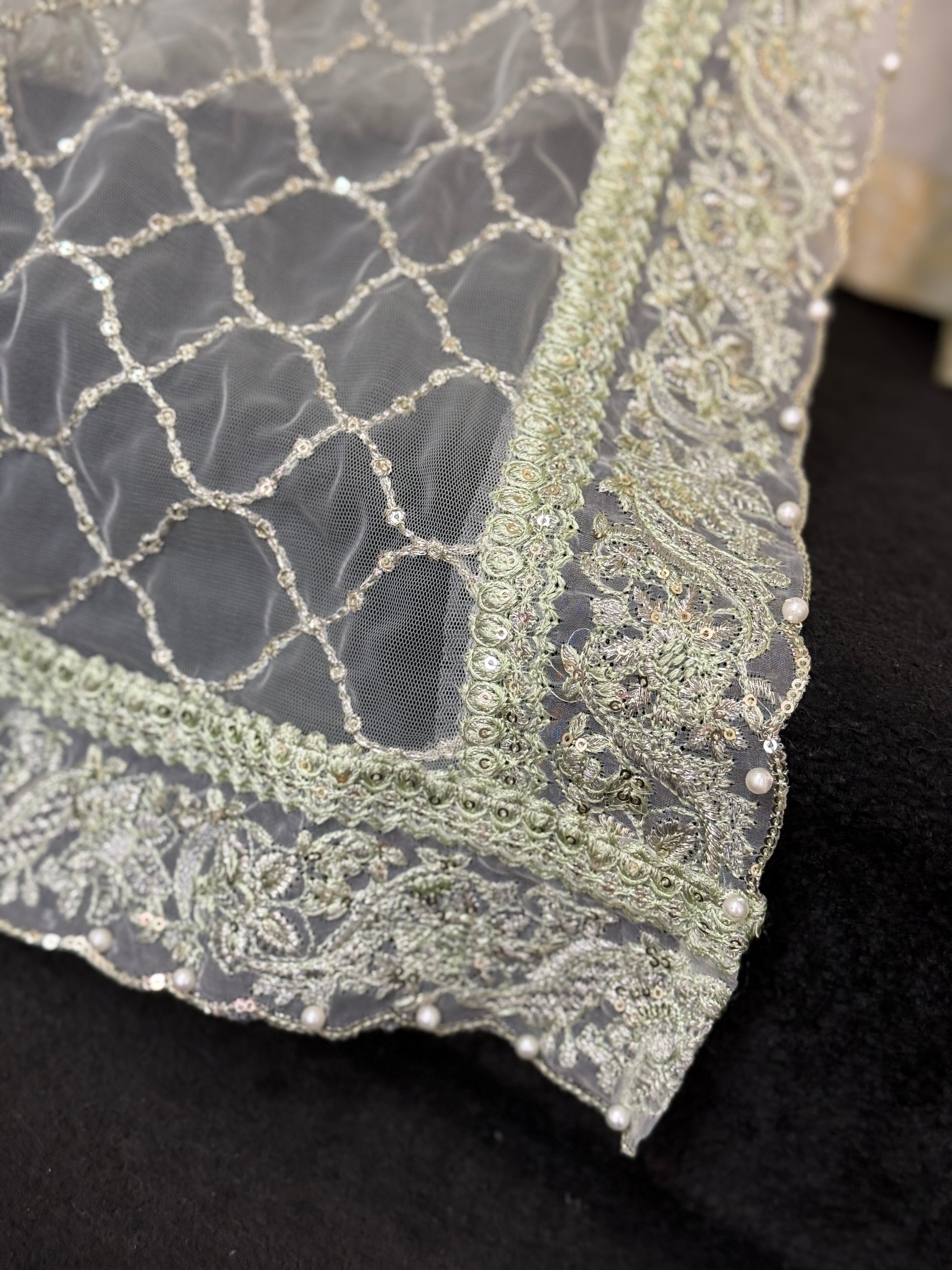• Lightweight net dupatta with scalloped borders and embellished grid pattern
