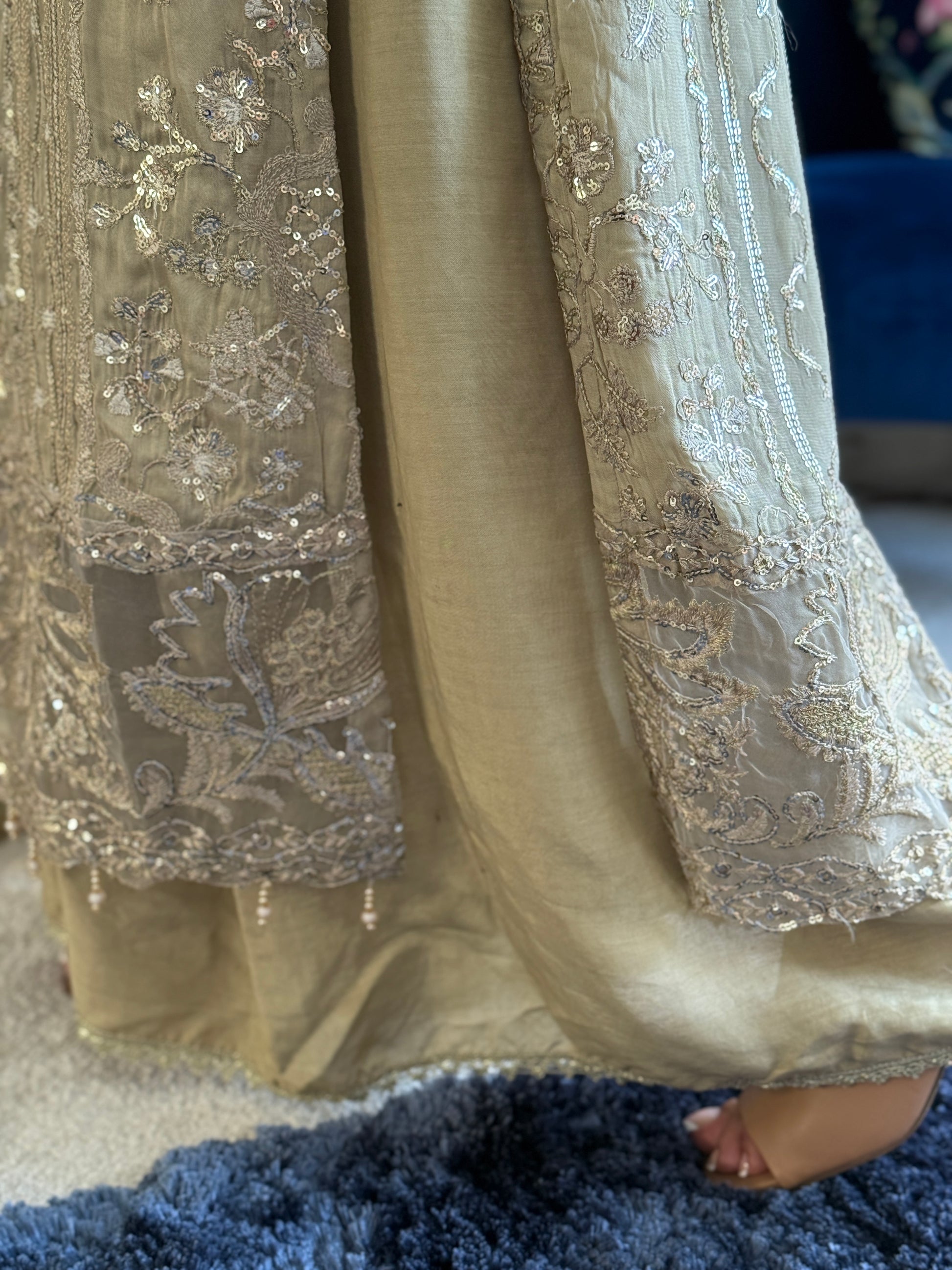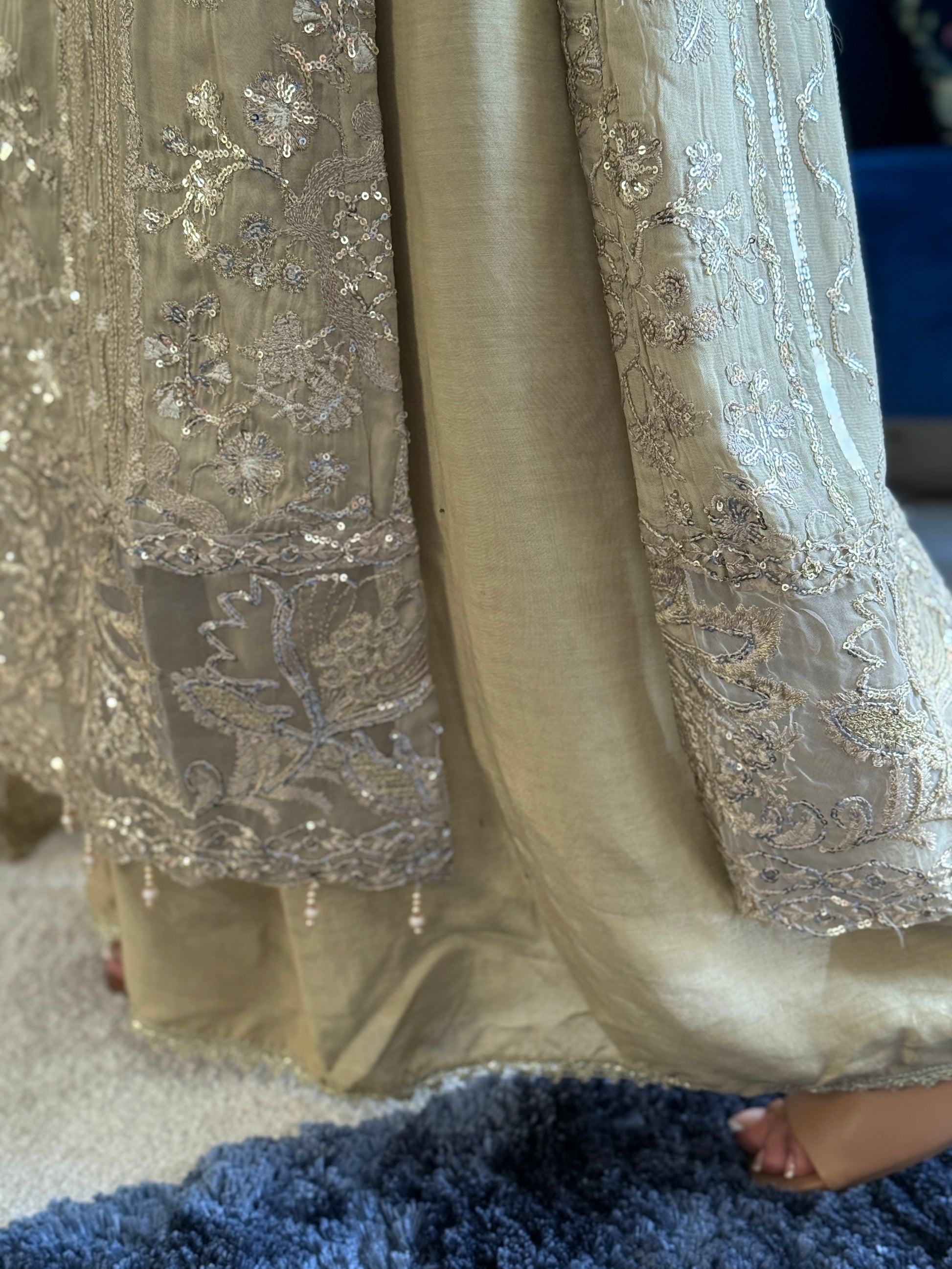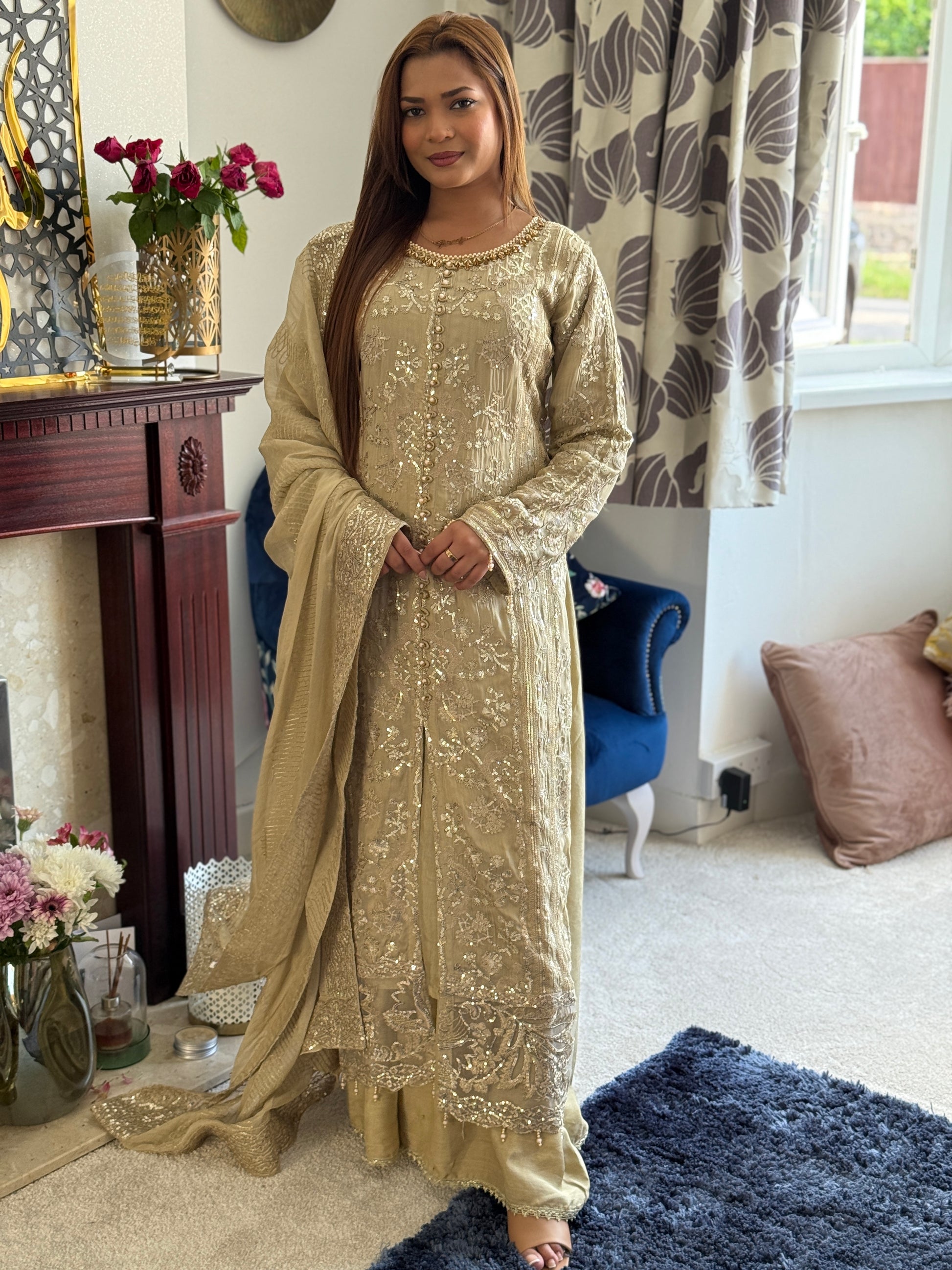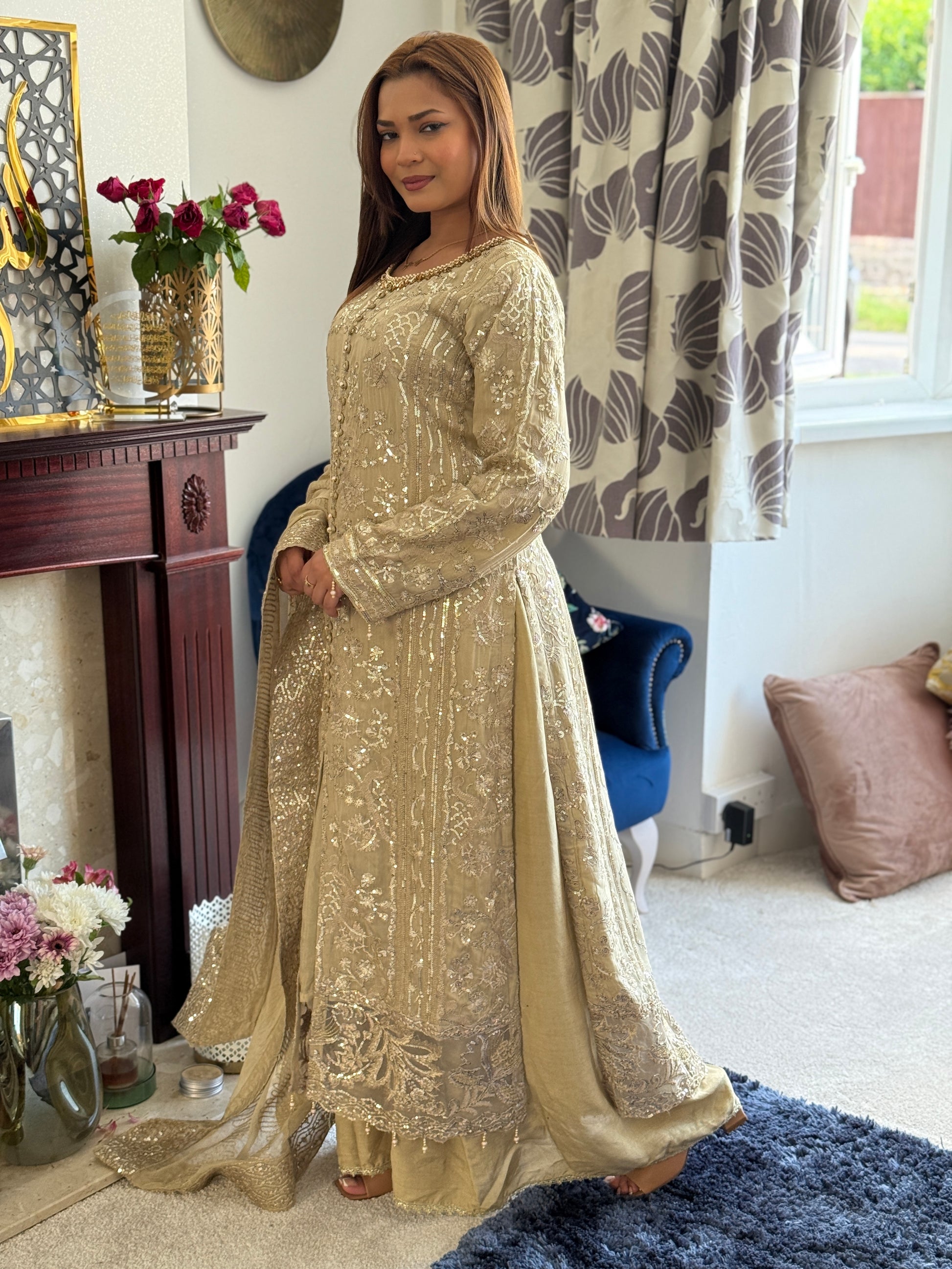 Paired with a classic chiffon sharara and a coordinating dupatta, this outfit brings timeless charm to weddings, formal events, and festive evenings. Its flowy silhouette and soft golden hue make it flattering for all skin tones, while the detailed craftsmanship speaks for itself.