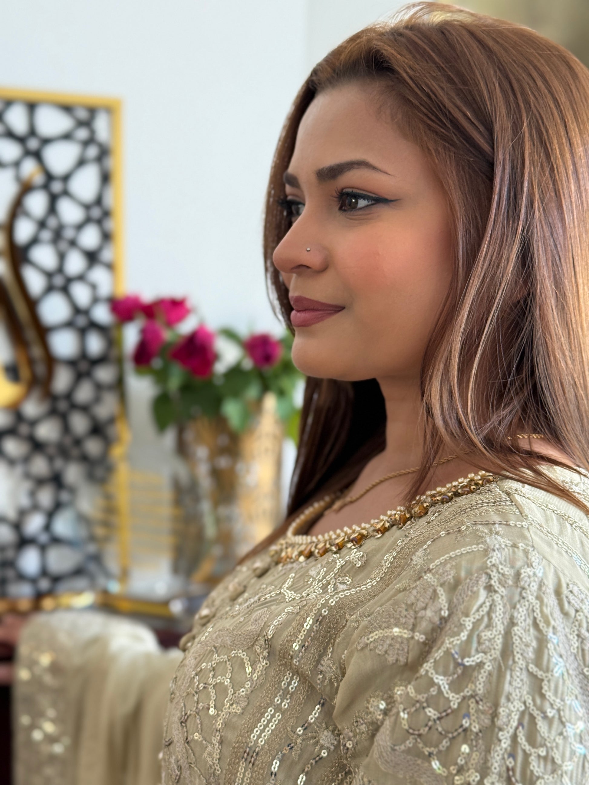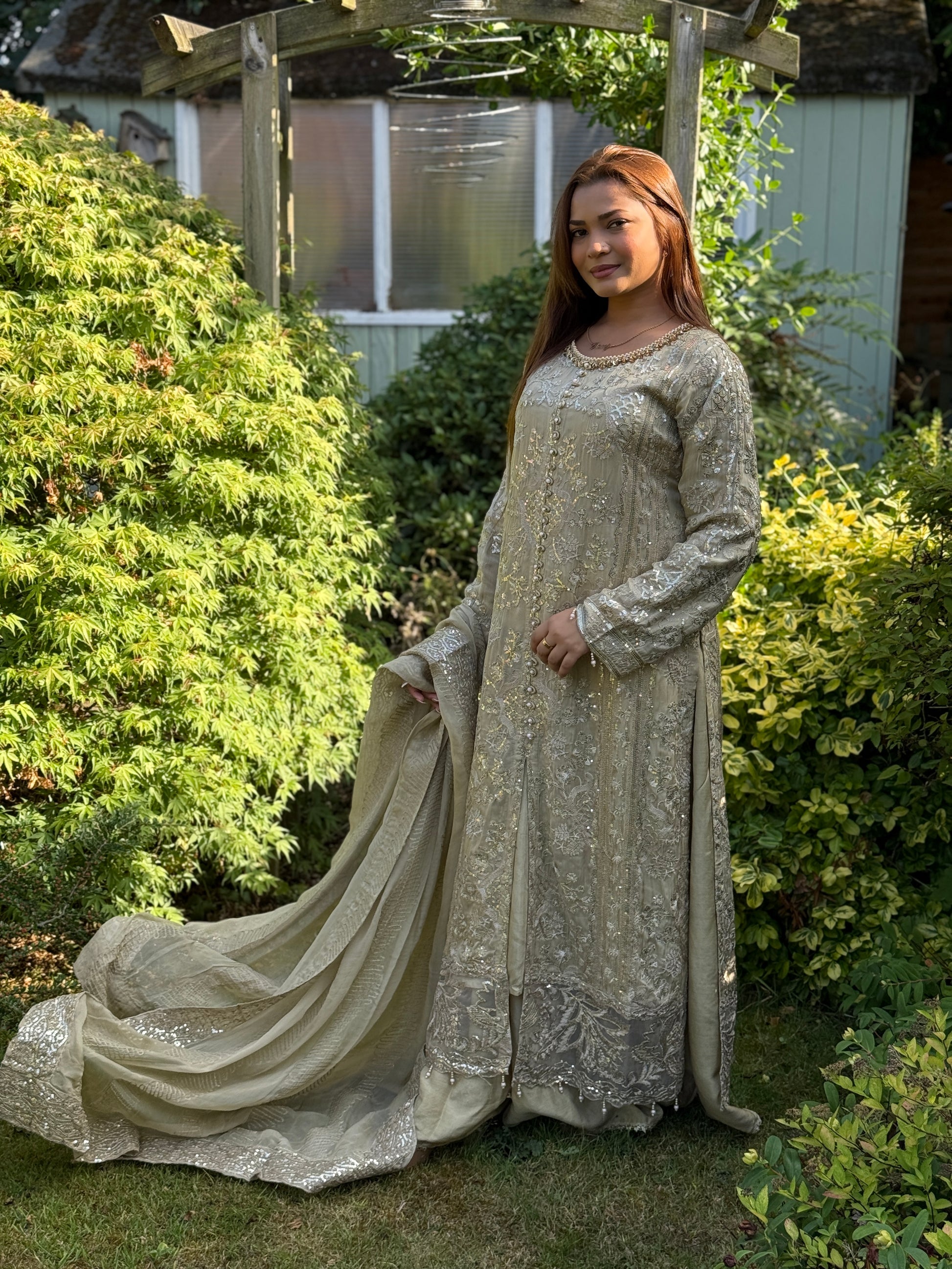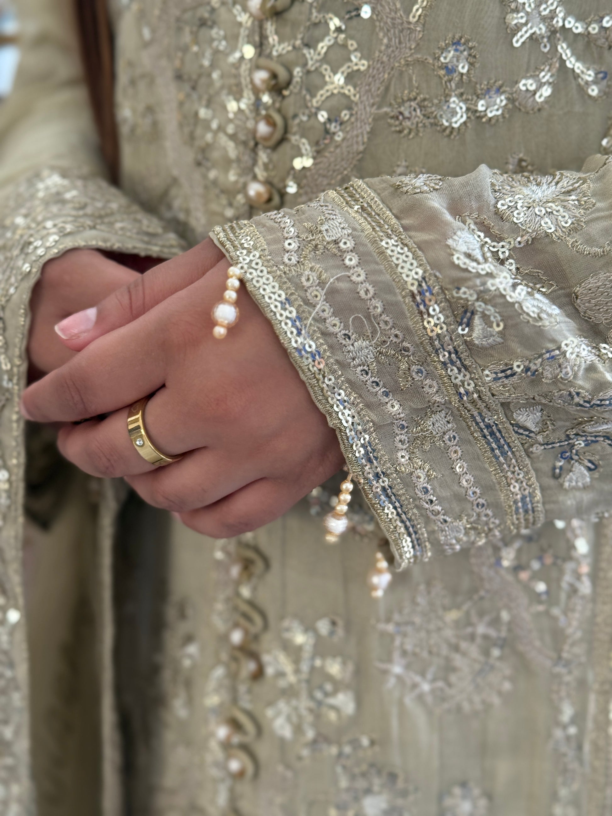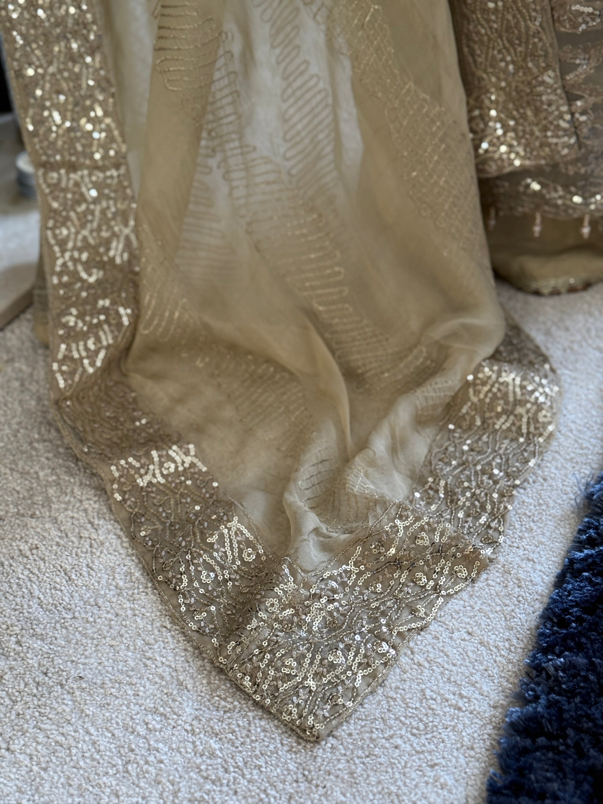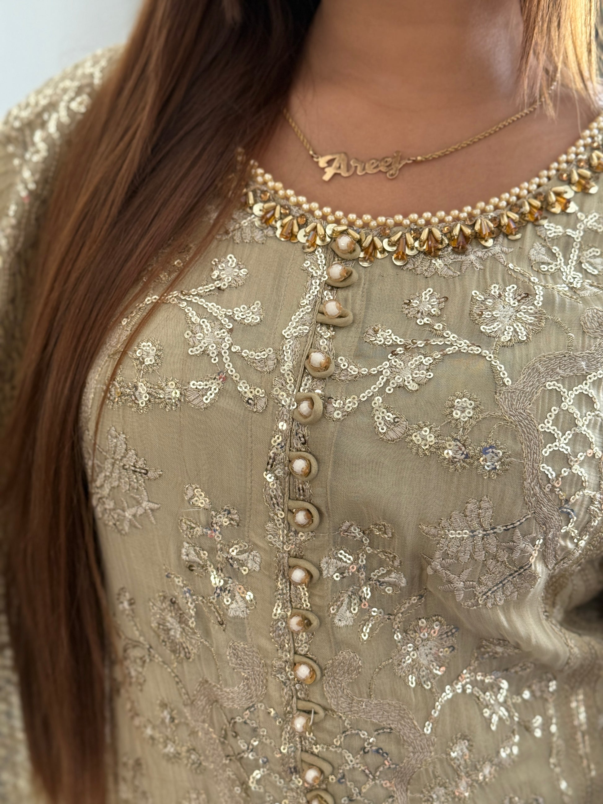 Paired with a classic chiffon sharara and a coordinating dupatta, this outfit brings timeless charm to weddings, formal events, and festive evenings. Its flowy silhouette and soft golden hue make it flattering for all skin tones, while the detailed craftsmanship speaks for itself.