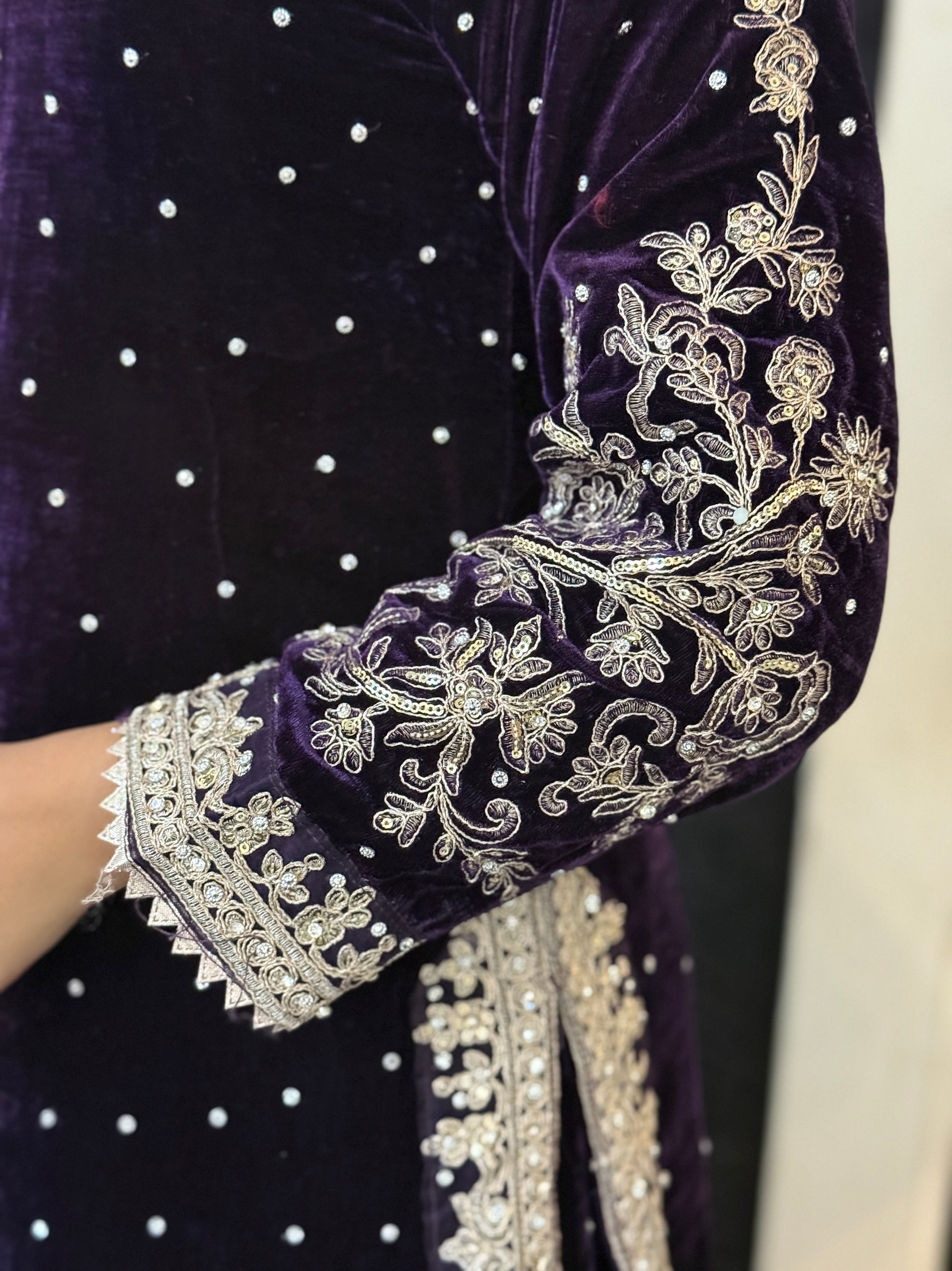 A rich plum velvet set with delicate pearl work, embroidered trouser detailing, and a fully embroidered floral organza dupatta. Luxe, elegant and perfect for winter occasions.