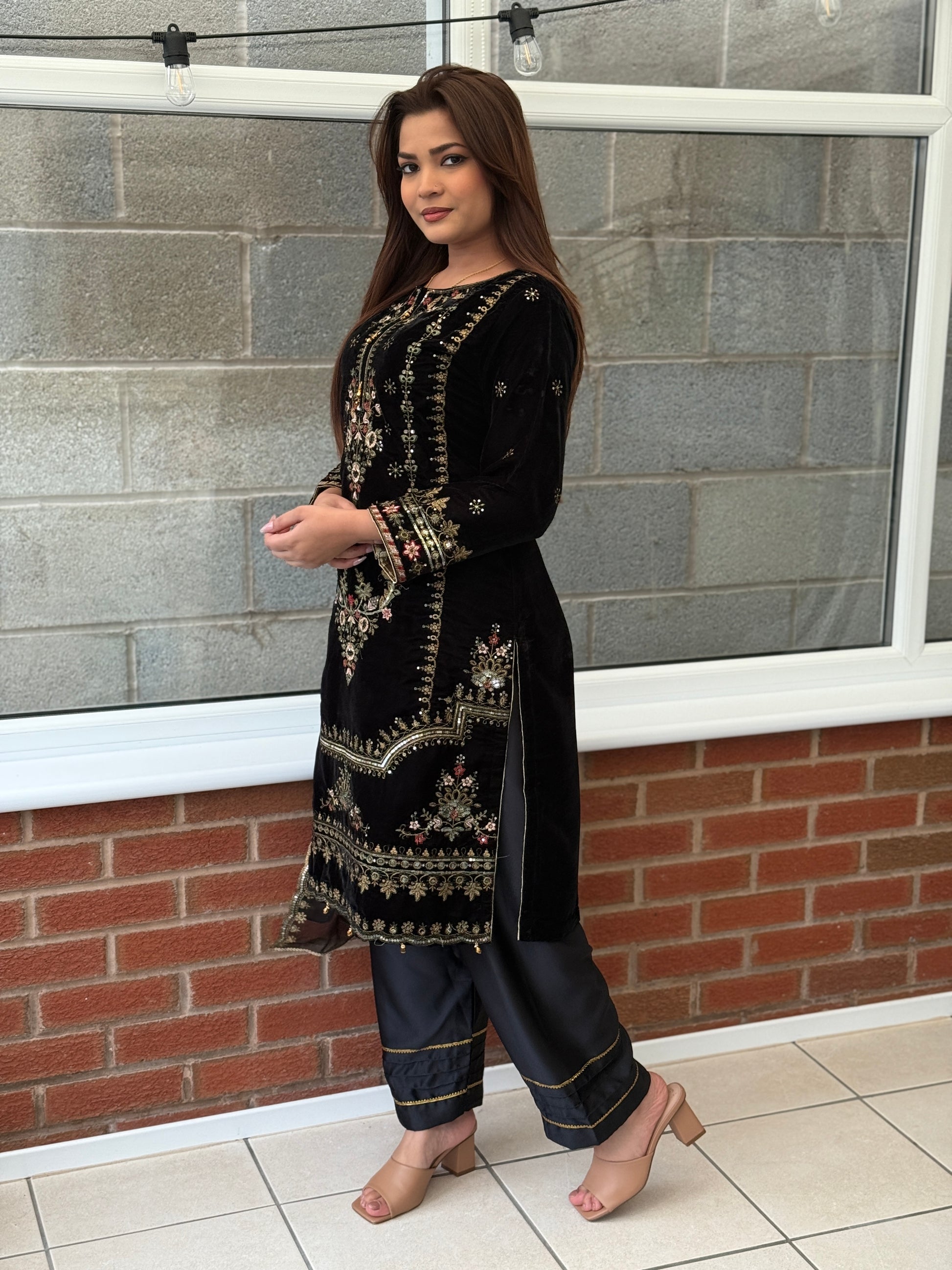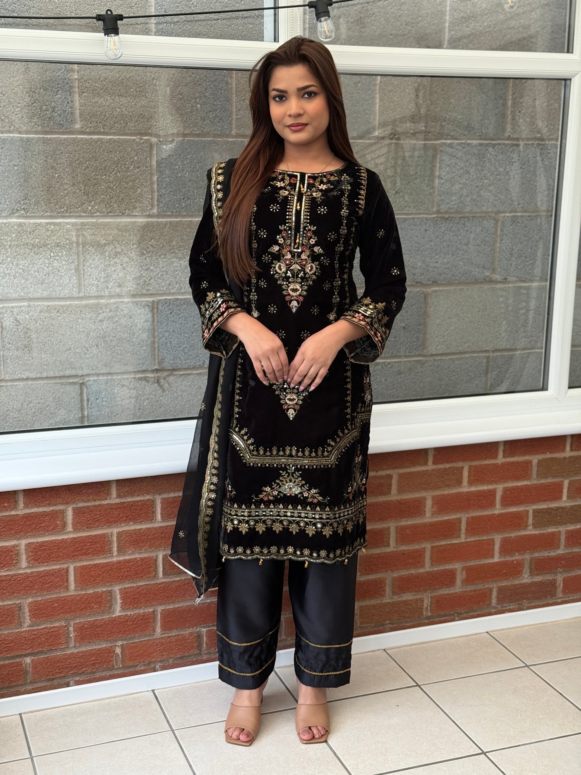 A luxurious velvet suit adorned with refined silk thread embroidery and subtle sequin detailing. Paired with smooth silk trousers and a soft chiffon dupatta for an elegant, winter-ready finish.