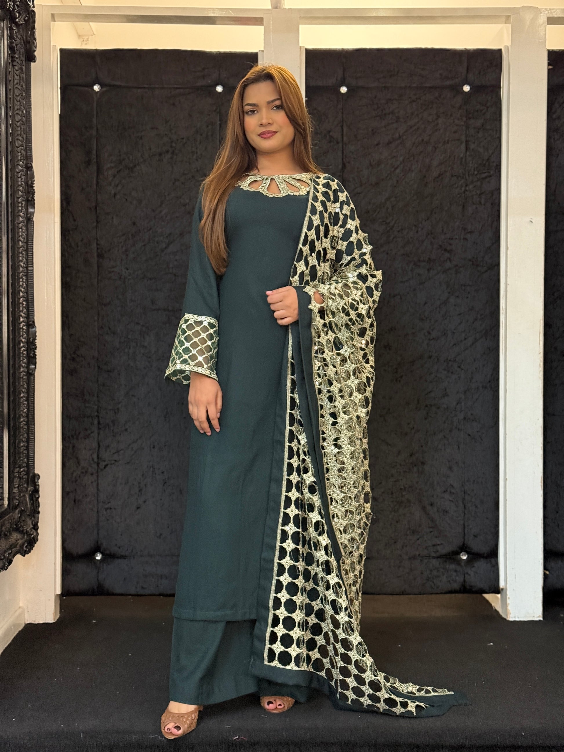 ✔ Statement sheesh dupatta – intricate mirror-style detailing for a luxe finish