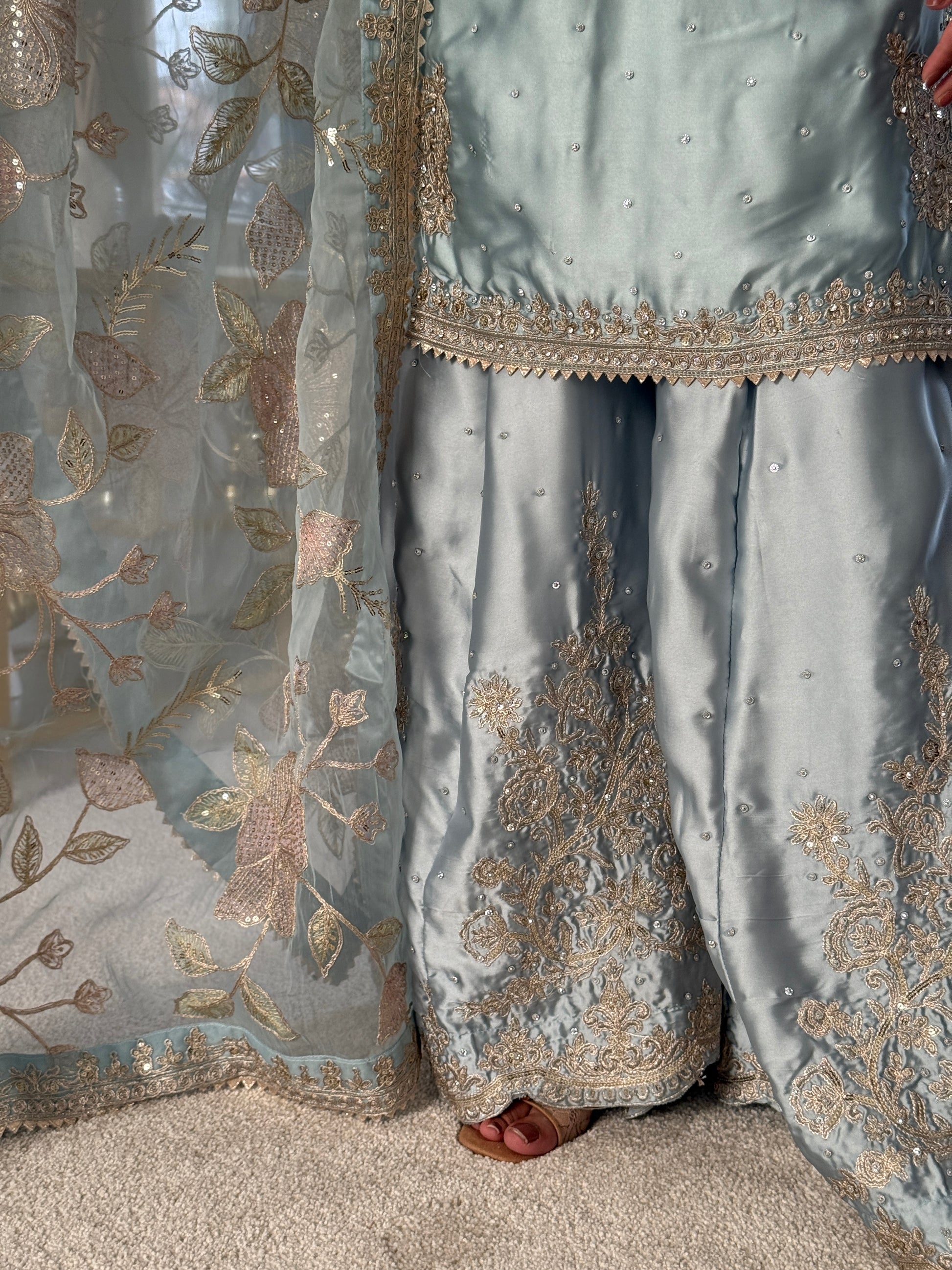 The straight-cut kameez features ornate detailing along the neckline and cuffs, perfectly balanced with wide-leg palazzo trousers embroidered with golden floral motifs. The ethereal organza dupatta, embellished with pastel-toned floral embroidery and a shimmering border, completes the look with graceful charm.