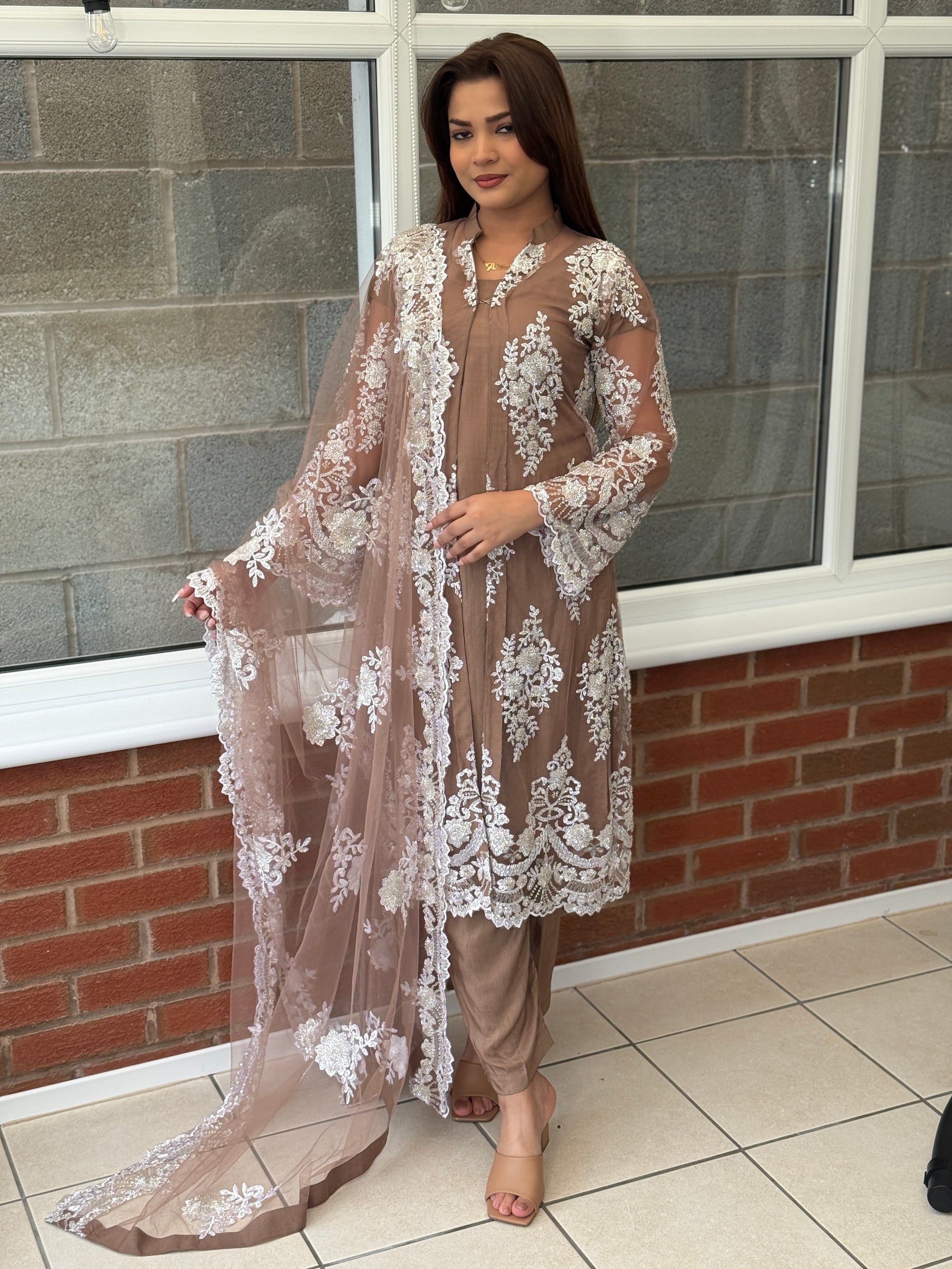 A statement jacket suit crafted in sheer Cut Dana fabric, richly adorned with heavy stone and bead embellishment on both the front and back. Completed with a matching beaded dupatta, coordinated inner, and tailored trousers for a refined, couture-inspired finish.