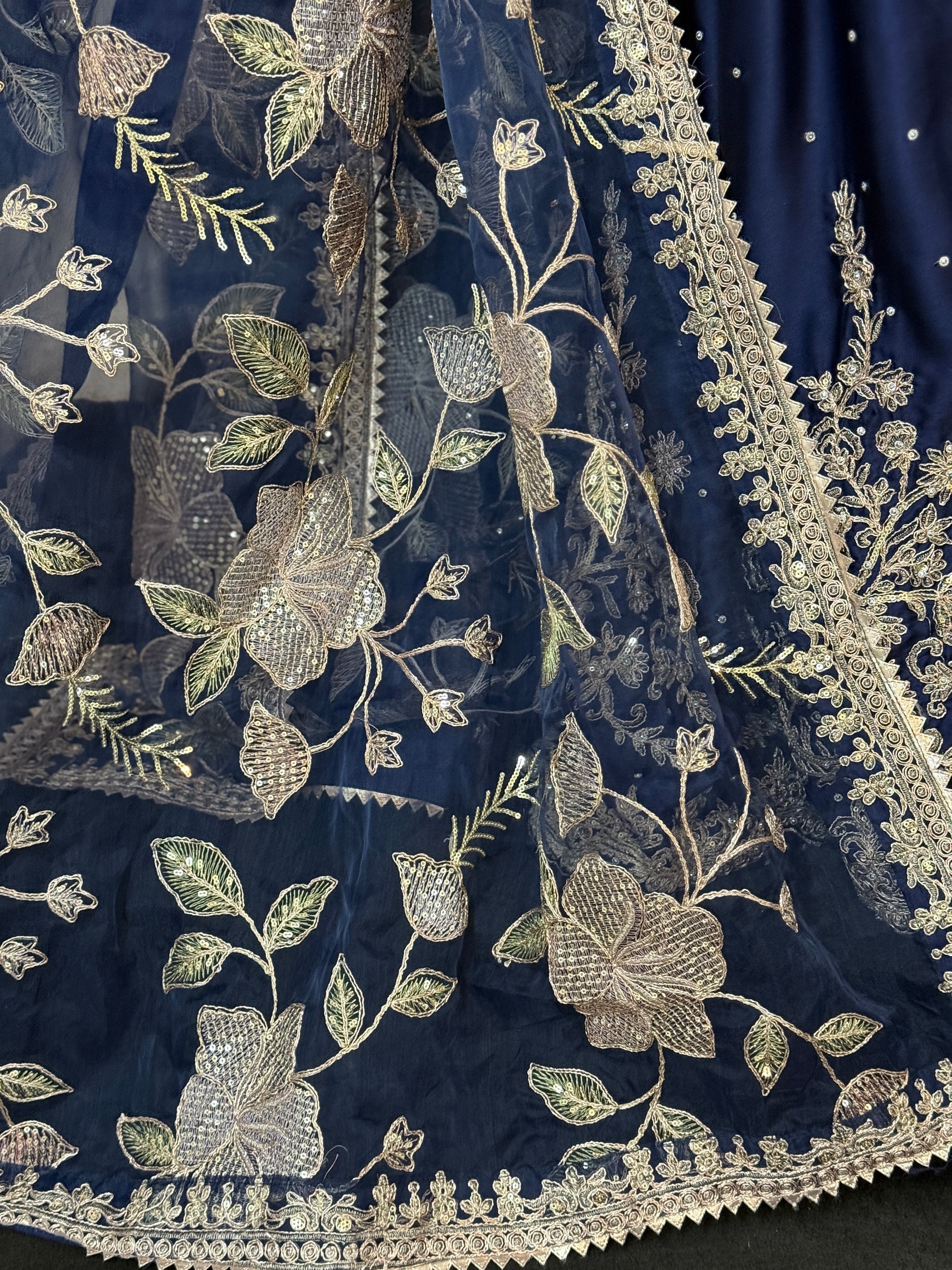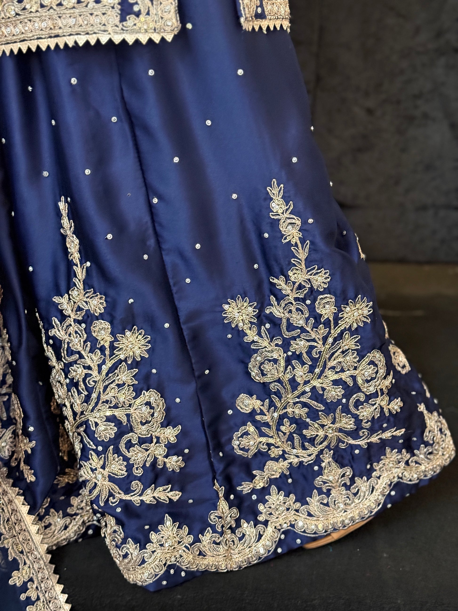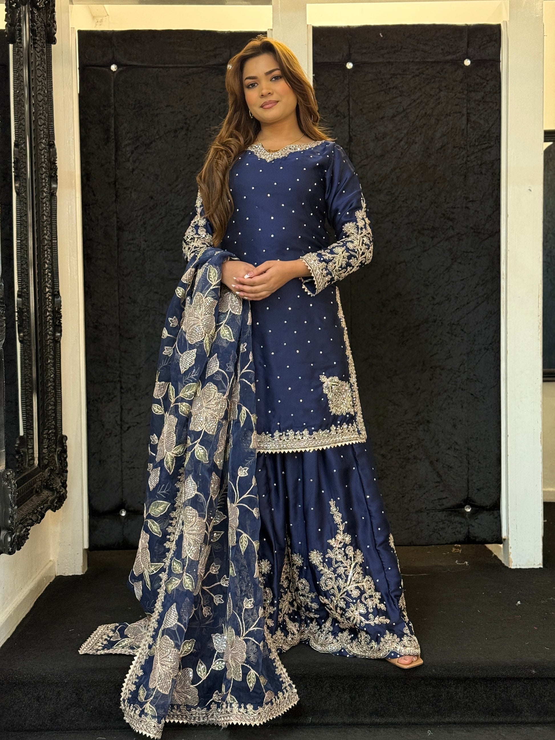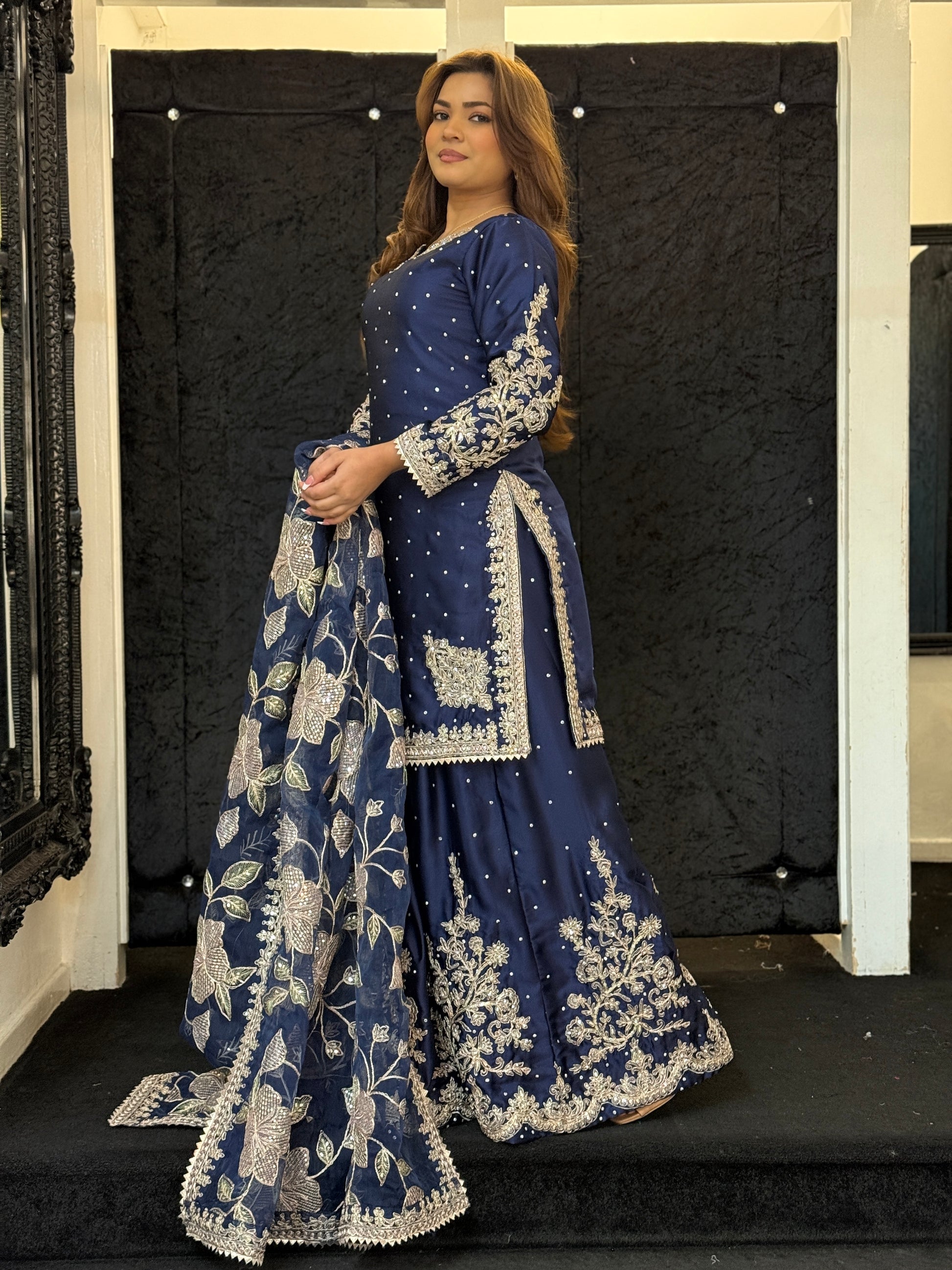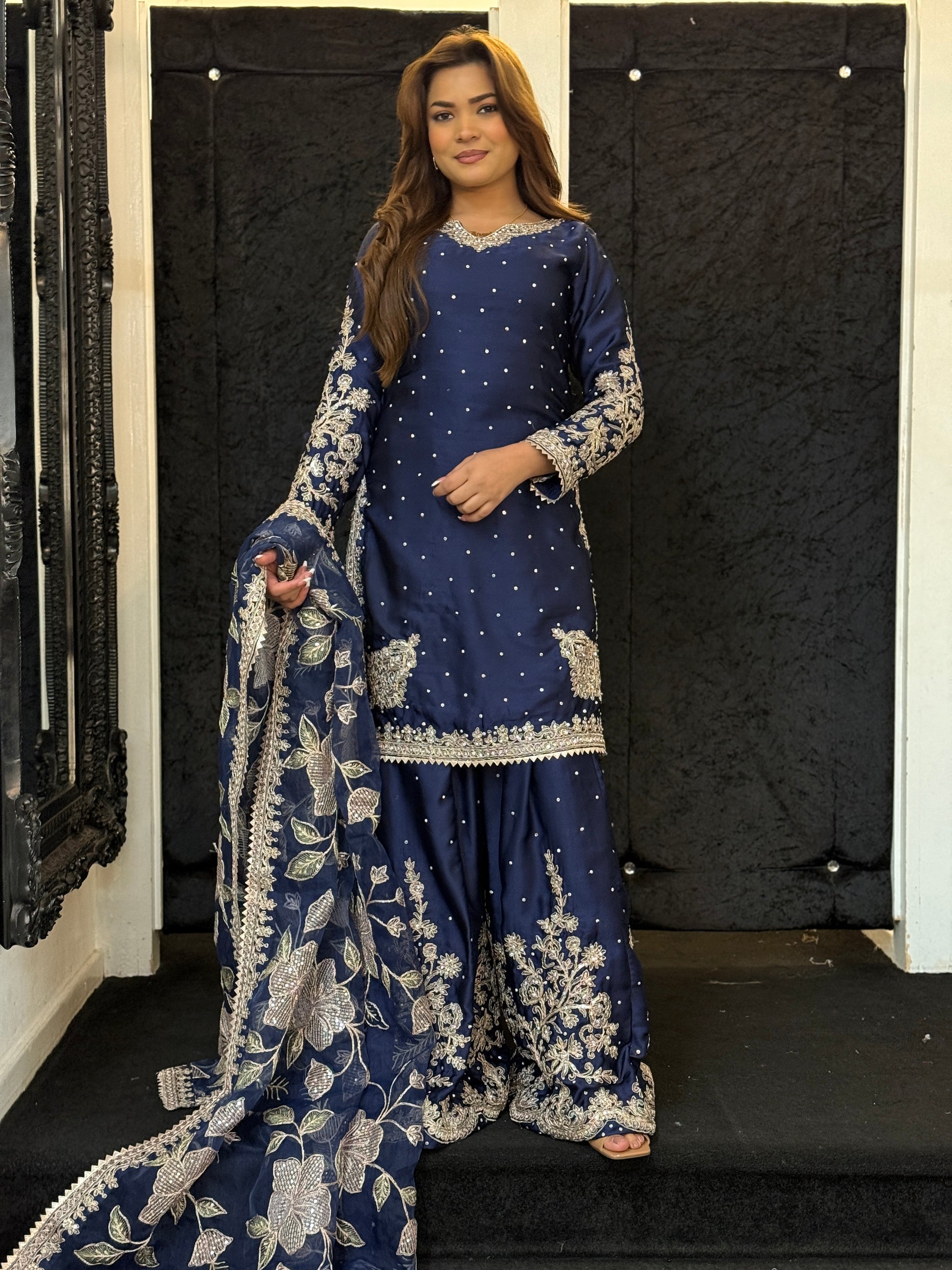 Etoile Midnight Elegance – A vision of sophistication, this navy three-piece set exudes timeless charm. The pure satin kameez is delicately adorned with pearl-like embellishments and intricate gold thread embroidery along the neckline and sleeves. The wide-leg trousers feature exquisite floral zari work, adding a regal touch. Paired with a sheer organza dupatta, embroidered with pastel peach and gold blooms, this ensemble is perfect for weddings, festive occasions, and evening soirées. Understated yet striking – an outfit that speaks luxury in every detail.