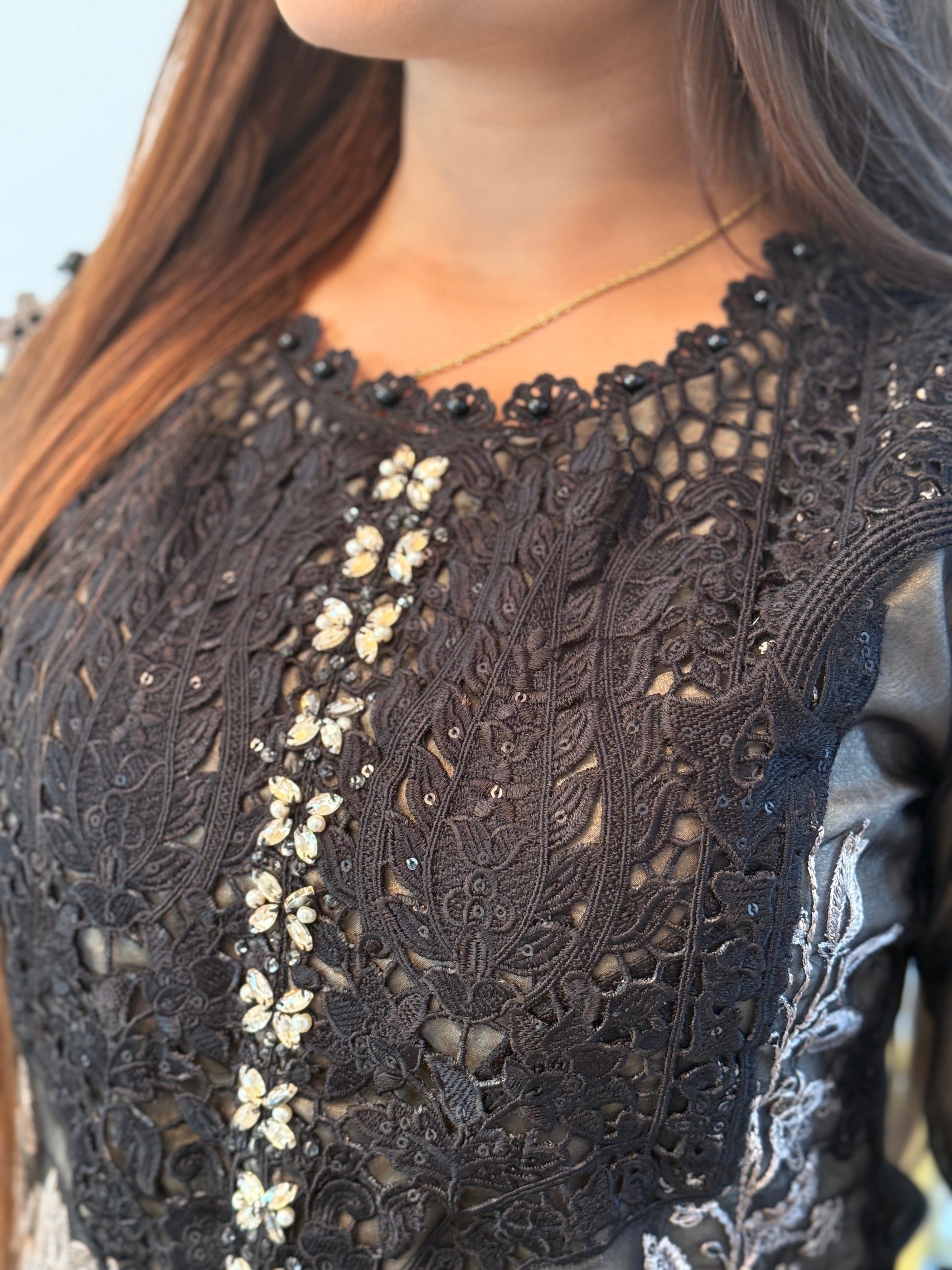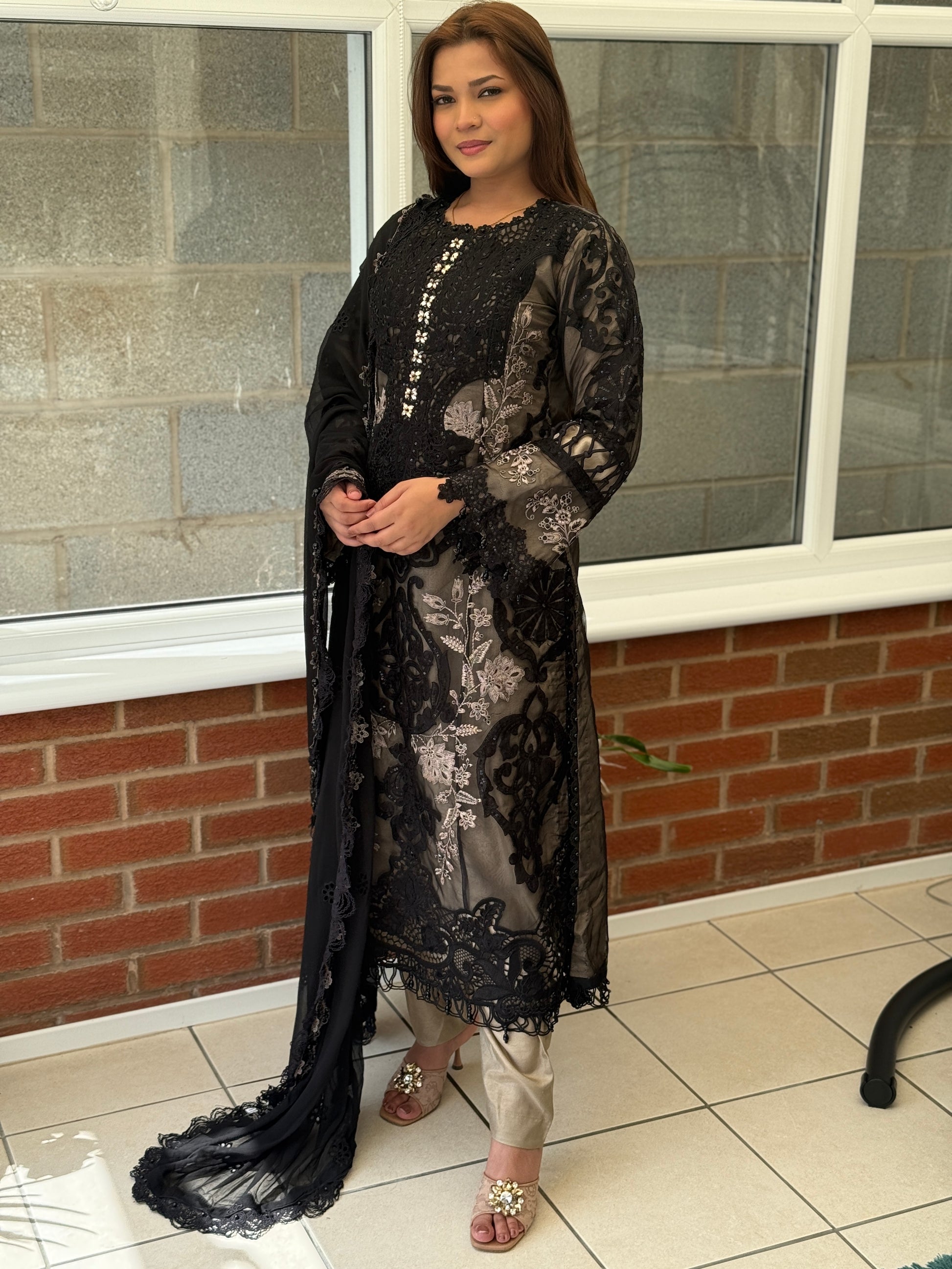 Midnight Noir Elegance – A striking Maria B replica in rich black with intricate lace and thread embroidery, beautifully contrasted with silver floral accents. The kameez features detailed cutwork borders and mirror embellishments on the neckline for a touch of shimmer. Paired with gold-toned trousers and a soft chiffon dupatta edged with scalloped lace, this ensemble delivers a perfect balance of sophistication and drama – ideal for evening wear and formal gatherings.