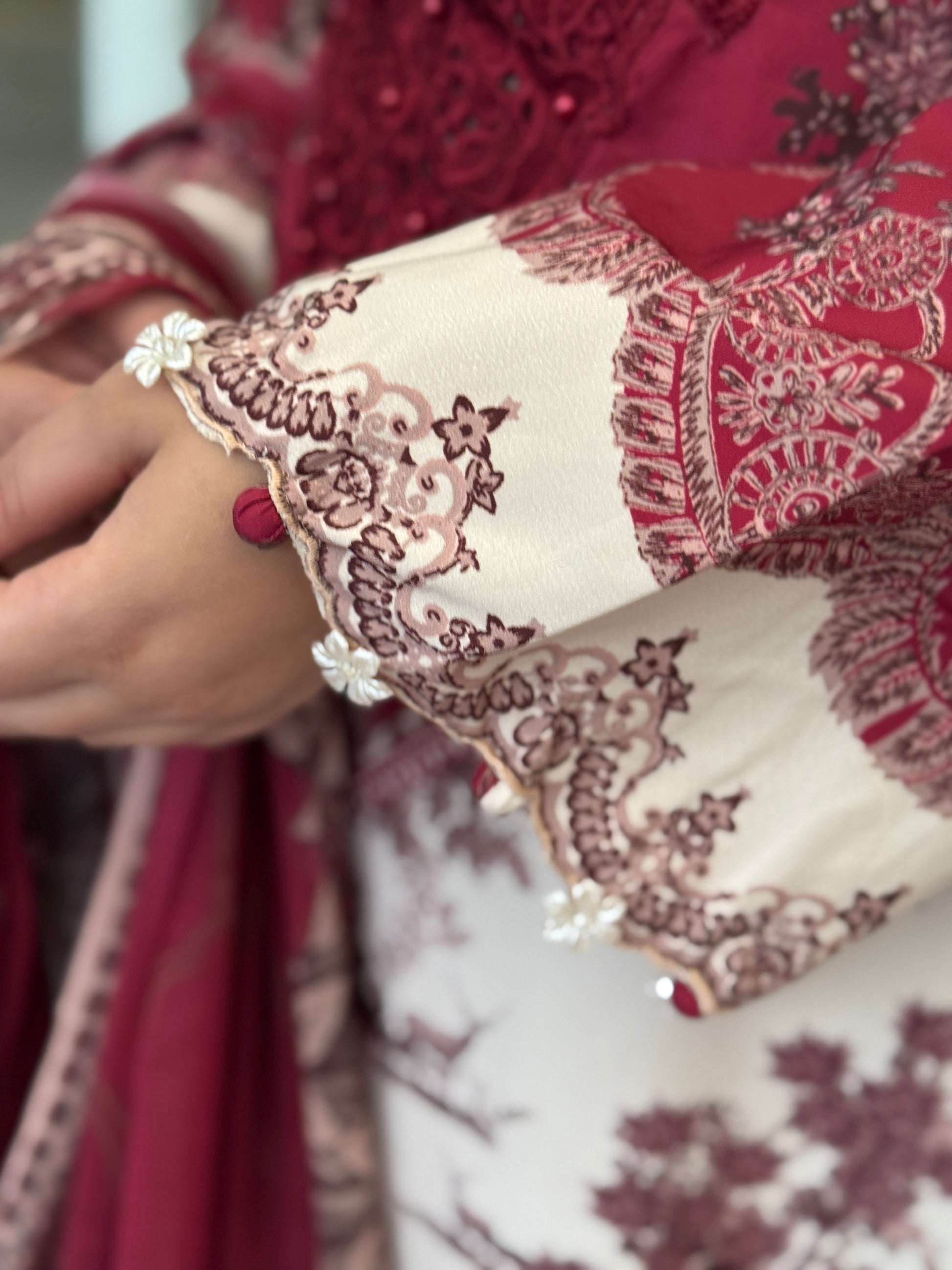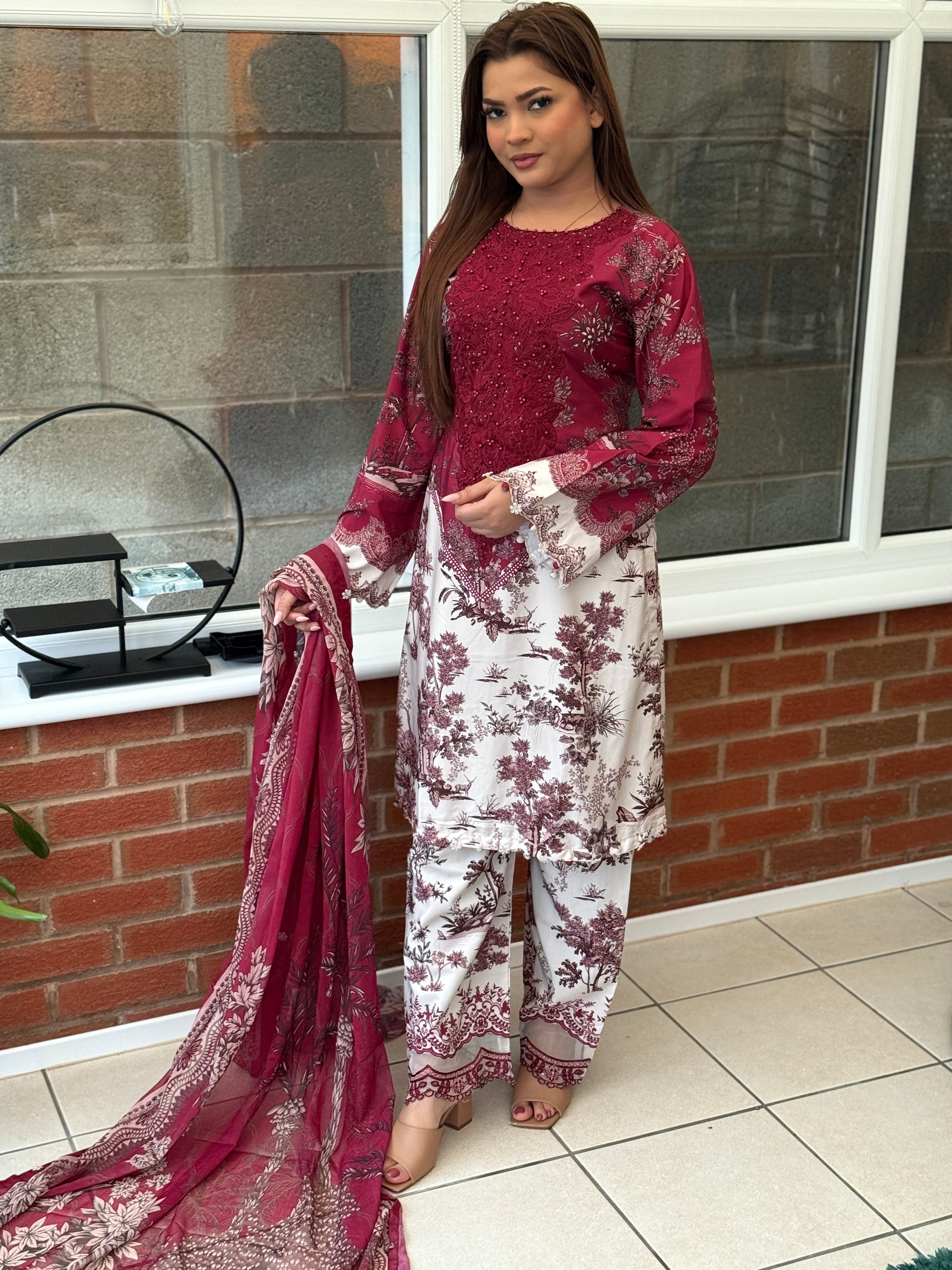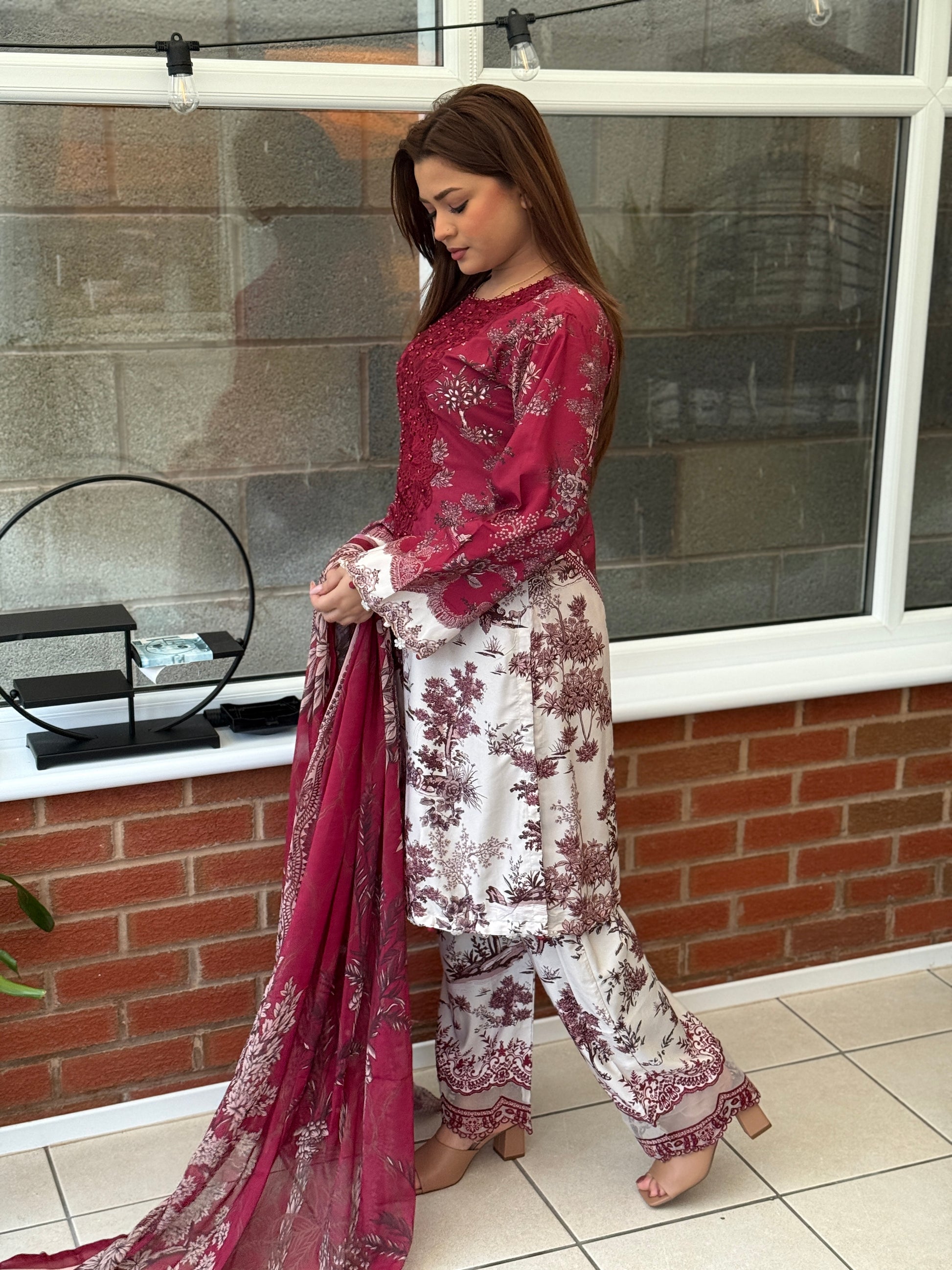 Elevate your festive wardrobe with this Maria B inspired masterpiece — a timeless fusion of elegance and sophistication. Crafted on premium crepe, this three-piece suit showcases a striking contrast of charcoal black and soft white, enriched with intricate embroidery that exudes artisanal finesse. The flowing chiffon dupatta, adorned with classic floral motifs, adds an ethereal touch, making it the perfect ensemble for formal soirées, shaadi celebrations, or intimate gatherings. A refined choice for the woman who dresses to leave an impression.