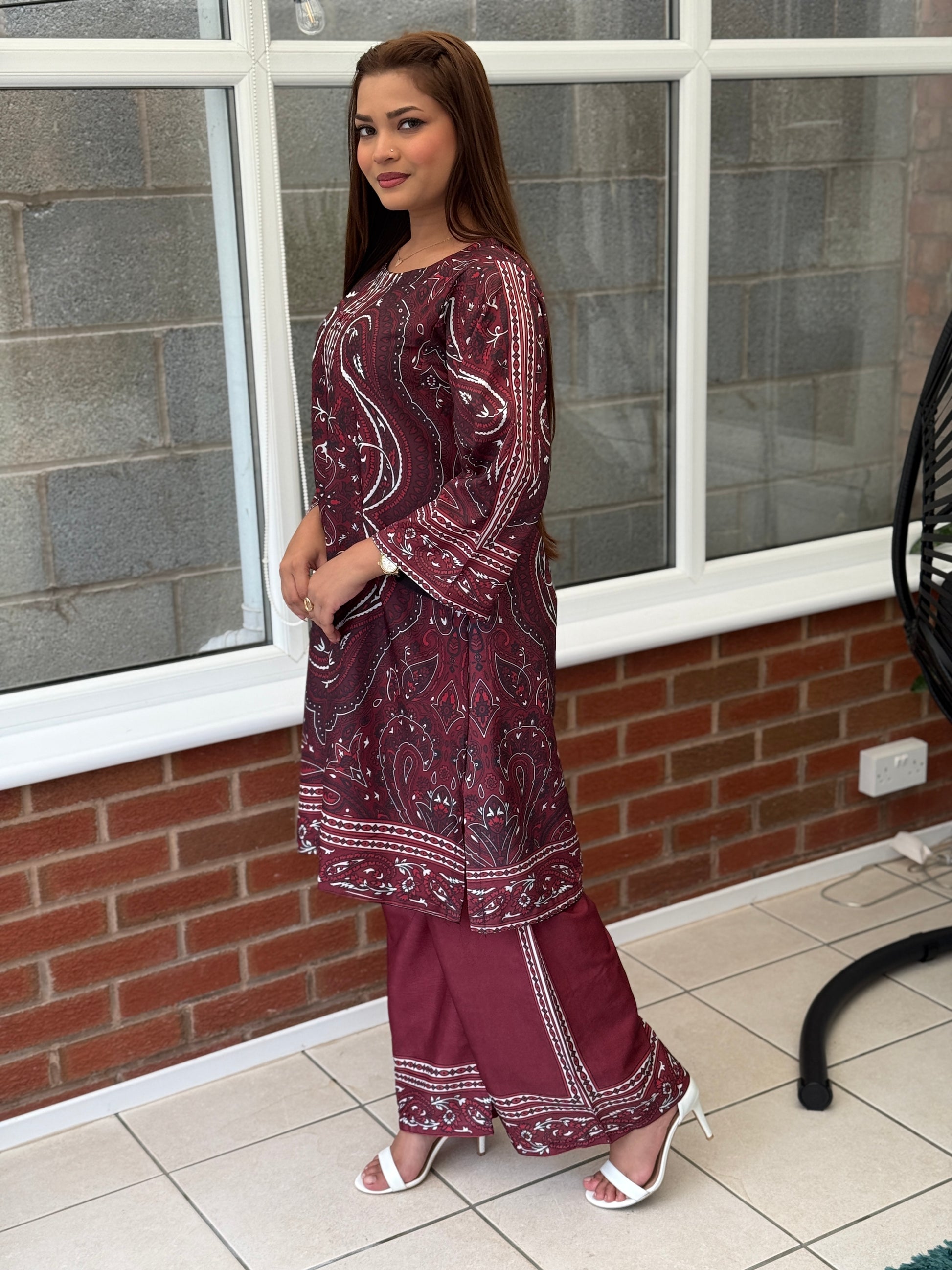 Chic, bold, and timeless – this maroon three-piece is a wardrobe must-have. Designed with an intricate paisley-inspired print, the long kameez features flared sleeves and a straight cut for effortless elegance. Paired with wide-leg trousers finished with matching border detailing, this set brings both comfort and statement style.