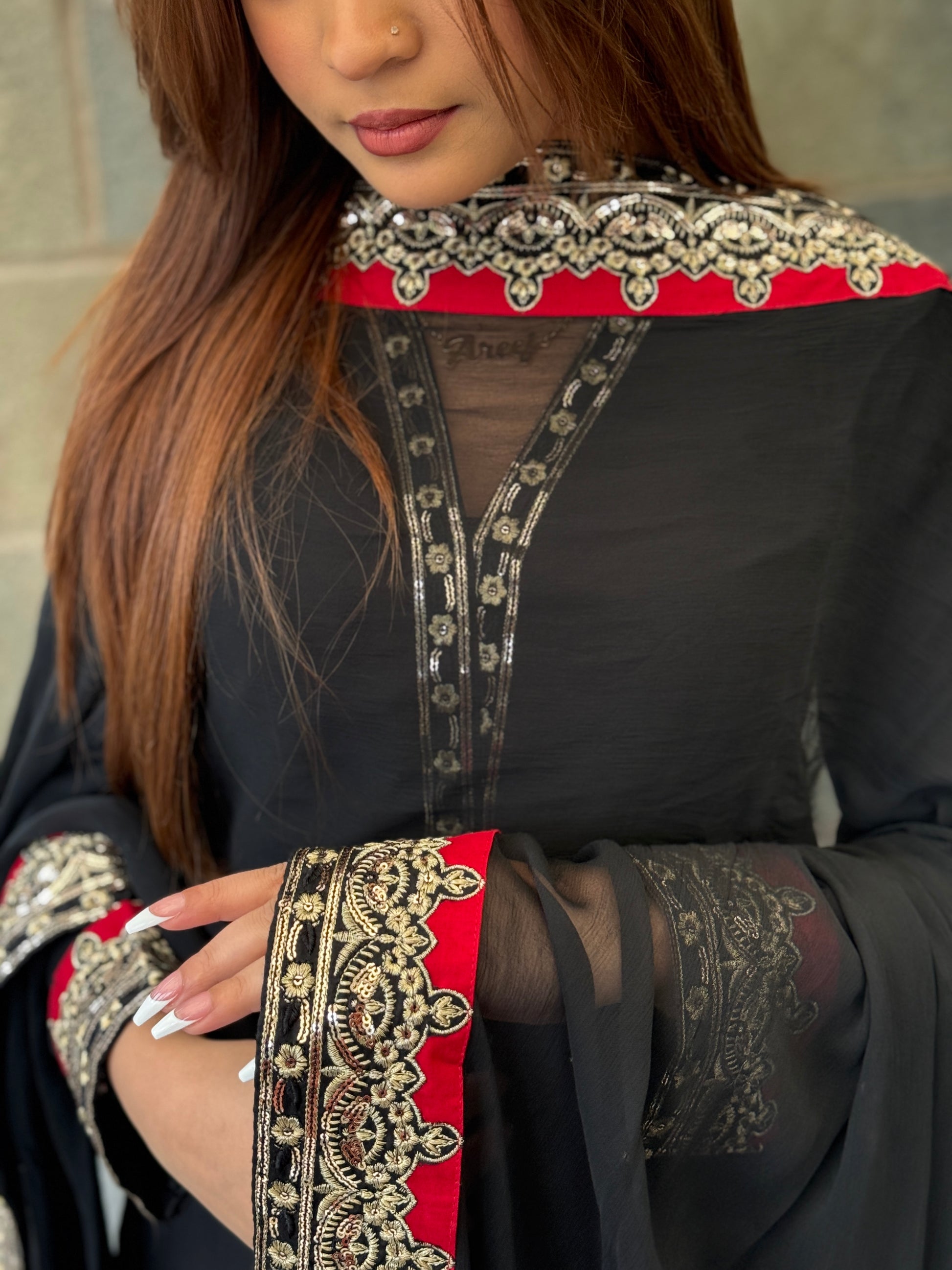 A timeless black 3-piece featuring elegant sequin border detailing on the neckline, trouser hem, and a statement chiffon dupatta finished with sparkle on all four sides.
