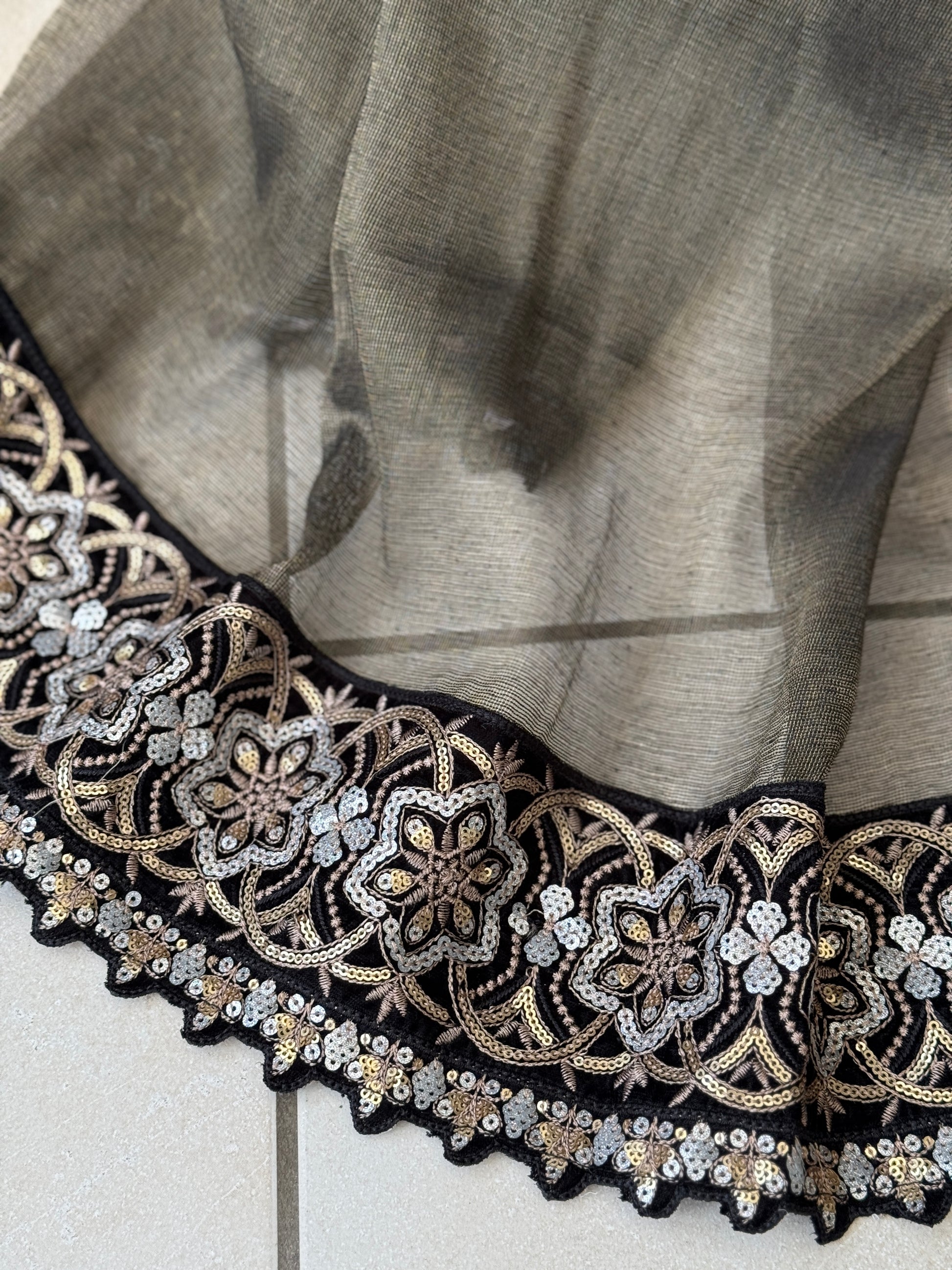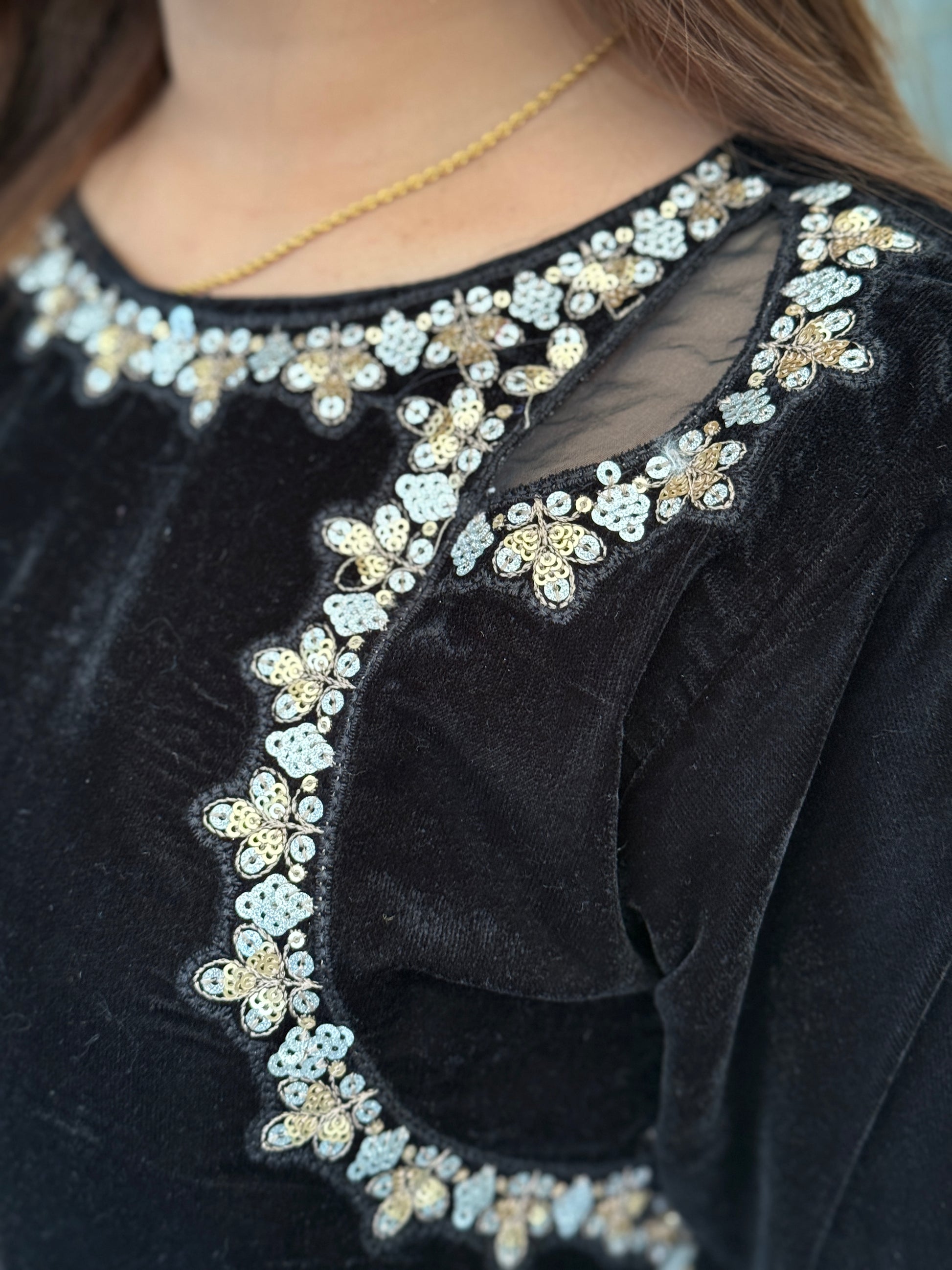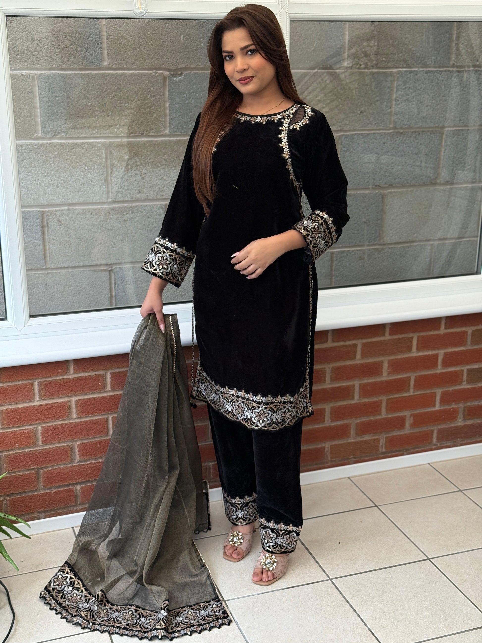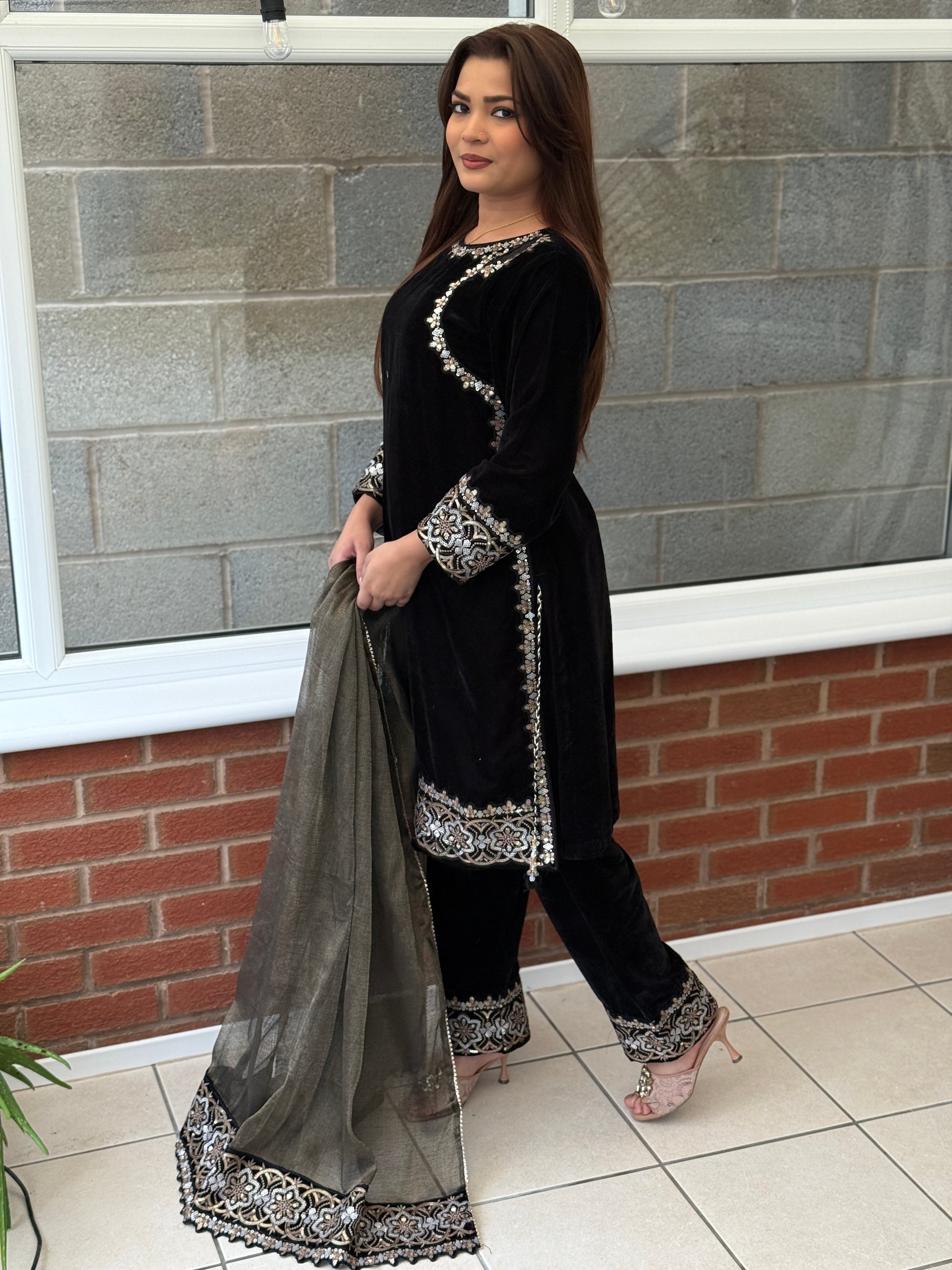 Crafted from sumptuous velvet, the Nooré Velvet Shoulder Suit in Noir Black is defined by its refined embellished shoulder detailing, flowing elegantly along the neckline and side seam. Finished with intricate embroidery on the cuffs and hem, paired with matching velvet trousers and a sheer net dupatta with an ornate embroidered border.