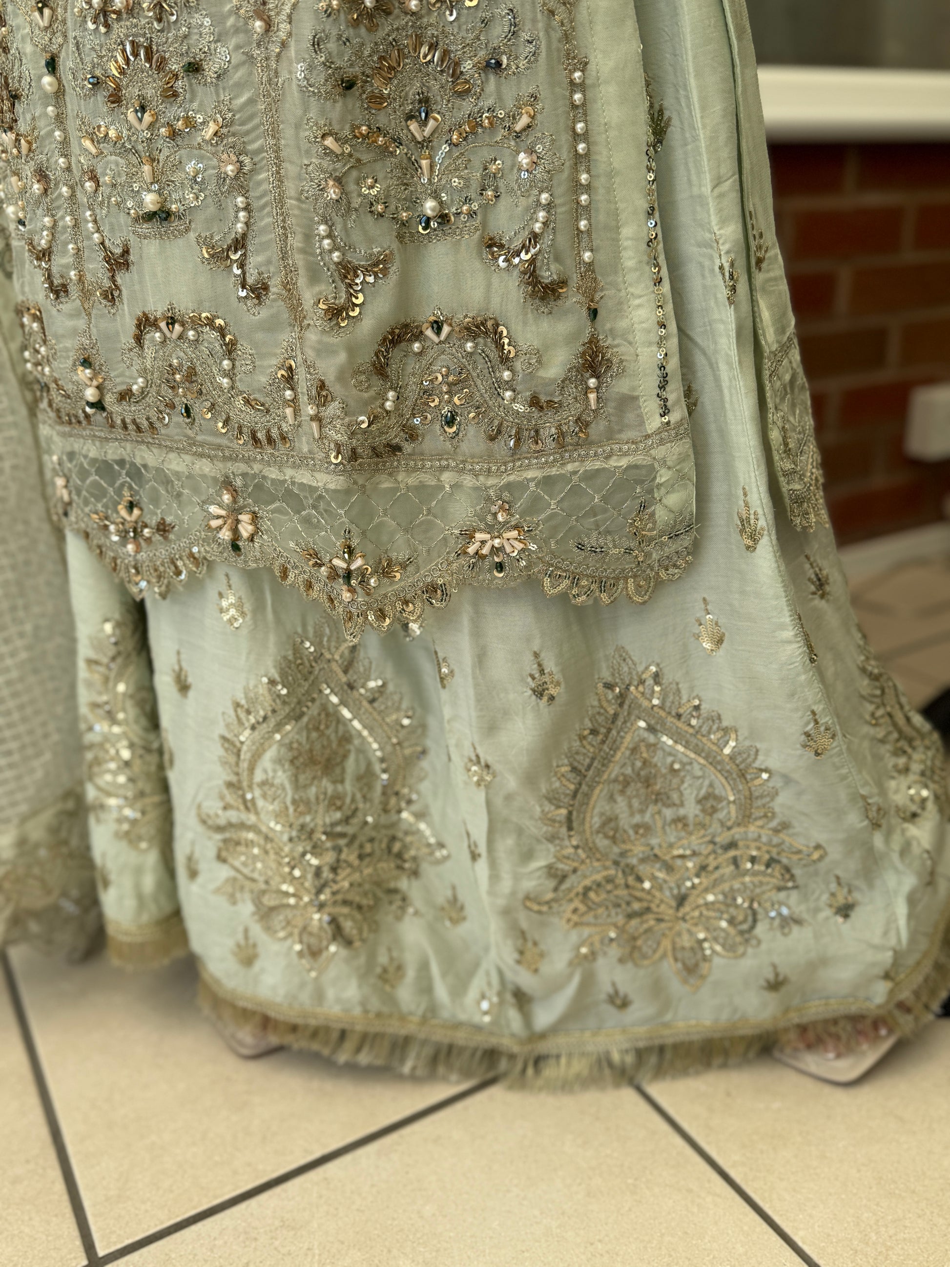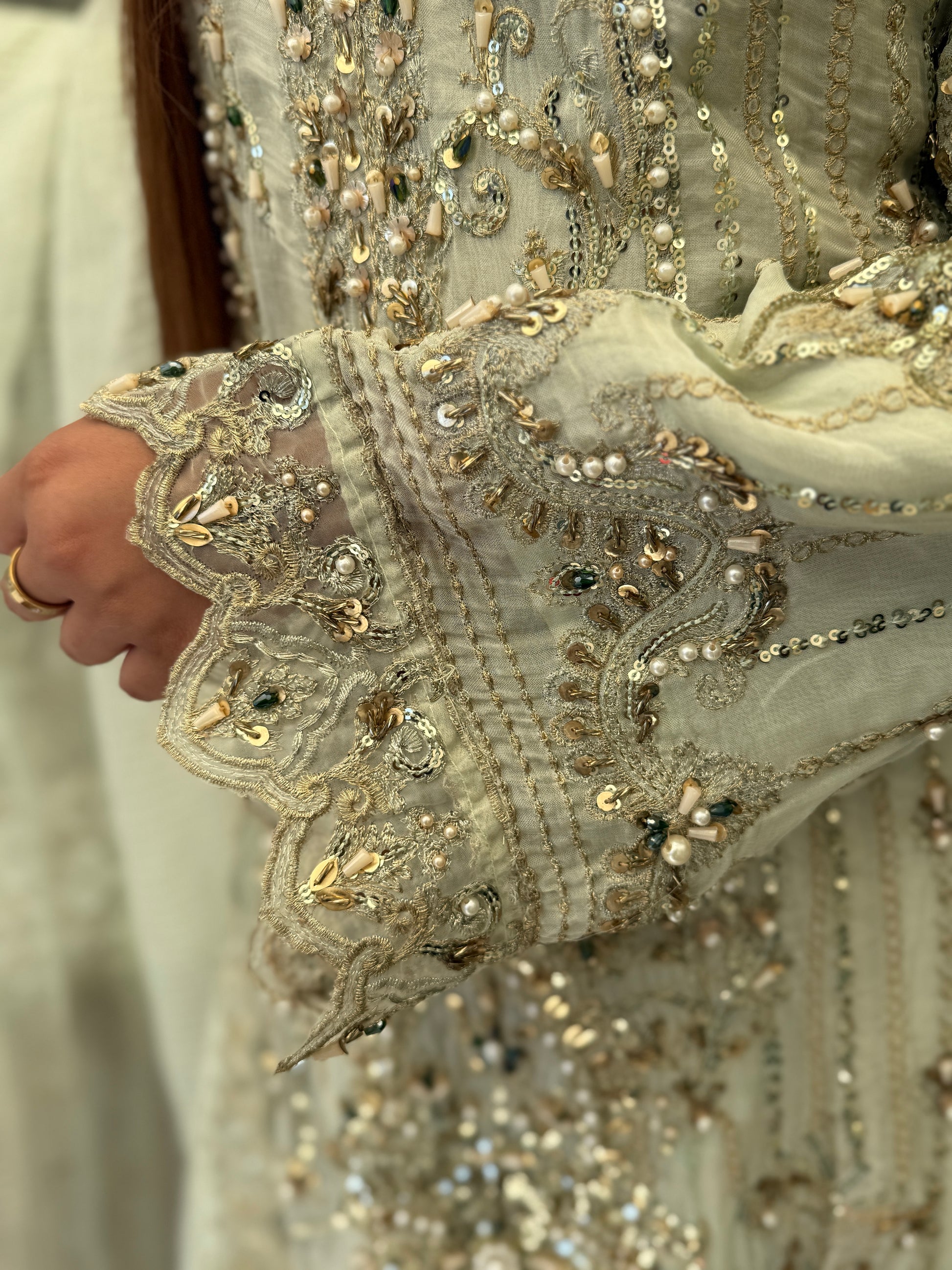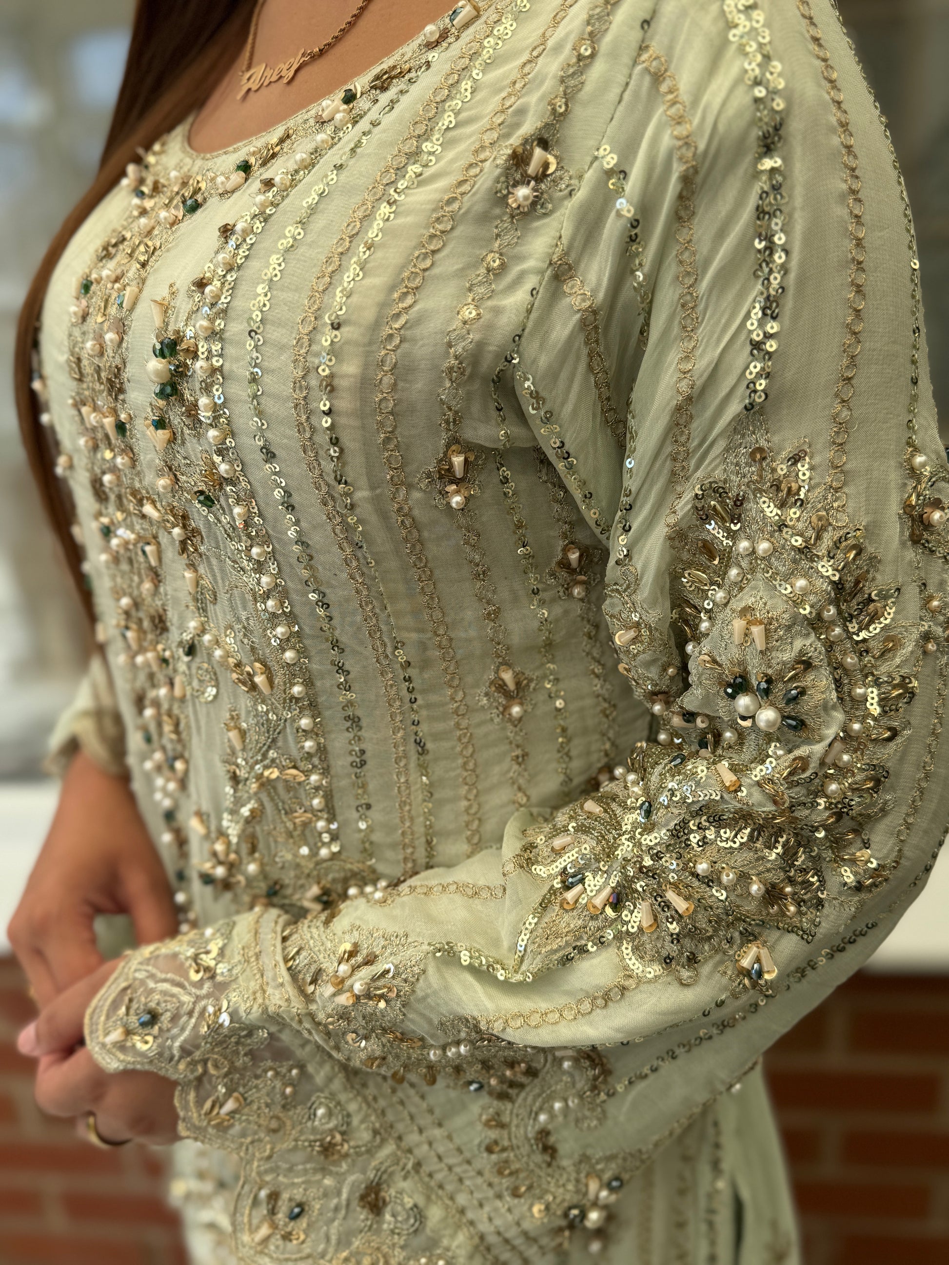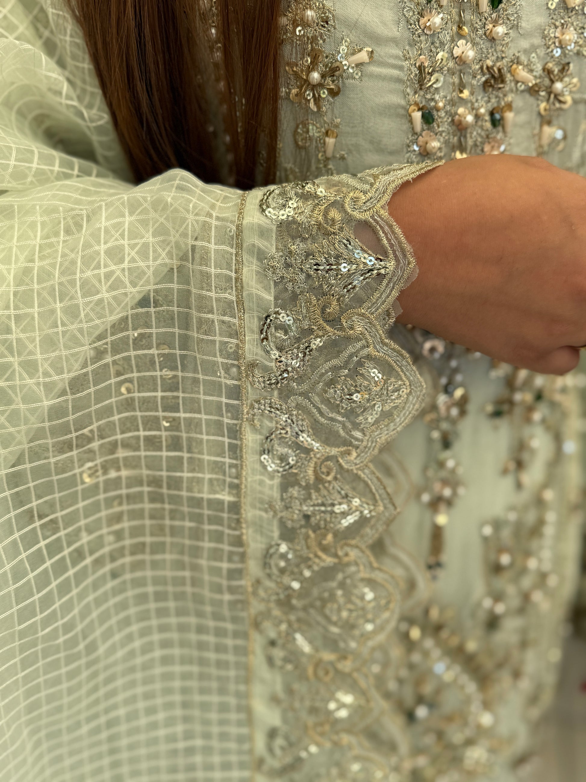 Turn heads in this breathtaking pastel sage ensemble, designed to embody grace and luxury. Fully hand-embellished with intricate zardozi, sequins, pearls, and beadwork, the long chiffon kameez creates a soft, flowing silhouette with ornate detailing from neckline to hem.