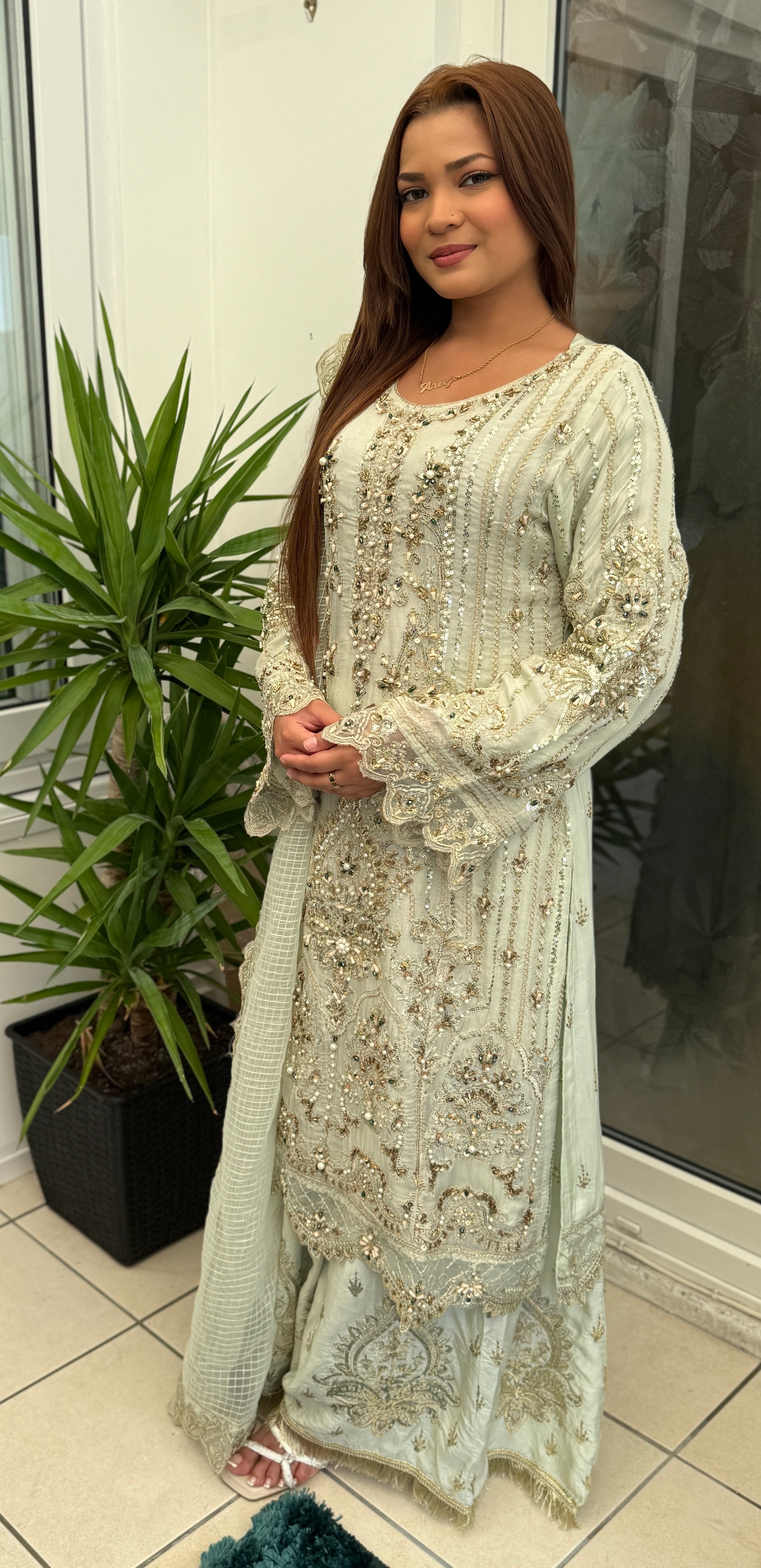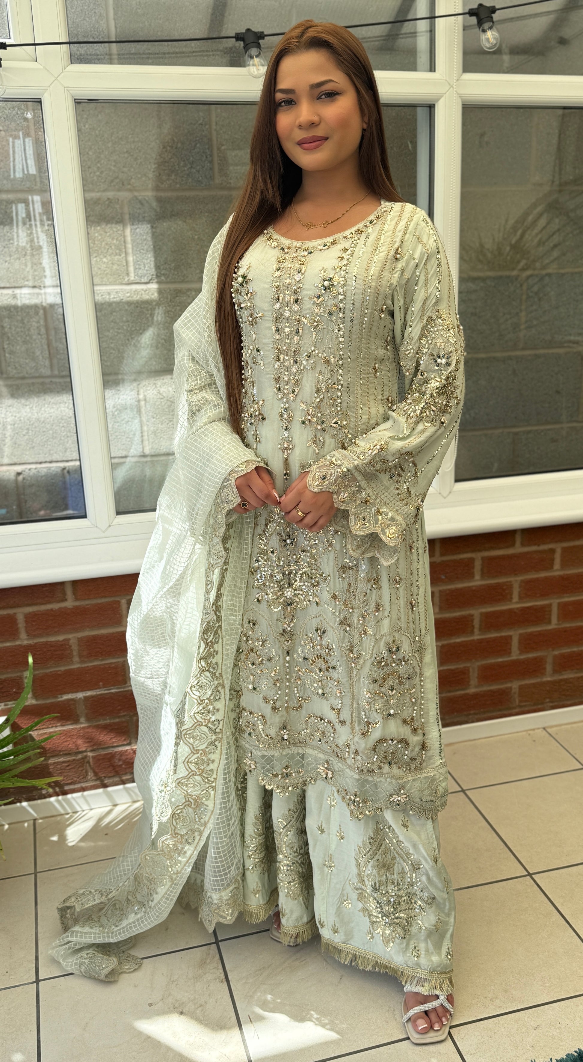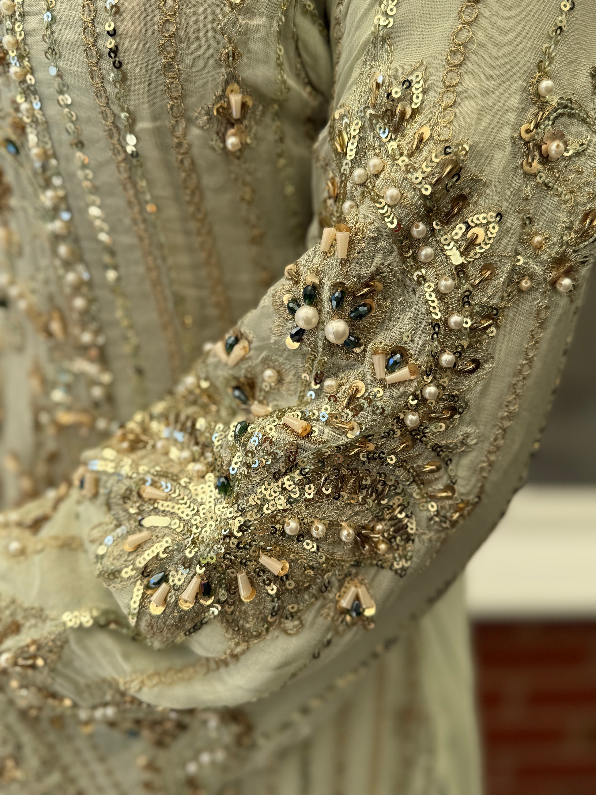 Turn heads in this breathtaking pastel sage ensemble, designed to embody grace and luxury. Fully hand-embellished with intricate zardozi, sequins, pearls, and beadwork, the long chiffon kameez creates a soft, flowing silhouette with ornate detailing from neckline to hem.