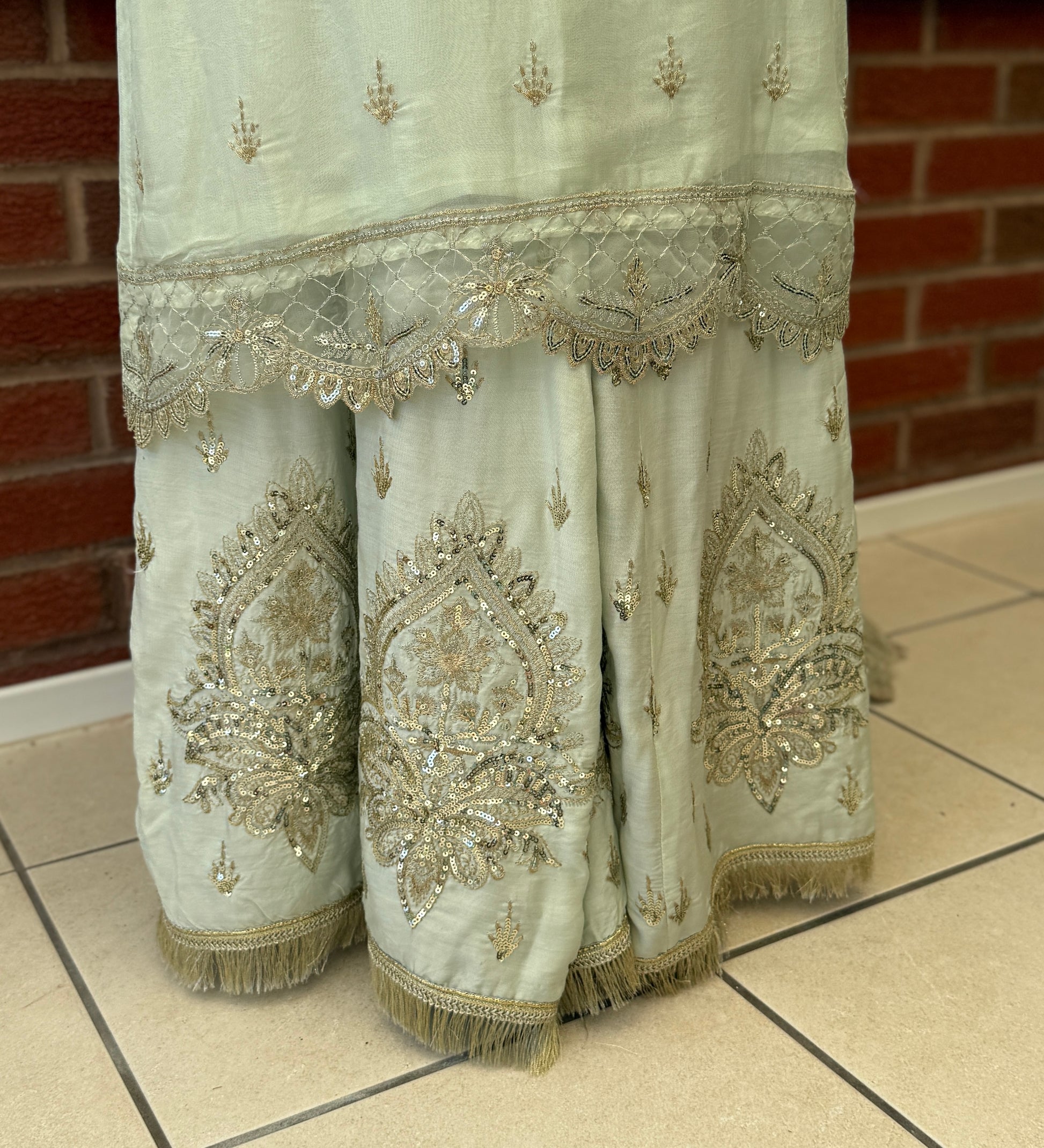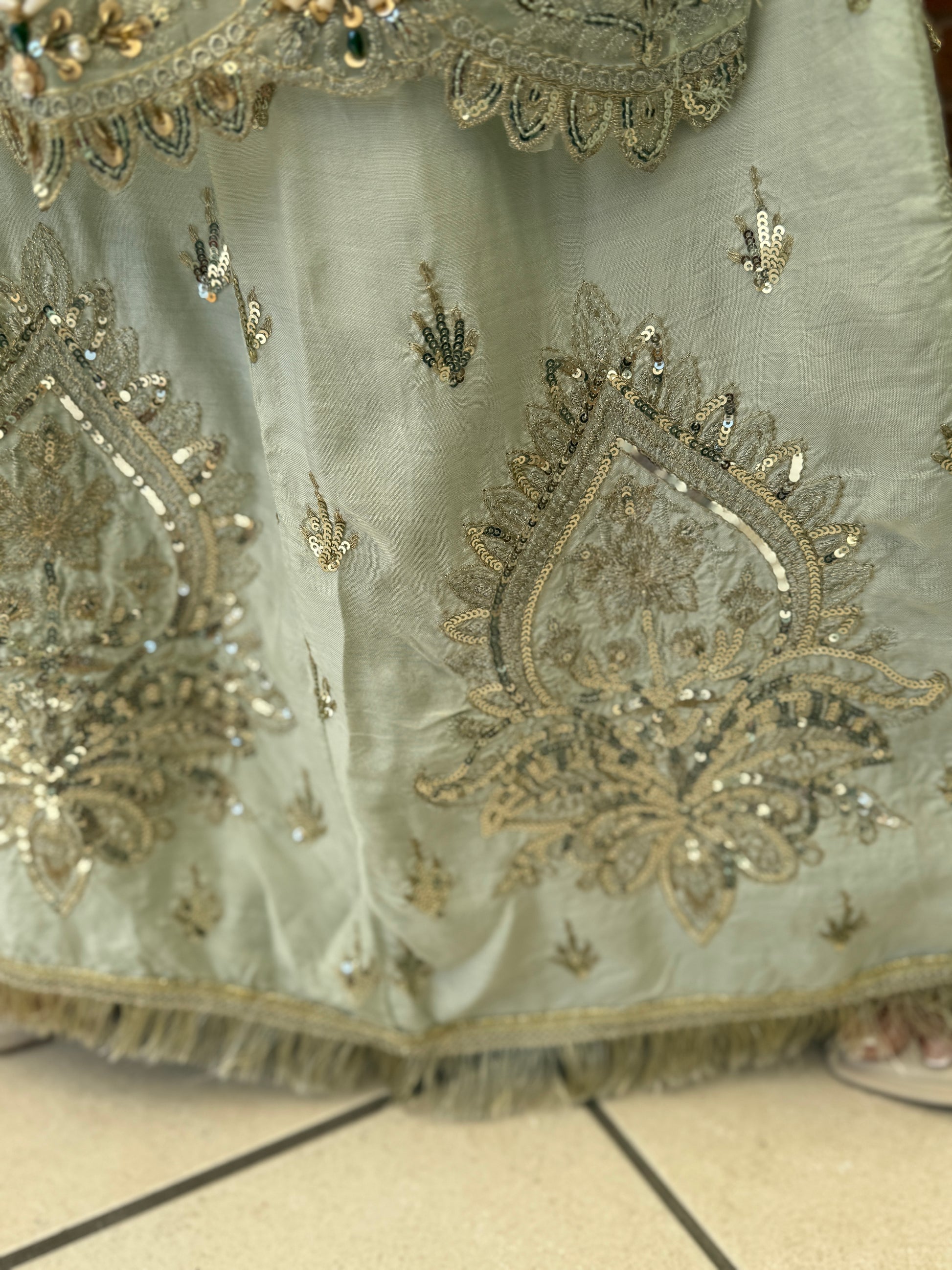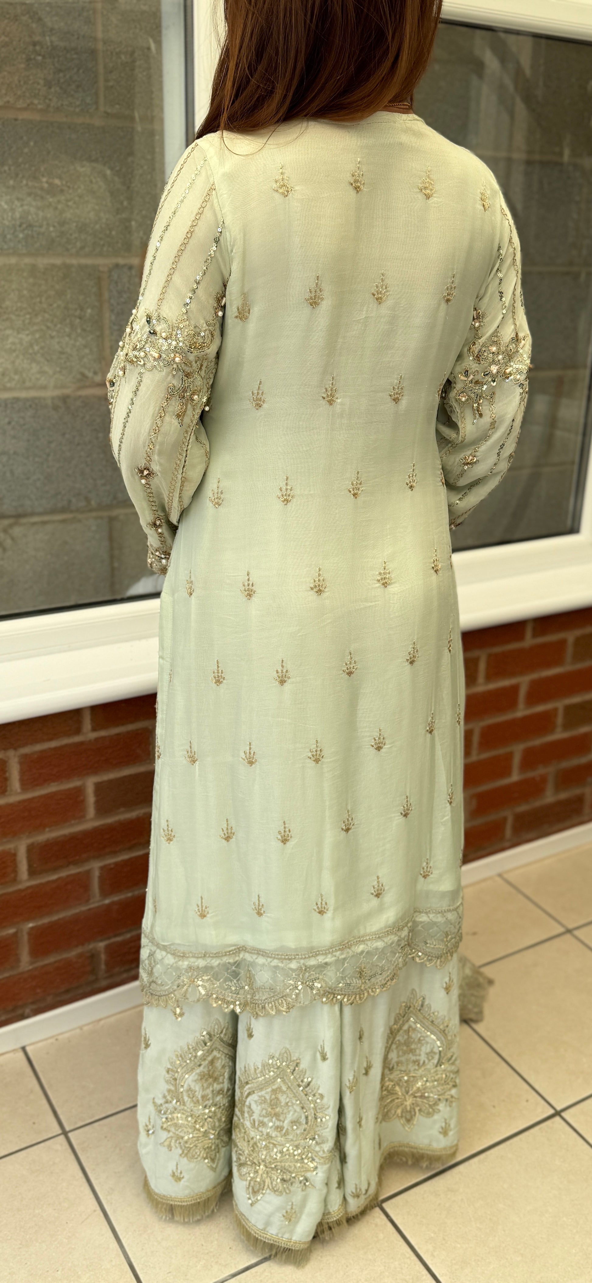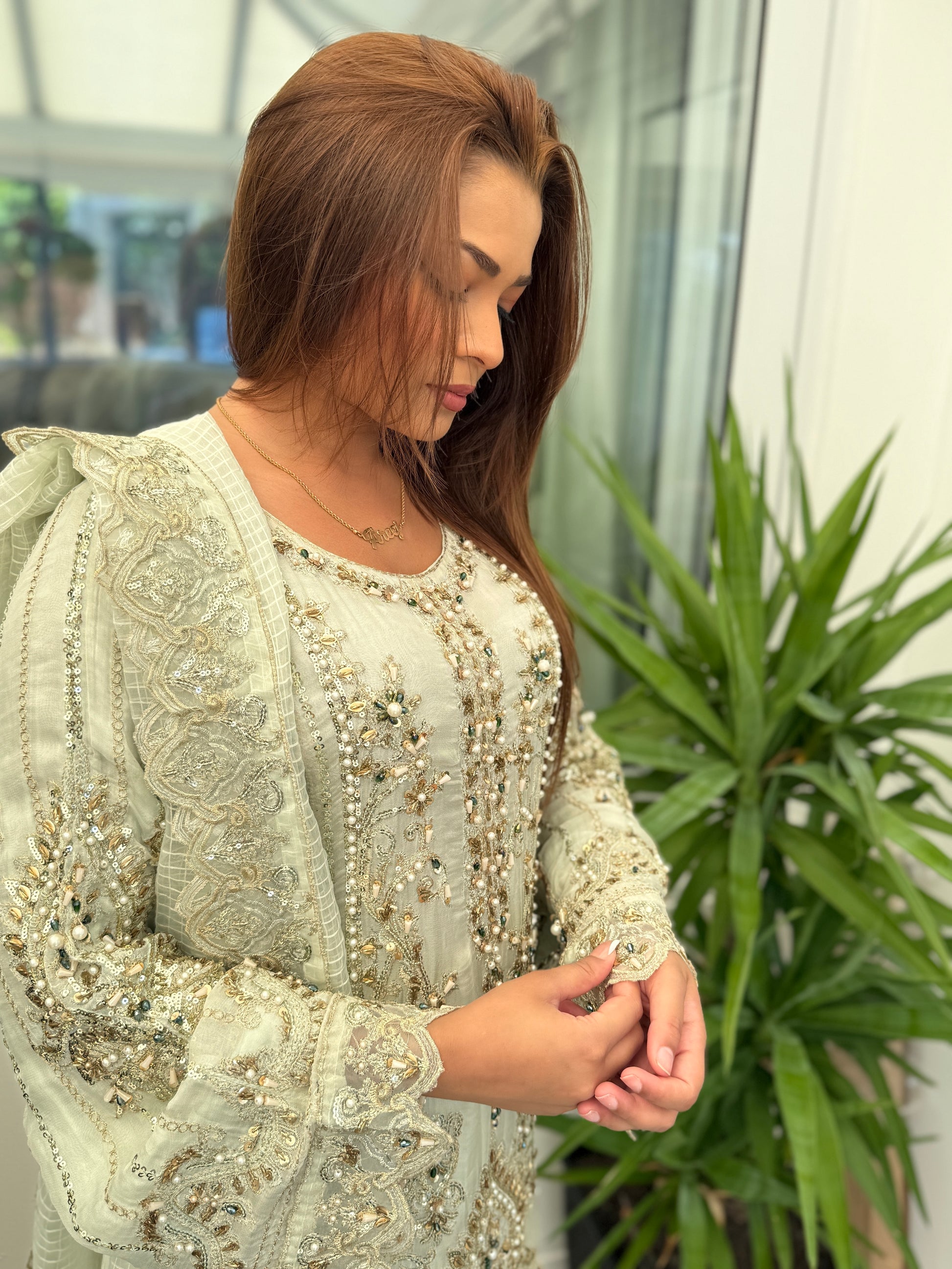 Turn heads in this breathtaking pastel sage ensemble, designed to embody grace and luxury. Fully hand-embellished with intricate zardozi, sequins, pearls, and beadwork, the long chiffon kameez creates a soft, flowing silhouette with ornate detailing from neckline to hem.