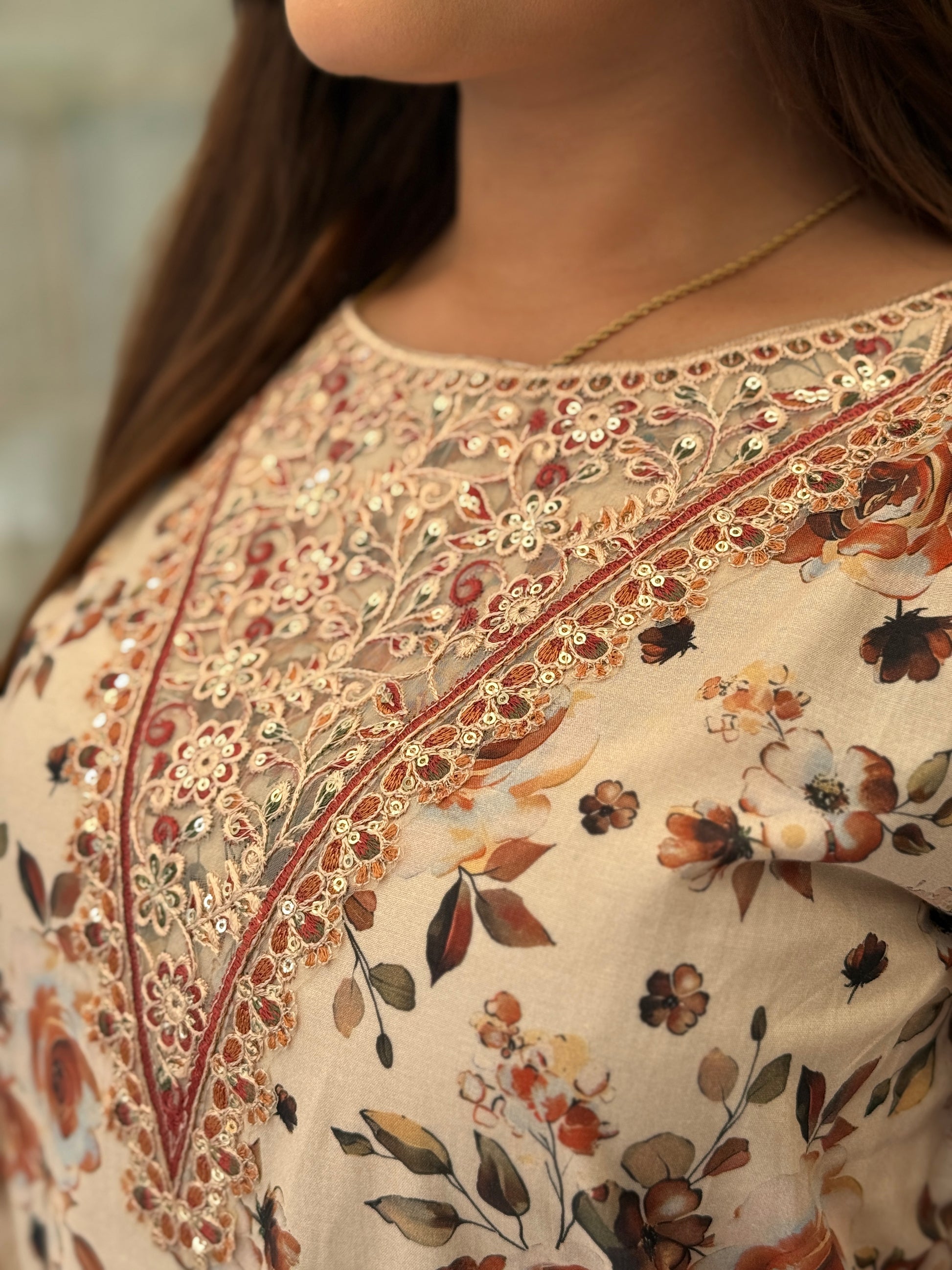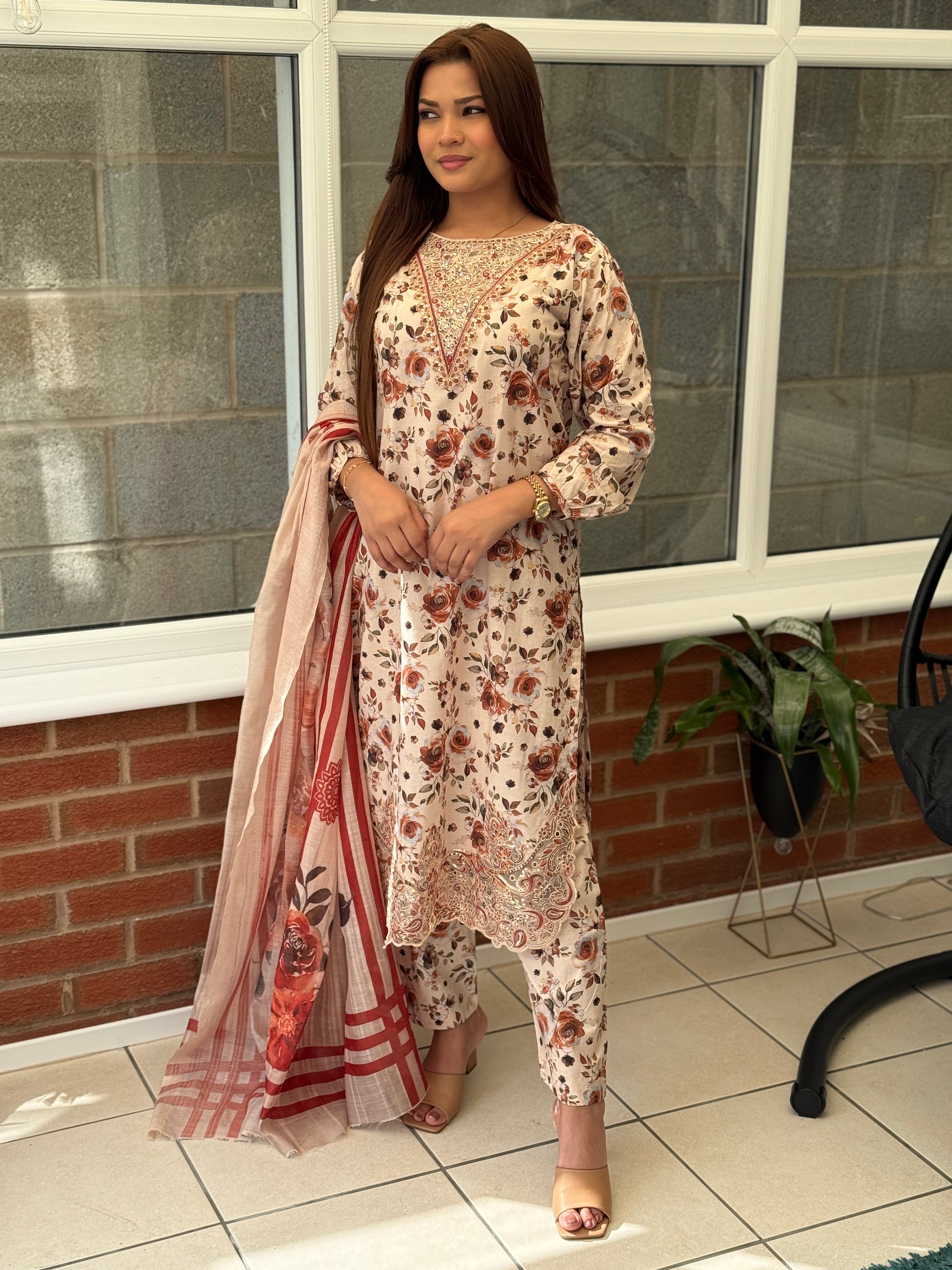 Rosette Bloom Lawn – A soft cream lawn three-piece brought to life with an all-over rose print in warm rust and cinnamon tones. The kameez features delicate thread embroidery along the neckline and hem, adding texture and refinement. Paired with matching printed trousers and a contrasting lawn dupatta with bold floral and check patterns, this suit blends comfort with elegance – perfect for casual chic days or semi-formal gatherings.