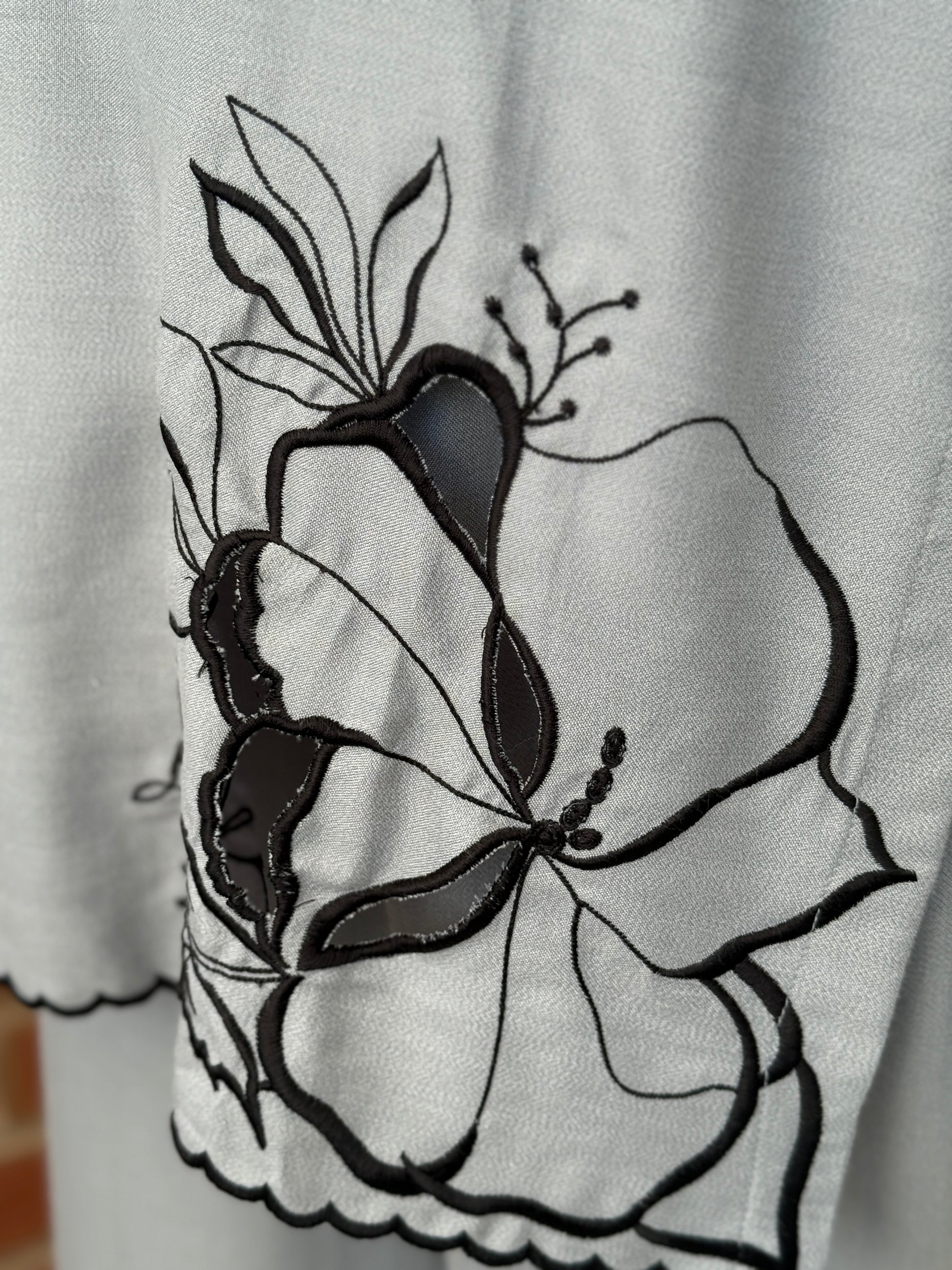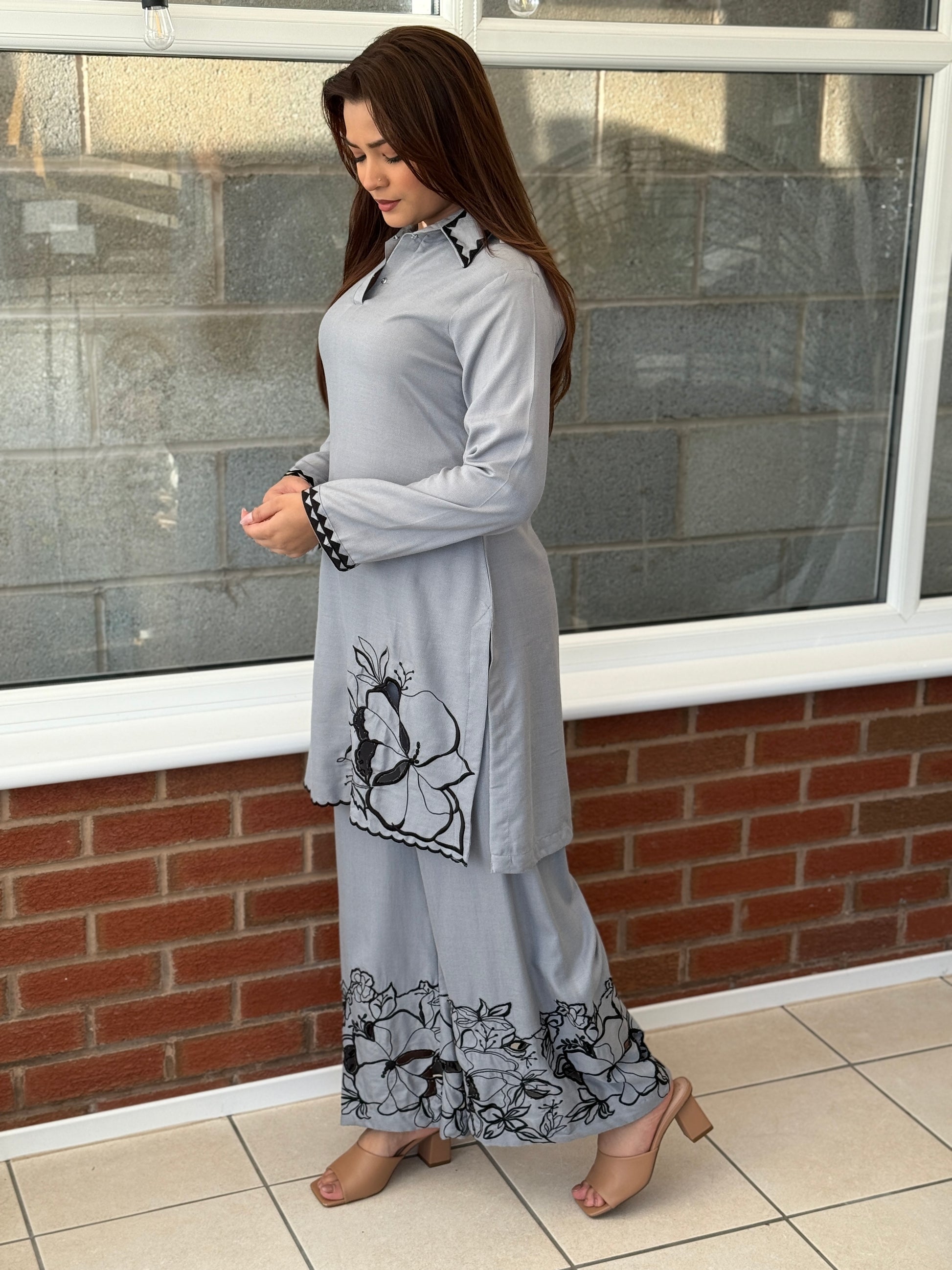 A cosy yet polished dhanak 2-piece for winter wear. Featuring a soft grey kurta with elegant black floral embroidery and cutwork detailing on the shirt daman and trousers, finished with contrast accents on the cuffs and hem. Paired with matching wide-leg trousers for a modest, comfortable fit.