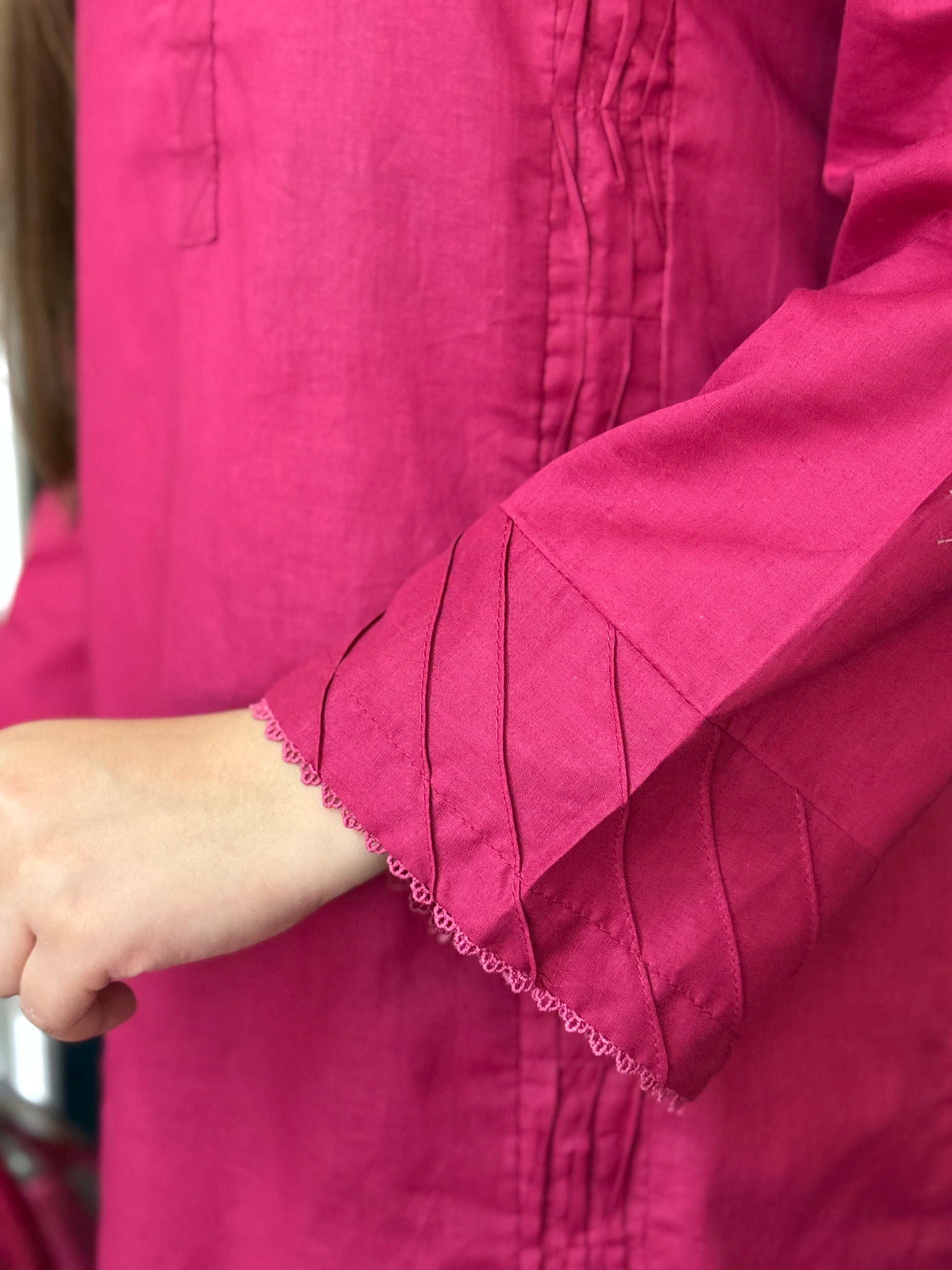 SHIRT HAS SIMPLE STITCHING DETAILING ALONG THE FRONT