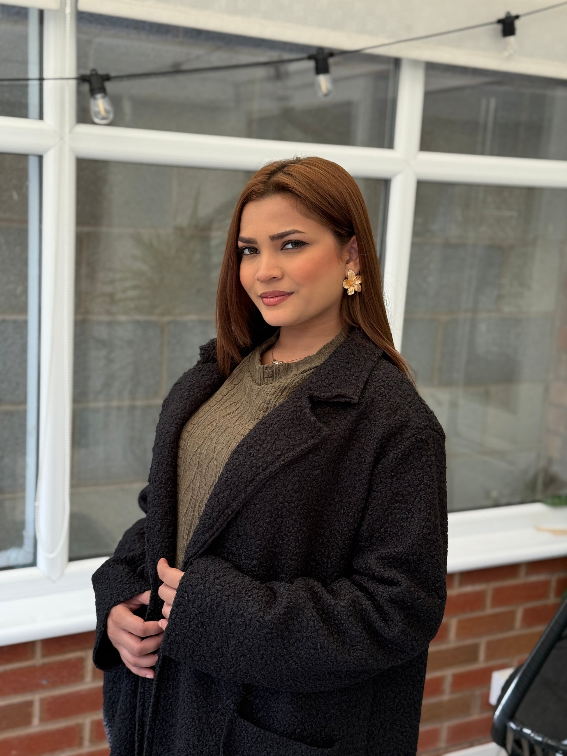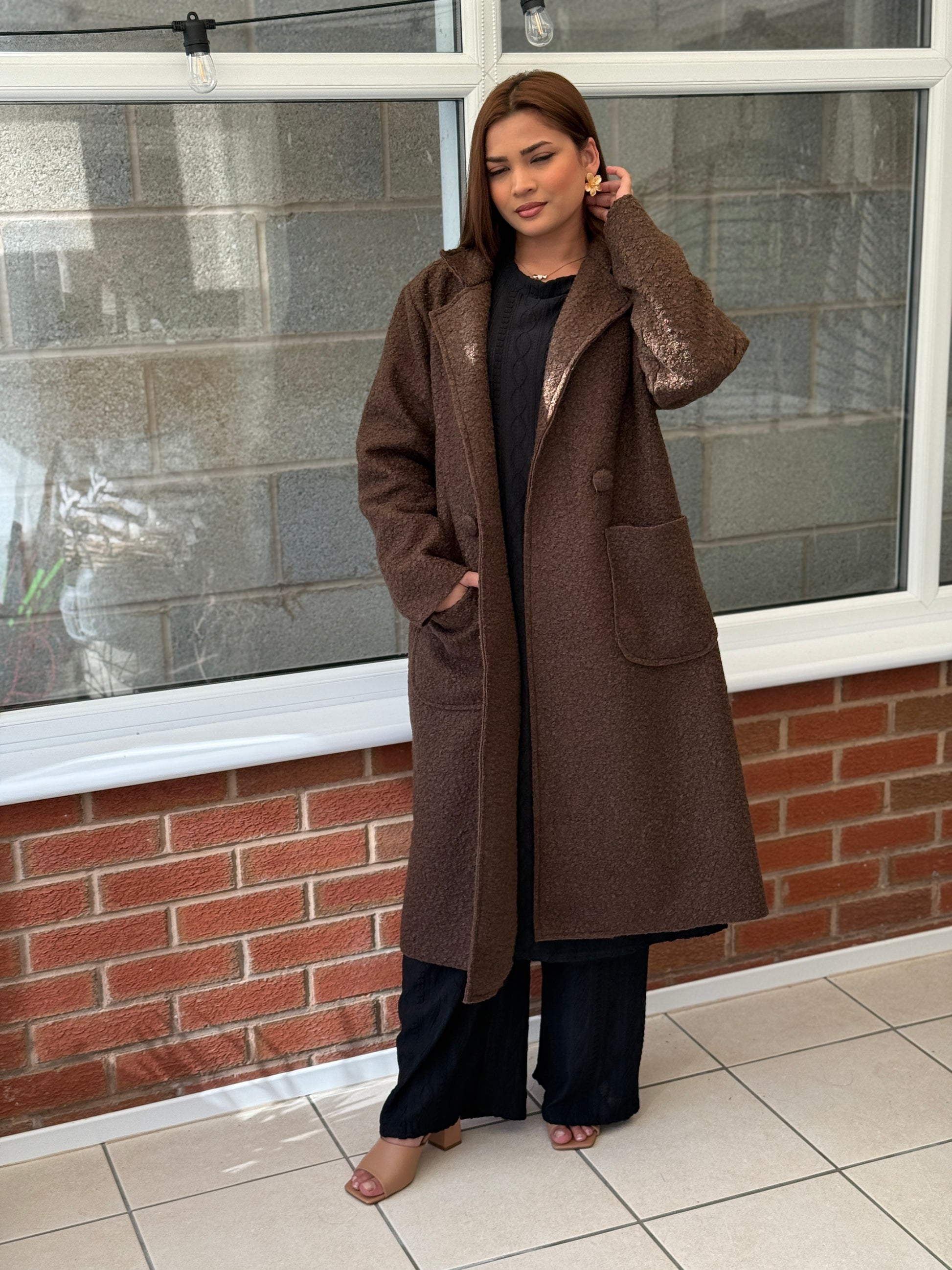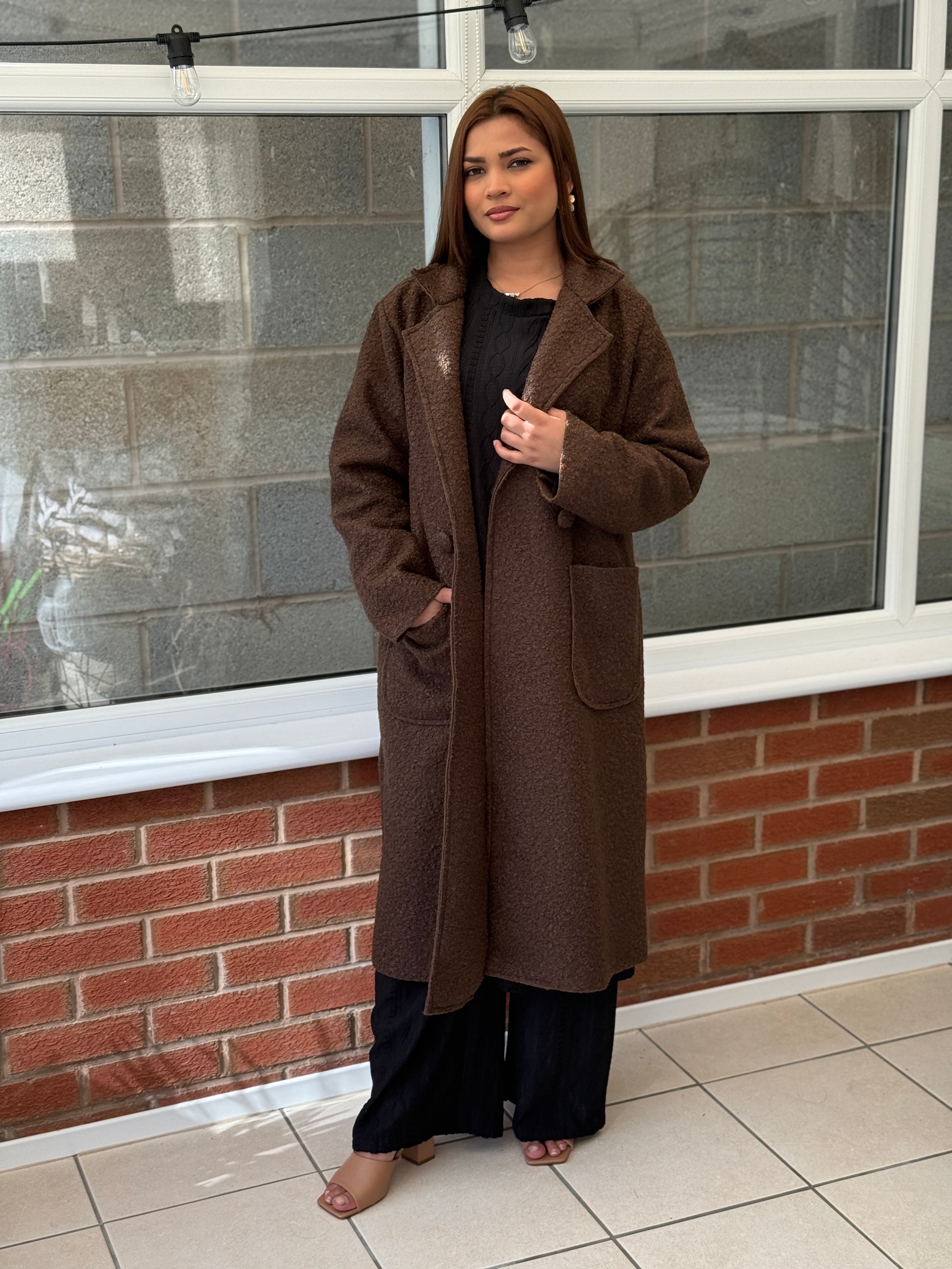Crafted in a rich mocha-brown shade, this longline coat is the ultimate layering piece for autumn and winter. The soft teddy texture gives it a luxe yet laid-back feel, while the oversized cut and deep front pockets make it as practical as it is chic.