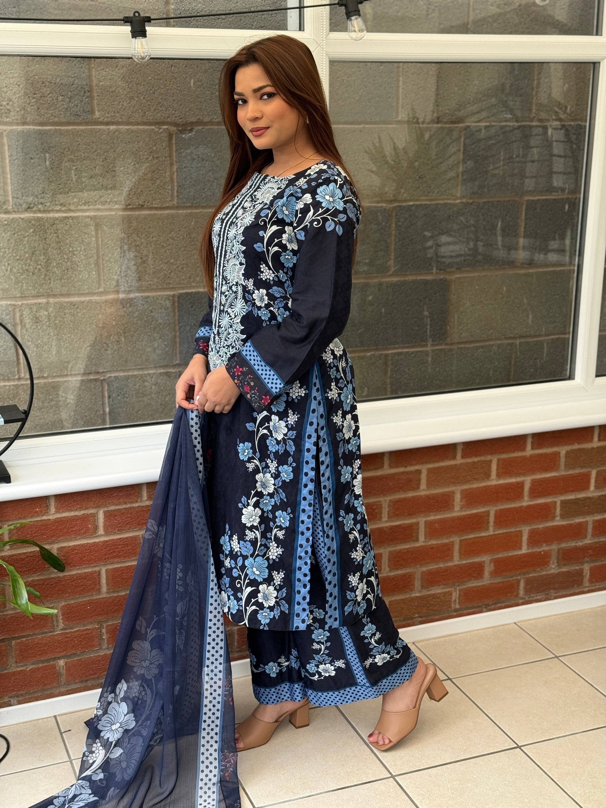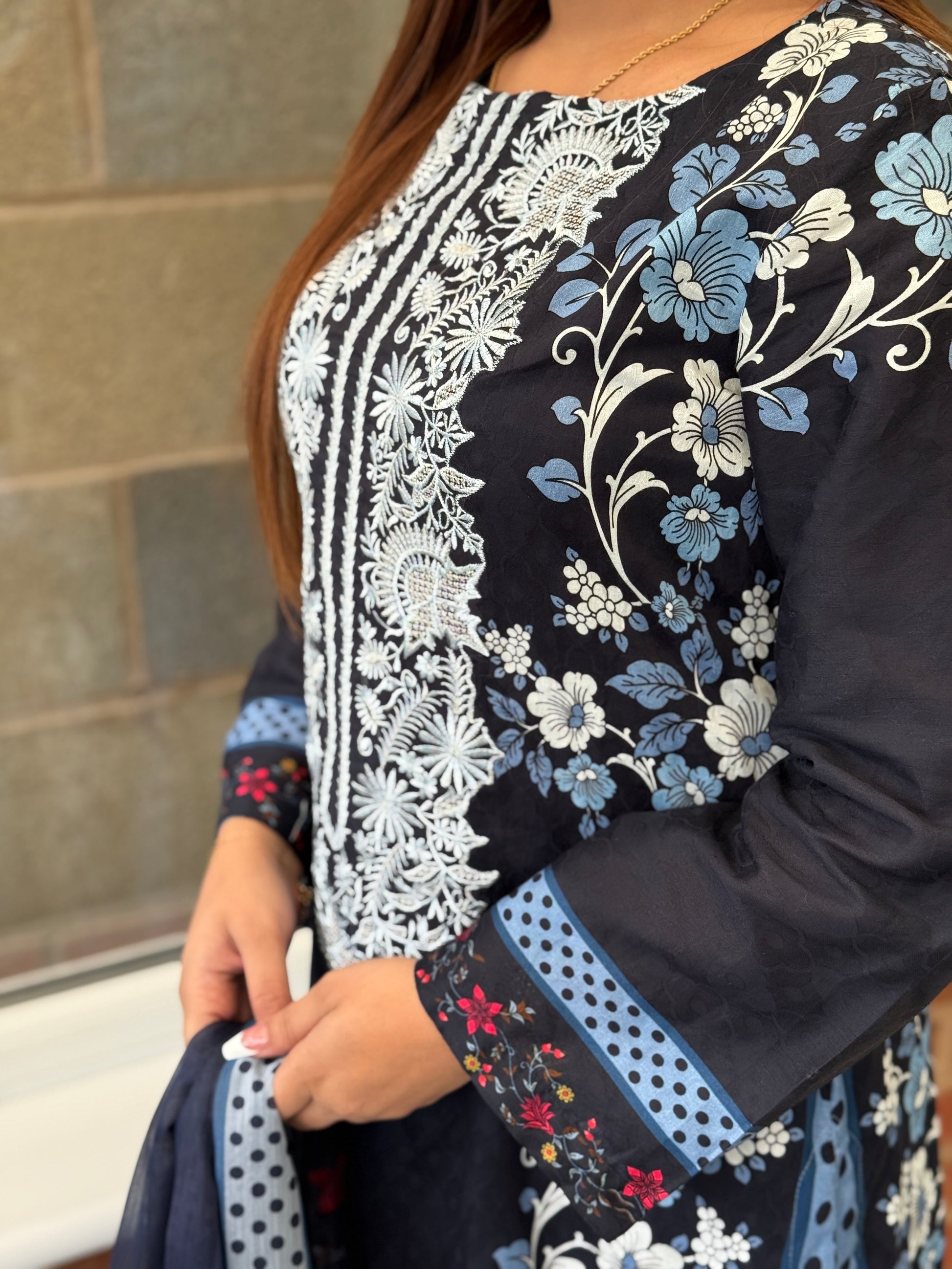 Deep navy lawn with an intricately embroidered neckline, paired with a soft printed chiffon dupatta. Light, graceful & made for everyday luxe. ✨